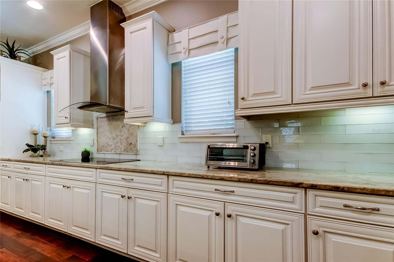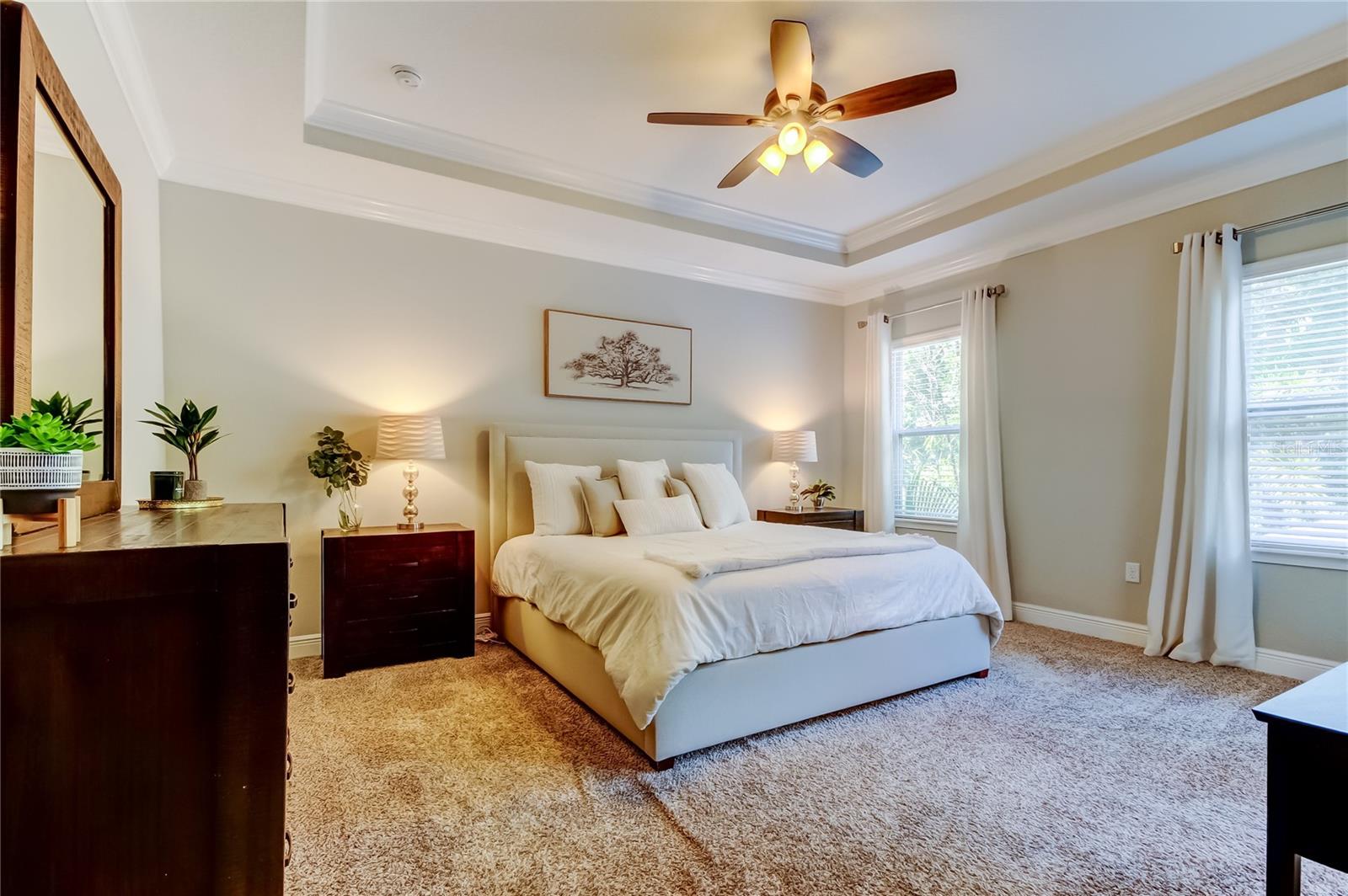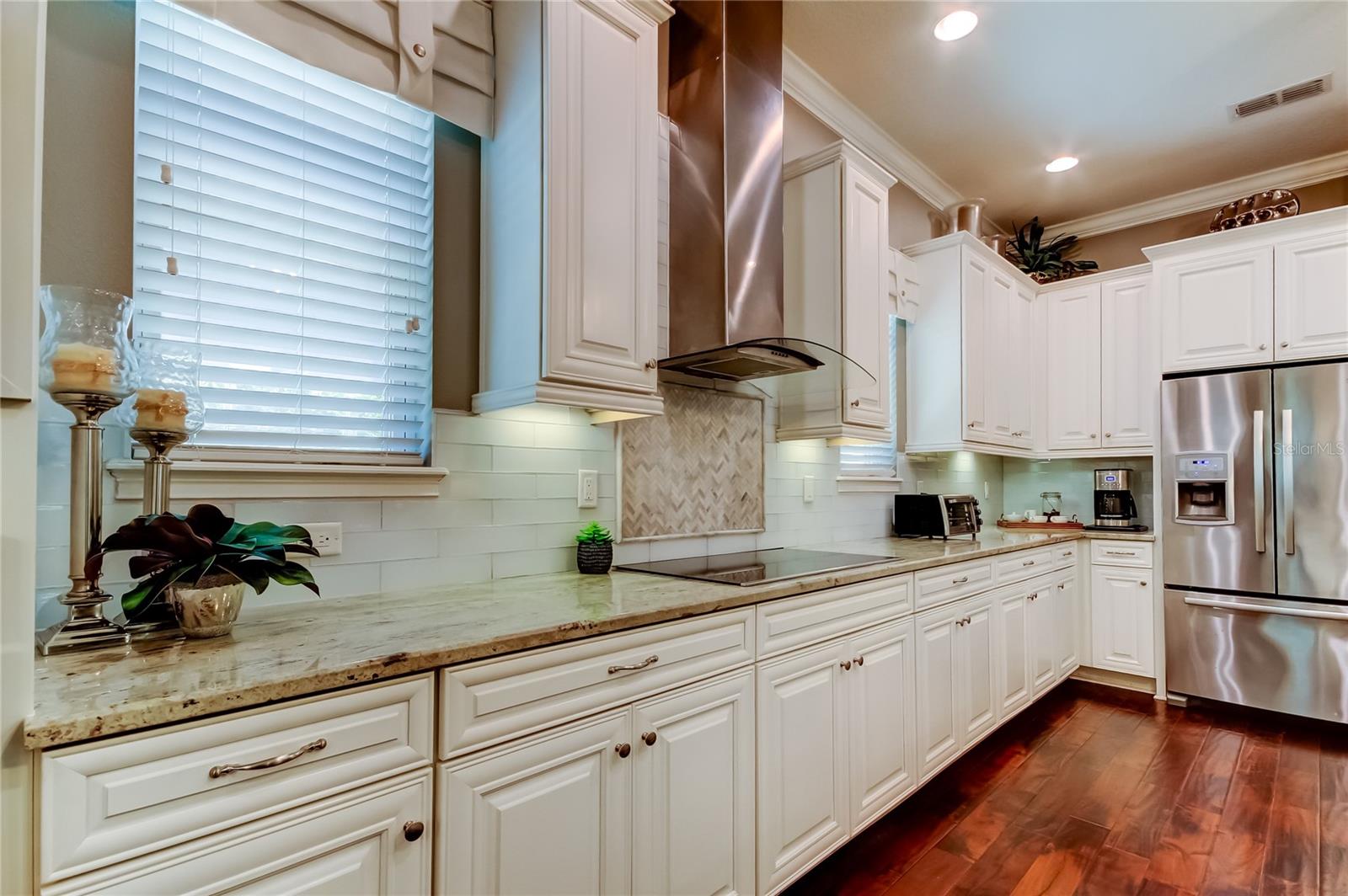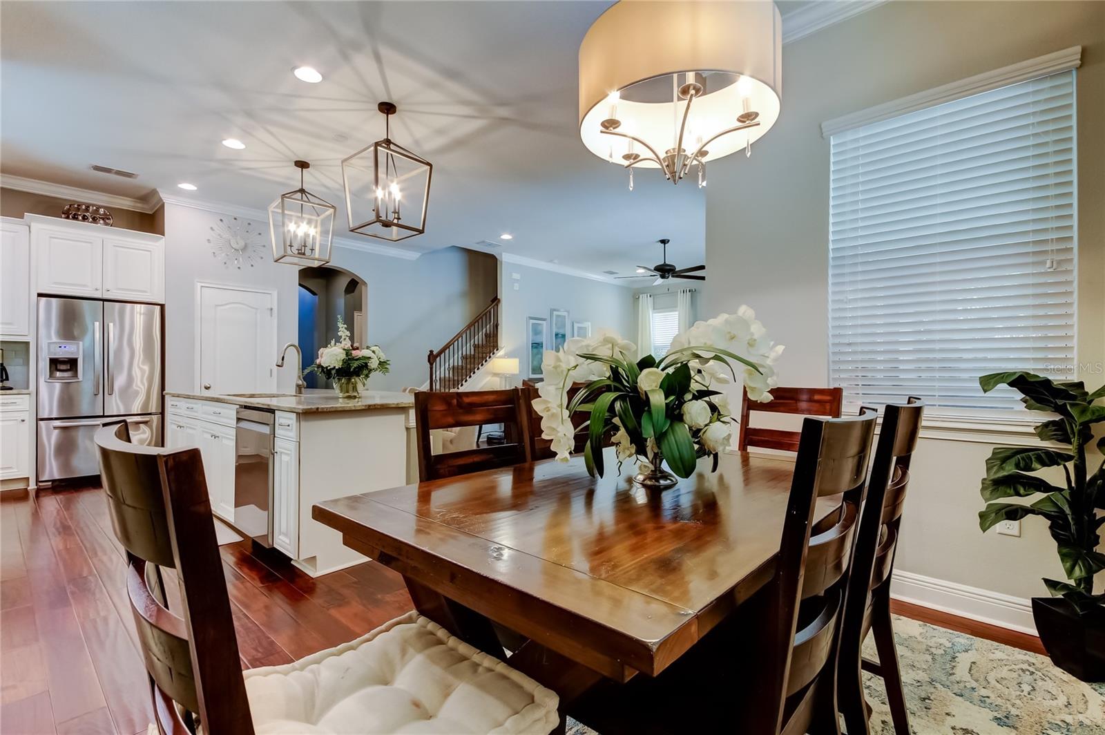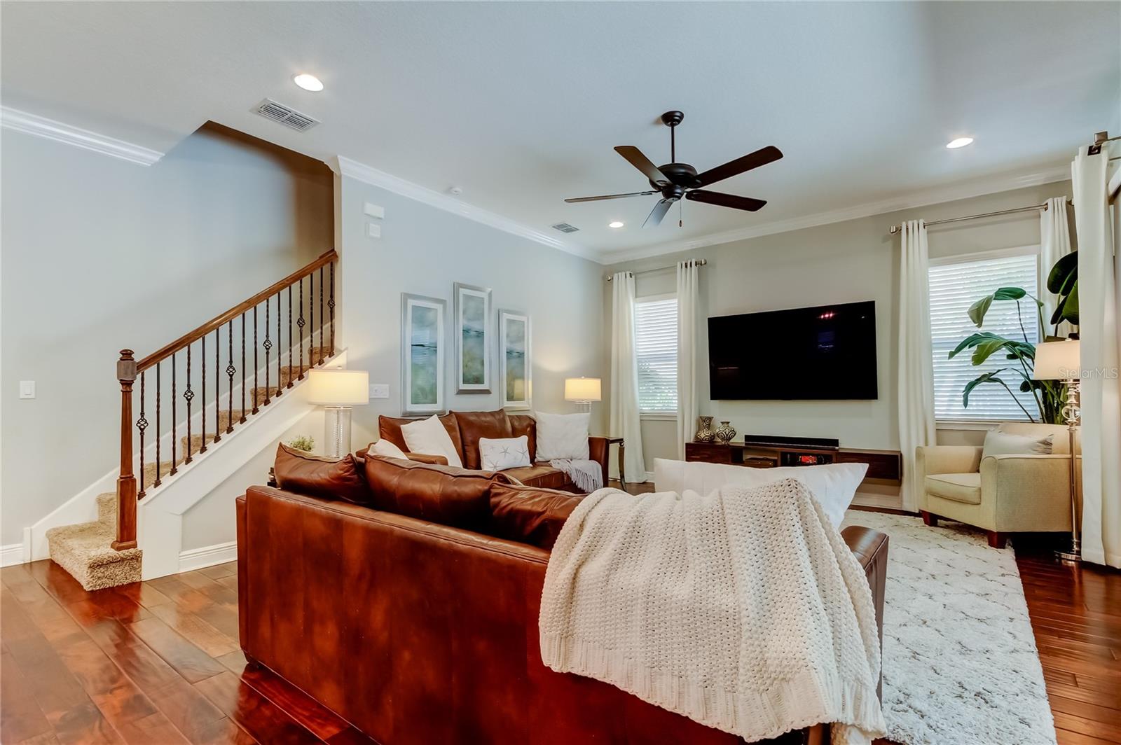 Welcome to this beautifully updated 4-bedroom, 3-bathroom pool home in the highly sought-after Champions Forest neighborhood. Set on a premium conservation lot, this home offers a functional layout, designer upgrades, and a tropical resort style backyard built for year-round Florida living. This home is truly turn-key and loaded with upgrades. Inside, you’ll find rich engineered hardwood floors, elegant crown molding, and upgraded light fixtures throughout the main level. The heart of the home is the gourmet kitchen, featuring a large granite island, 42” white wood cabinets with crown, glass tile backsplash, and a stunning mosaic marble accent under the custom range hood. Built-in stainless steel appliances include a wall oven, microwave, and sleek cooktop with hood. The first-floor bedroom and full bath are perfect for guests or multigenerational living, with a new vanity, upgraded walk-in shower, and wood-look tile finishes. Upstairs, the primary suite features a tray ceiling, crown molding, and a luxurious en-suite bath featuring new quartz vanity with dual sinks, walk-in shower, and a large walk-in closet. Two additional guest bedrooms share a full bath (also with new quartz vanity)—one with direct bathroom access—and a versatile bonus room provides the ideal space for an office, playroom, or second living area. Ceiling fans throughout add comfort and efficiency. Step outside to your tropical resort-style backyard with a heated saltwater pool, sun shelf with bubbler, and travertine decking. The panoramic screen enclosure includes no-see-um screening and a dog door for convenience. The extended lanai, tropical landscaping, outdoor lighting, and French drain system create a relaxing and private outdoor oasis. Located minutes from great rated schools, parks, biking trails, Westchase, shopping, dining, the YMCA, and just 15 minutes to Tampa International Airport and 20 minutes to the Gulf beaches—this home blends luxury, function, and location.