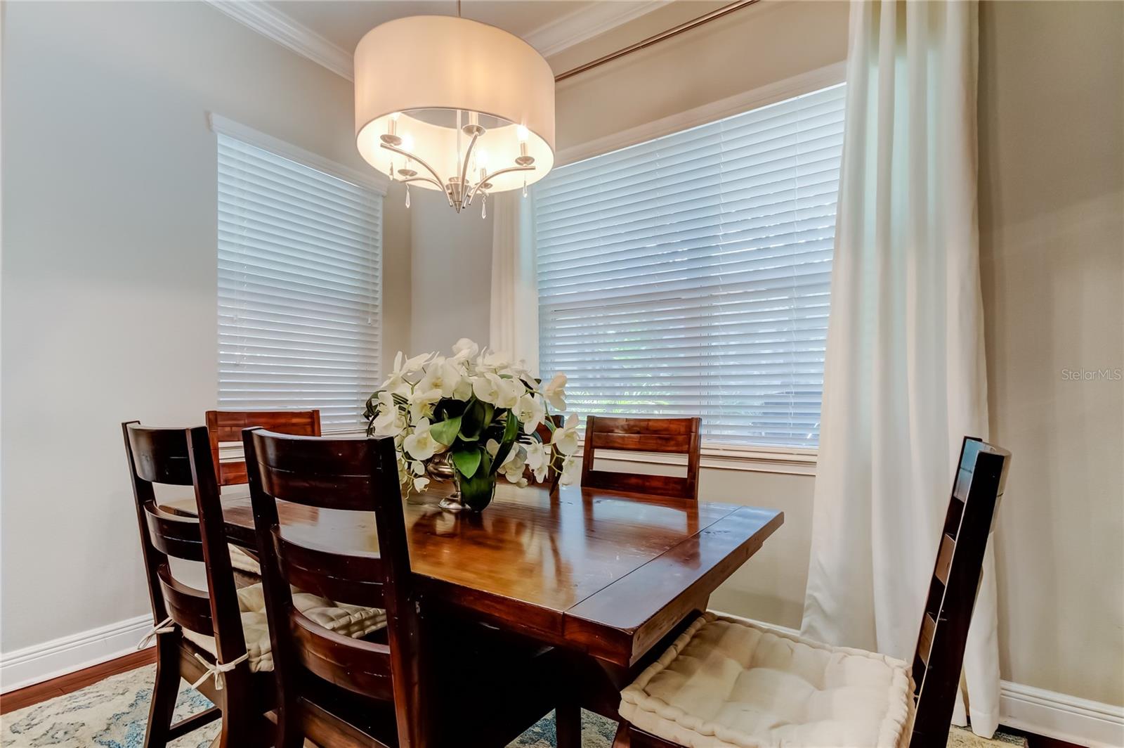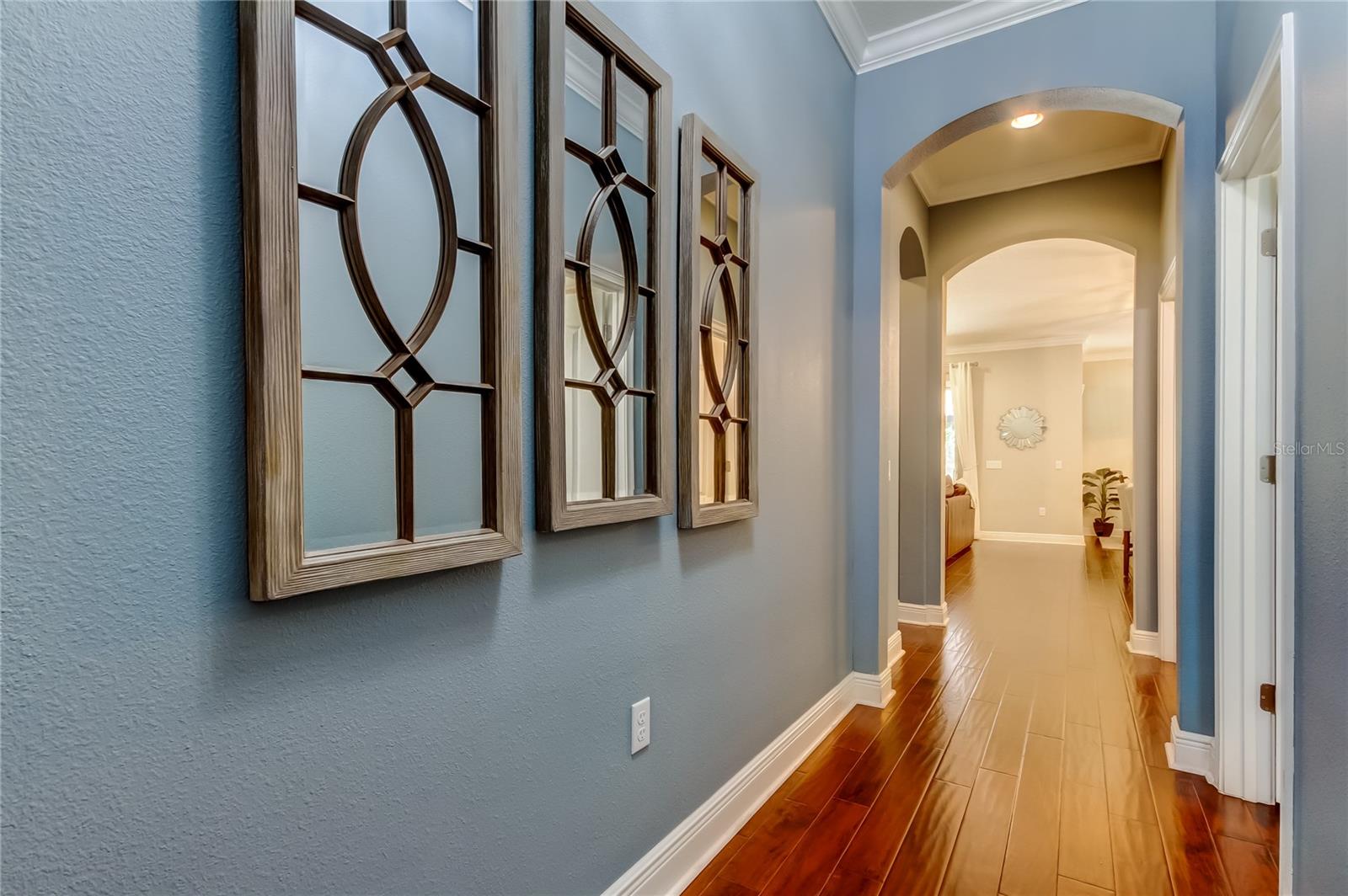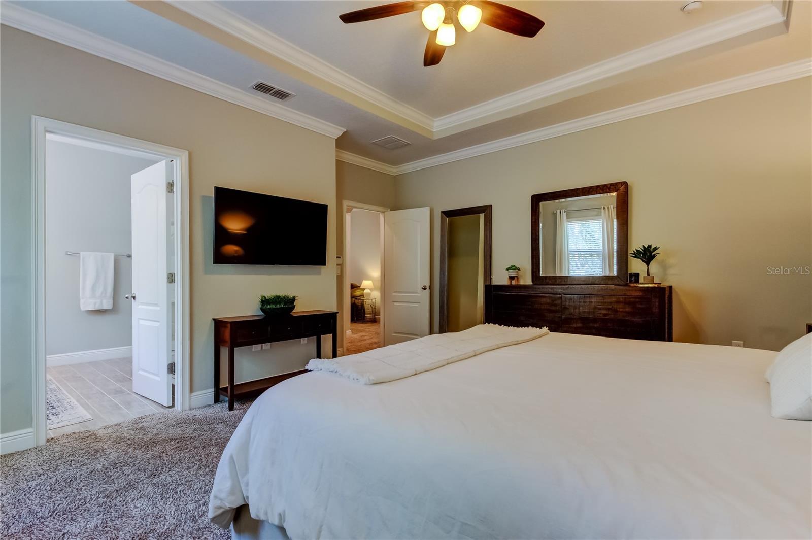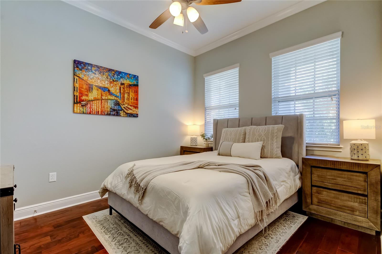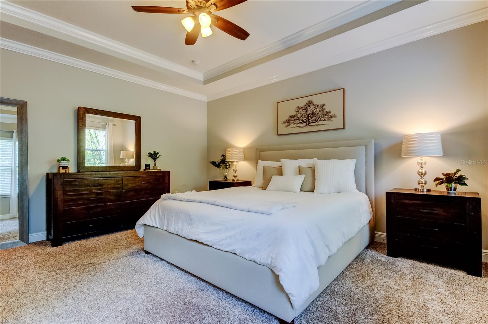 Welcome to this beautifully updated 4-bedroom, 3-bathroom pool home in the highly sought-after Champions Forest neighborhood. Set on a premium conservation lot, this home offers a functional layout, designer upgrades, and a tropical resort style backyard built for year-round Florida living. This home is truly turn-key and loaded with upgrades. Inside, you’ll find rich engineered hardwood floors, elegant crown molding, and upgraded light fixtures throughout the main level. The heart of the home is the gourmet kitchen, featuring a large granite island, 42” white wood cabinets with crown, glass tile backsplash, and a stunning mosaic marble accent under the custom range hood. Built-in stainless steel appliances include a wall oven, microwave, and sleek cooktop with hood. The first-floor bedroom and full bath are perfect for guests or multigenerational living, with a new vanity, upgraded walk-in shower, and wood-look tile finishes. Upstairs, the primary suite features a tray ceiling, crown molding, and a luxurious en-suite bath featuring new quartz vanity with dual sinks, walk-in shower, and a large walk-in closet. Two additional guest bedrooms share a full bath (also with new quartz vanity)—one with direct bathroom access—and a versatile bonus room provides the ideal space for an office, playroom, or second living area. Ceiling fans throughout add comfort and efficiency. Step outside to your tropical resort-style backyard with a heated saltwater pool, sun shelf with bubbler, and travertine decking. The panoramic screen enclosure includes no-see-um screening and a dog door for convenience. The extended lanai, tropical landscaping, outdoor lighting, and French drain system create a relaxing and private outdoor oasis. Located minutes from great rated schools, parks, biking trails, Westchase, shopping, dining, the YMCA, and just 15 minutes to Tampa International Airport and 20 minutes to the Gulf beaches—this home blends luxury, function, and location.