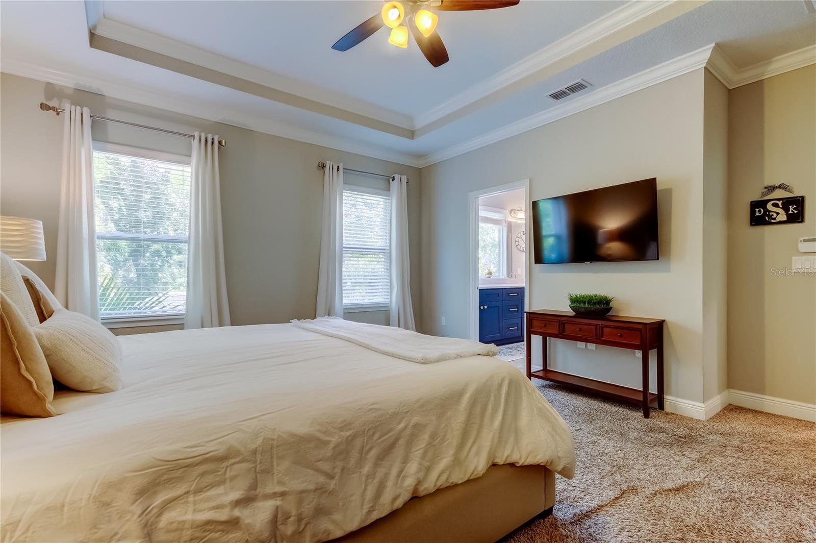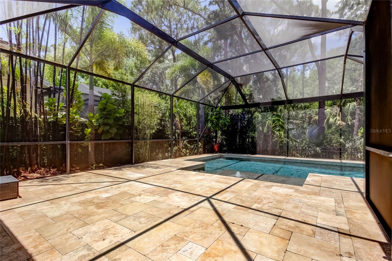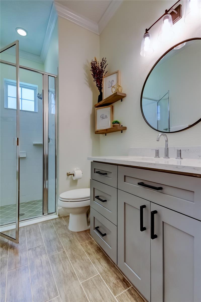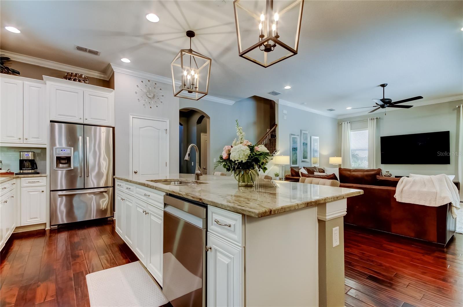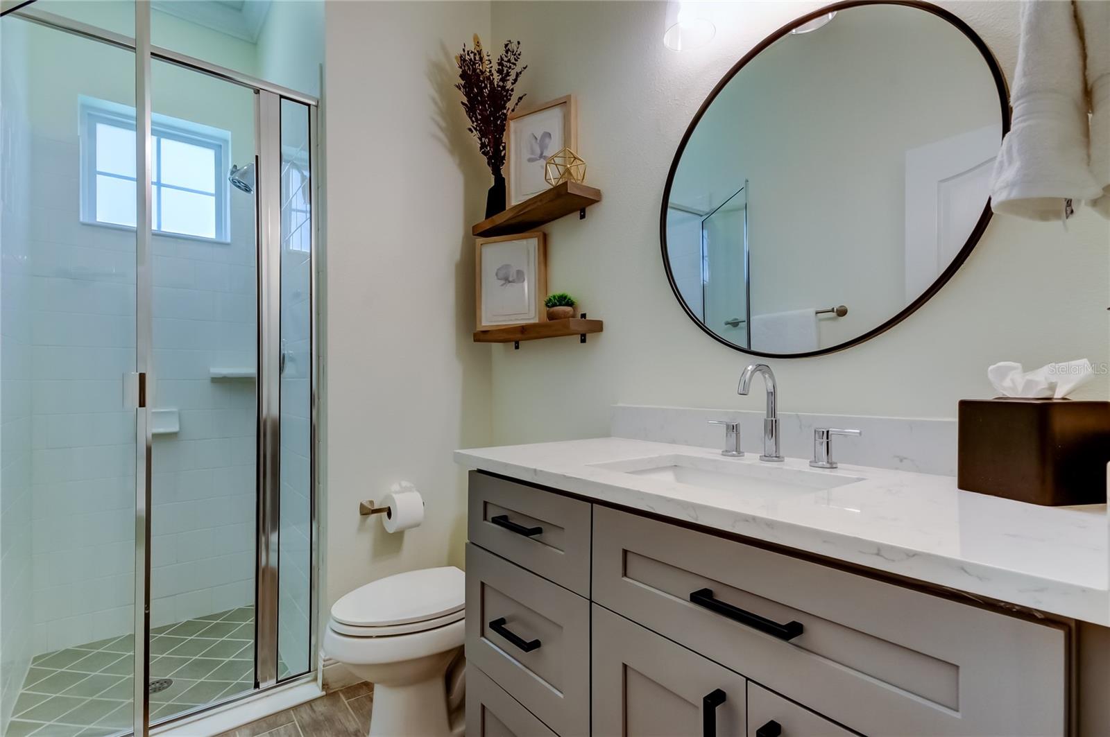 Welcome to this beautifully updated 4-bedroom, 3-bathroom pool home in the highly sought-after Champions Forest neighborhood. Set on a premium conservation lot, this home offers a functional layout, designer upgrades, and a tropical resort style backyard built for year-round Florida living. This home is truly turn-key and loaded with upgrades. Inside, you’ll find rich engineered hardwood floors, elegant crown molding, and upgraded light fixtures throughout the main level. The heart of the home is the gourmet kitchen, featuring a large granite island, 42” white wood cabinets with crown, glass tile backsplash, and a stunning mosaic marble accent under the custom range hood. Built-in stainless steel appliances include a wall oven, microwave, and sleek cooktop with hood. The first-floor bedroom and full bath are perfect for guests or multigenerational living, with a new vanity, upgraded walk-in shower, and wood-look tile finishes. Upstairs, the primary suite features a tray ceiling, crown molding, and a luxurious en-suite bath featuring new quartz vanity with dual sinks, walk-in shower, and a large walk-in closet. Two additional guest bedrooms share a full bath (also with new quartz vanity)—one with direct bathroom access—and a versatile bonus room provides the ideal space for an office, playroom, or second living area. Ceiling fans throughout add comfort and efficiency. Step outside to your tropical resort-style backyard with a heated saltwater pool, sun shelf with bubbler, and travertine decking. The panoramic screen enclosure includes no-see-um screening and a dog door for convenience. The extended lanai, tropical landscaping, outdoor lighting, and French drain system create a relaxing and private outdoor oasis. Located minutes from great rated schools, parks, biking trails, Westchase, shopping, dining, the YMCA, and just 15 minutes to Tampa International Airport and 20 minutes to the Gulf beaches—this home blends luxury, function, and location.