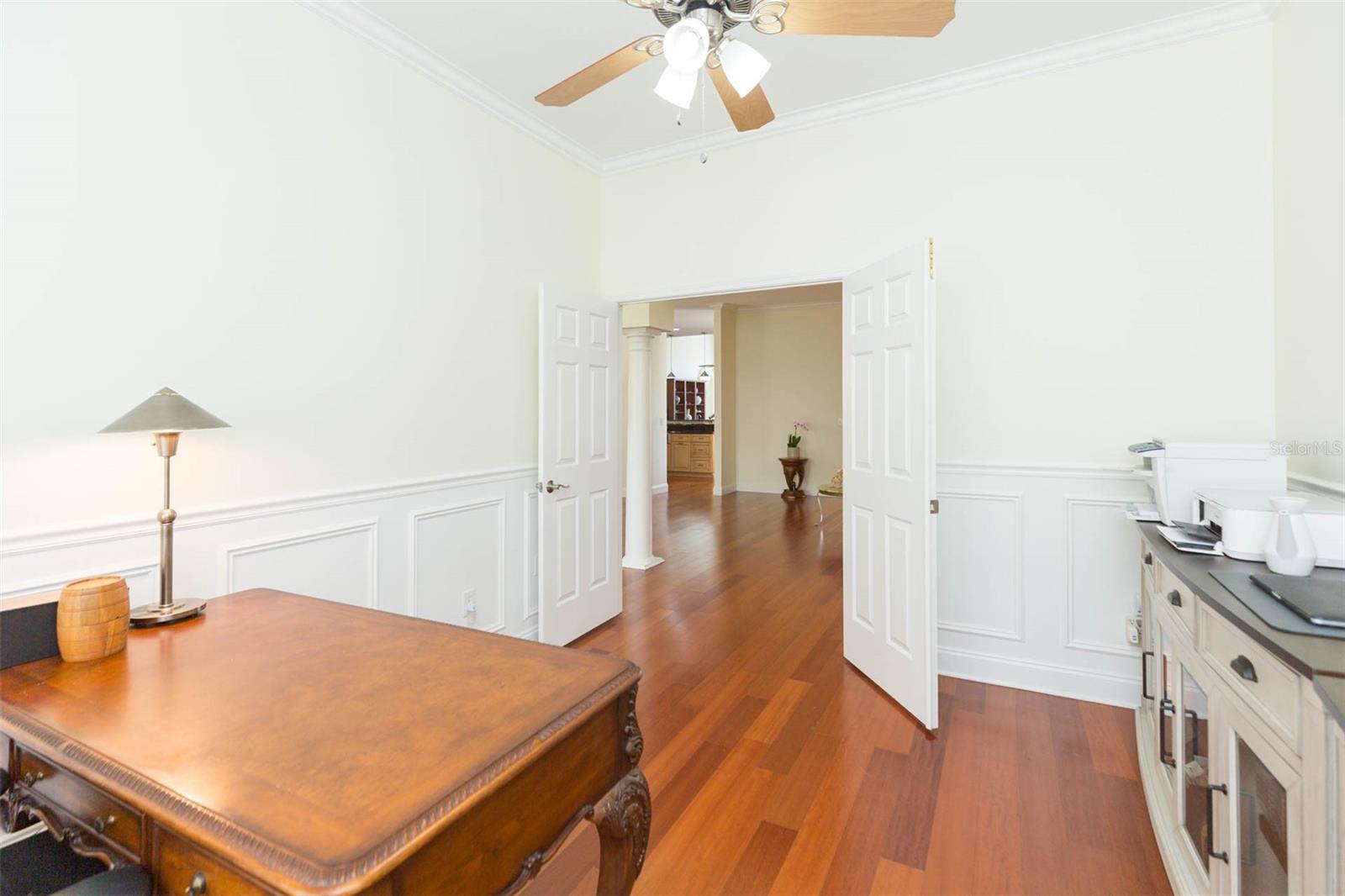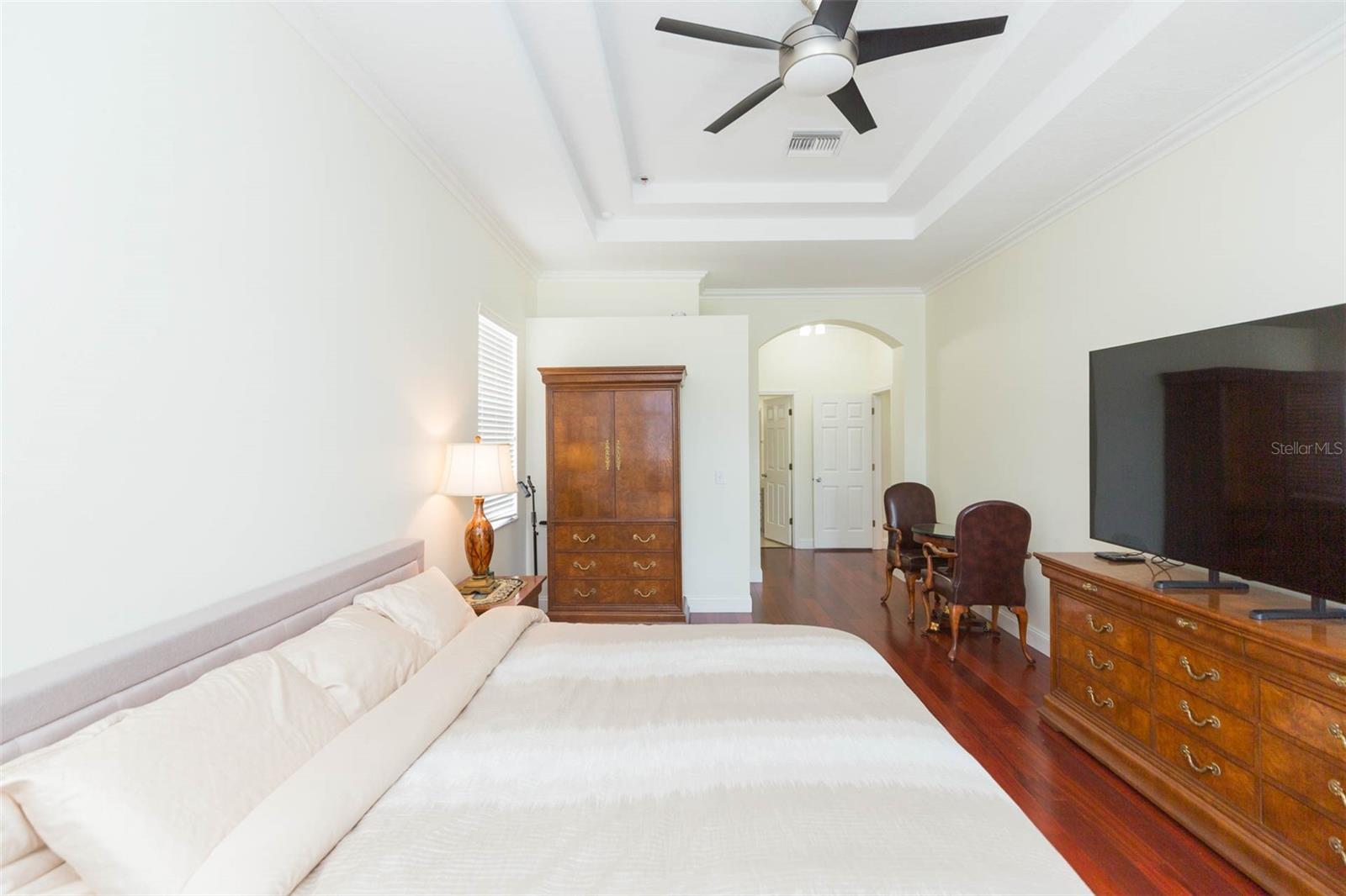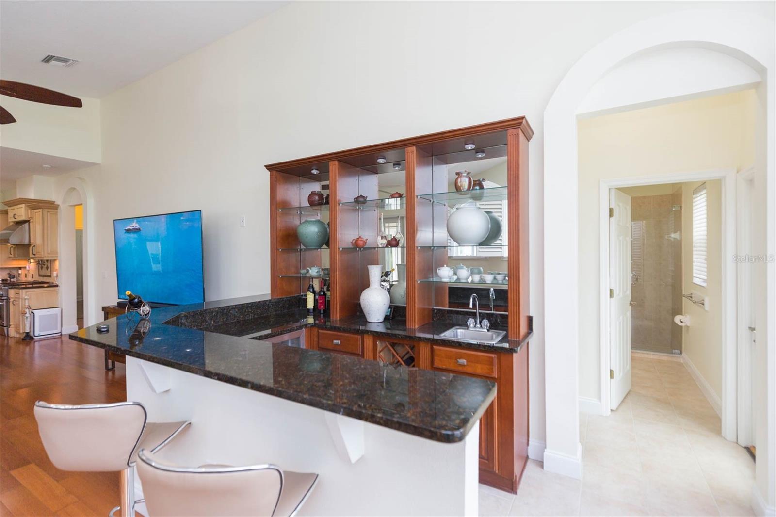 Welcome to a truly exceptional residence in the sought-after Heritage Isles Golf & Country Club community, offering elegant design, thoughtful upgrades, and resort-style outdoor living overlooking the 4th fairway. This home was built for those who love to entertain and live beautifully. The formal double-door entry and decorative columns set the tone for the home's architectural grace. Step into a bright and expansive interior where soaring ceilings, warm teak flooring, and architectural arches invite you into the formal living and dining rooms, perfect for hosting elegant (or casual!) gatherings. The flow of natural light and the open layout create a vibrant and inviting atmosphere throughout. Office with french doors is located at the front of the home. The heart of the home is the impressively spacious great room, where multiple windows and French doors offer wide, uninterrupted views of the sparkling pool and lush golf course beyond. This gathering space easily accommodates seating for ten and includes a striking wet bar with decorative shelving, mirrors, long granite countertops, and a built-in beverage refrigerator. The chef’s kitchen is both functional and stylish, featuring French white raised-panel cabinetry, a contrasting island with bullnose granite countertops, a stainless farmhouse sink and a pot filler above the GAS stove. Buried propane tank provides the gas for cooking! You will also appreciate the newer appliances, the warming drawer, a French door refrigerator, and a breakfast nook with a corner window that provides a clear, relaxing view of the pool area. The spacious primary suite features a tray ceiling and French doors to the pool. The primary bathroom includes dual sinks, long vanities, a spa tub, large walk-in shower, and high-end fuxury fixtures. The split-bedroom floor plan offers privacy for guests and the third guest bedroom has easy access to the pool bath. Step outside to a travertine-tiled lanai that defines Florida living. The summer kitchen is equipped with a propane gas grill, large food prep station, and plenty of space for al fresco dining. The resort-style pool features multiple sparkling fountains, a zero-entry sun shelf, spa with spillover, and a tranquil waterfall feature. The pool is surrounded by multiple lounging areas, perfect for relaxing or hosting unforgettable gatherings. As a unique bonus, the screened area behind the home offers space for a practice chipping and putting green, ideal for sharpening your short game, especially with a serene golf course view as the backdrop. Laundry is near the kitchen and has newer appliances and storage. New roof (2024), New interior paint (2023), New AC units (2022 & 2021) and upgraded appliances and fixtures throughout. This northeast facing home is perfect for admiring the best sunsets in Florida where there is a kaleidoscope of colors in your back yard, a fountain for privacy while still enjoying the golf course view. Separate AC units for the home and the primary suite. Heritage Isles offers an 18-hole championship golf course, clubhouse with restaurant and activities, resort-style pool with Typhoon waterslide, fitness center, tennis and basketball courts and playgrounds. Conveniently located near I-75, top-rated schools, shopping, restaurants, and Flatwoods Park. Easy drive to Moffitt Cancer Center, University of South Florida, multiple hospitals, downtown and TIA. This is a lifestyle that will truly become your forever home. Love where you live!