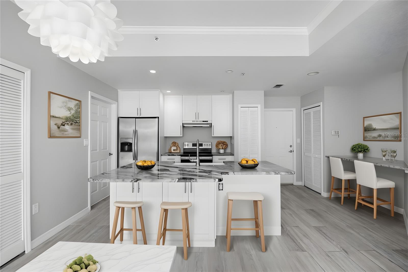One or more photo(s) has been virtually staged. Experience resort-style living at Parkcrest on Harbour Island in this beautifully updated 2-bedroom, 2-bath condo offering just under 1,200 sq. ft. of thoughtfully designed space. The open floor plan showcases stylish wood-look tile flooring throughout and a stunning chef’s kitchen with a massive island, soft-close cabinetry, and ample storage. The spacious primary suite features two closets for added convenience, while the second bedroom boasts a generous walk-in closet—perfect for guests or a home office. Set within one of Tampa’s most sought-after waterfront communities, Parkcrest provides 24/7 security, a resort-style pool and spa, fitness center, clubroom, and access to the vibrant Harbour Island lifestyle. Just steps from Tampa’s Riverwalk, Benchmark International Arena, and the best dining and entertainment downtown has to offer, this condo perfectly blends modern comfort with urban convenience.