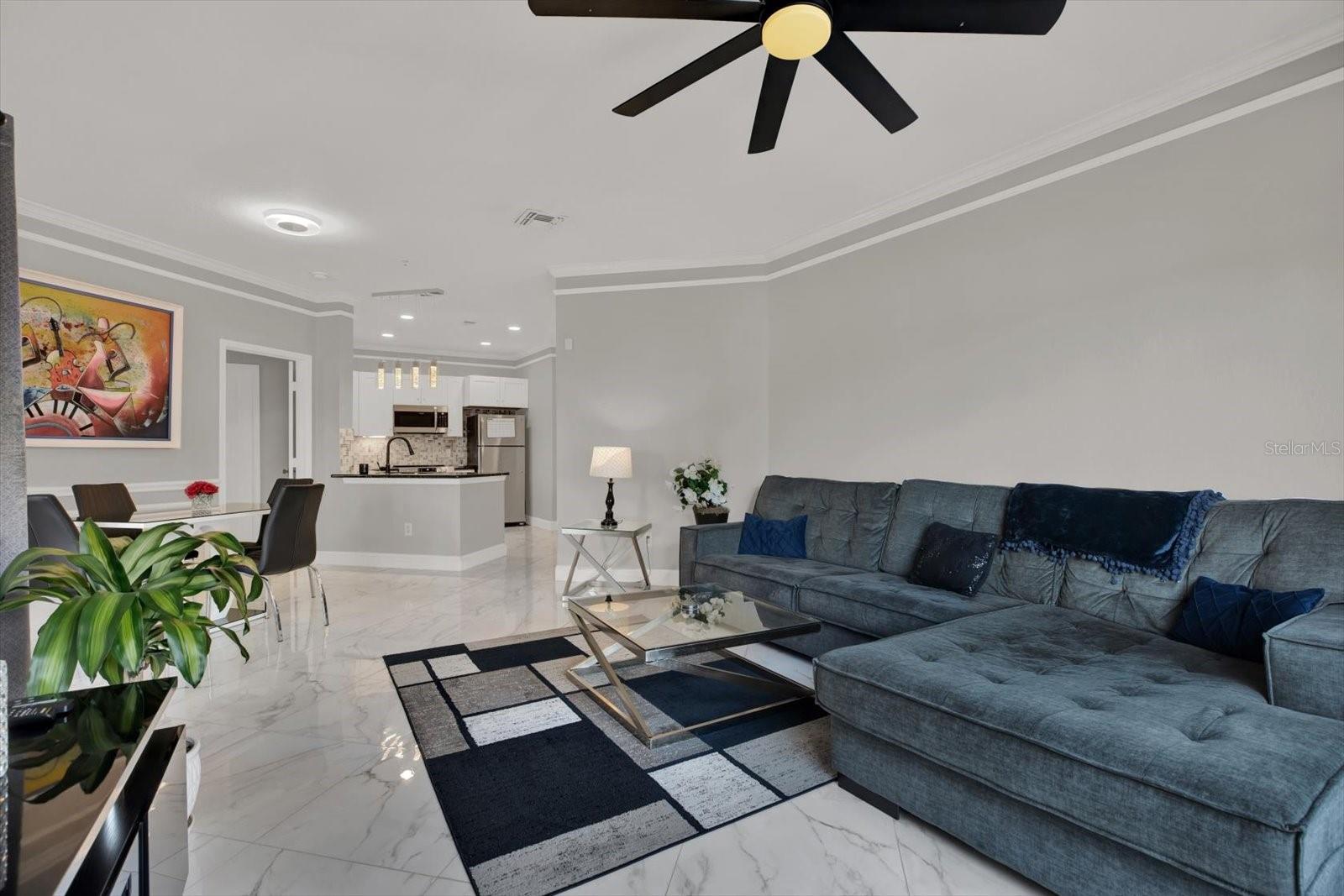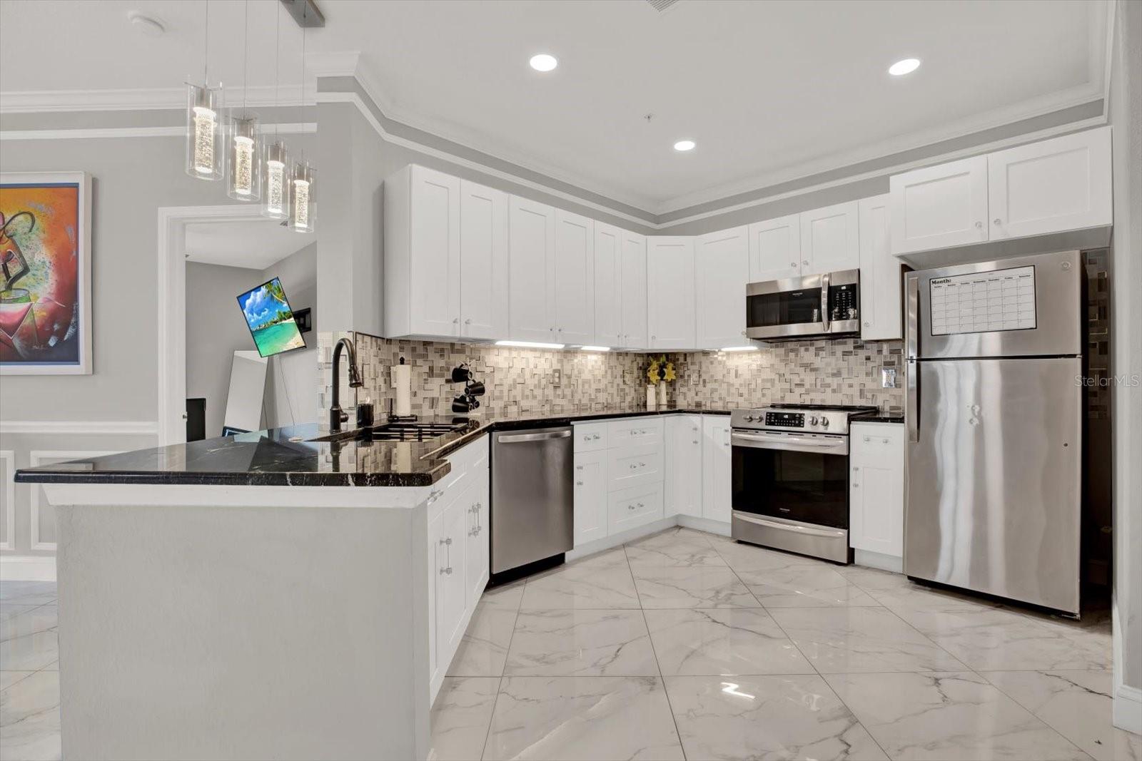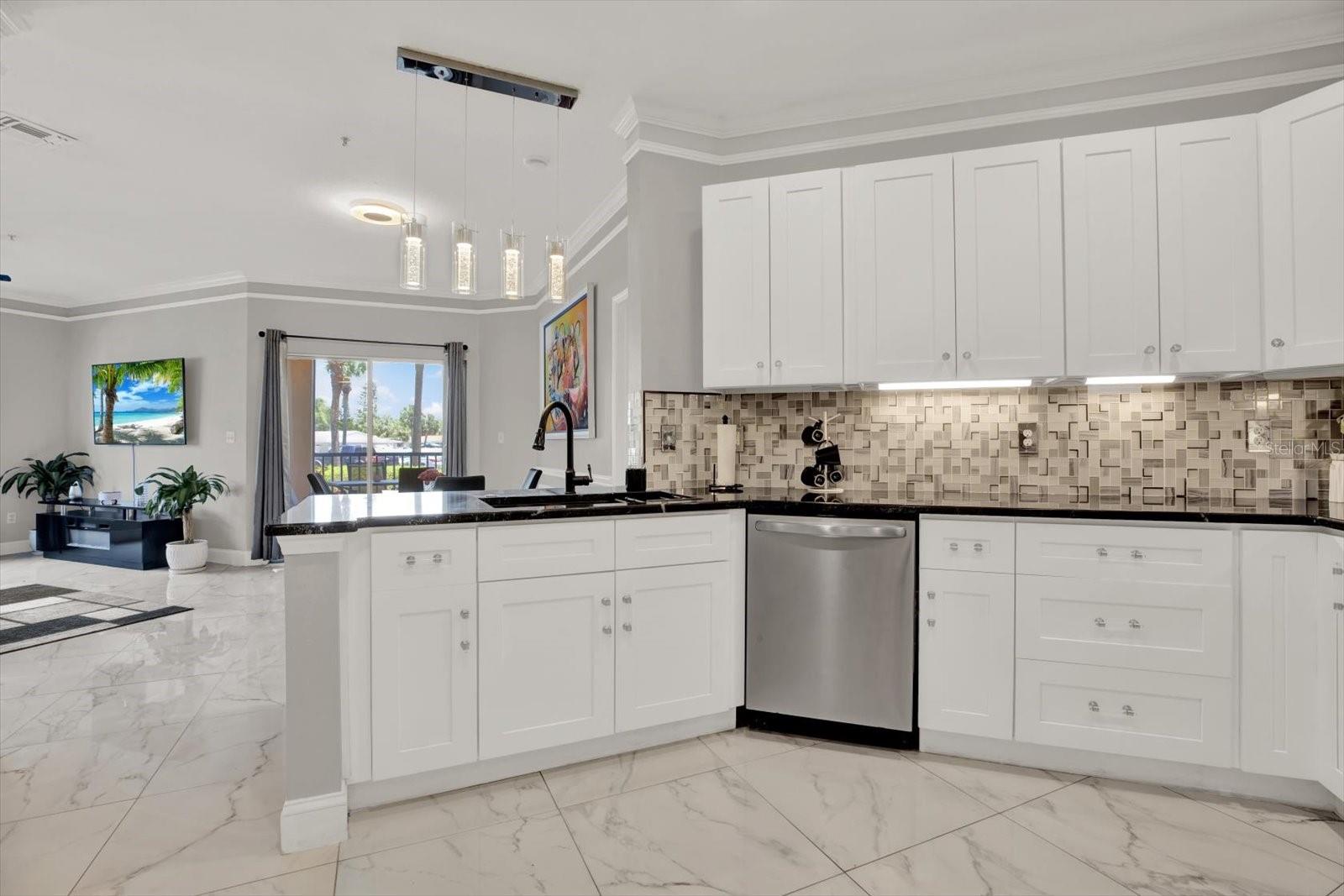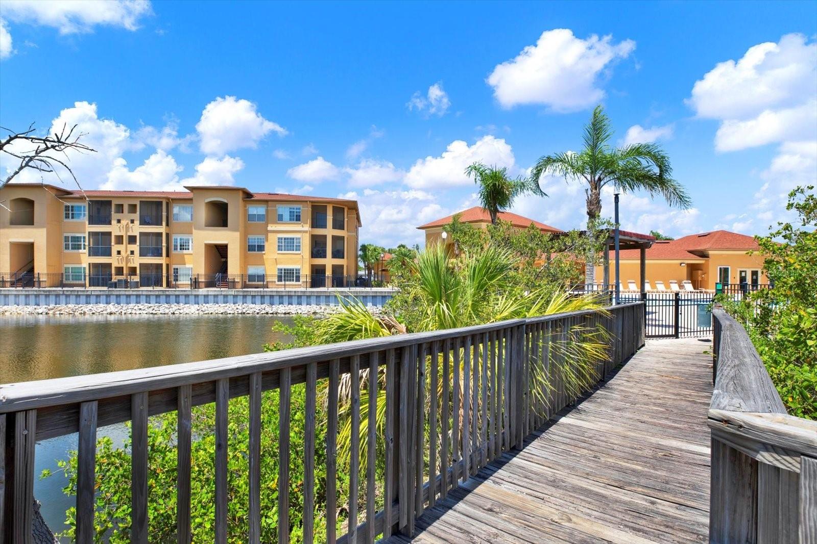 One or more photo(s) has been virtually staged. Step into this beautifully updated modern condo in the desirable, gated Beachwalk Condominiums community in Tampa. Designed for both comfort and style, this home features an open-concept layout with premium porcelain tile flooring throughout, creating a seamless flow between the kitchen, dining, and living areas. The fully renovated kitchen is a standout with granite countertops, custom cabinetry, mosaic tile backsplash, pull-down faucet, stainless steel appliances, and designer pendant lighting. Retreat to the spa-inspired bathrooms, each thoughtfully upgraded with marble-tiled shower walls, rain shower heads, LED vanity mirrors, mirrored shelving cabinets, and waterfall vessel sinks. The primary bath boasts a multiple shower head system for a true at-home oasis. Both bedrooms are generously sized with walk-in closets, and the home is enhanced with crown molding, fresh paint, and oversized insulated windows that fill the space with natural light. The private balcony features newly replaced screens, storage space, and tranquil views of the lush tropical landscaping. Recent updates include newer A/C (2019), LED lighting, washer, dryer, and water heater. Beachwalk Condominiums offers a resort-style living experience with a 24-hour manned security gate, fitness center, pool, game room, billiards tables, office and printer rooms, auditorium, canoe dock with bay access, and a scenic boardwalk along the water. HOA fees include water, sewer, and valet trash service, making this a turnkey opportunity in a prime Tampa location.