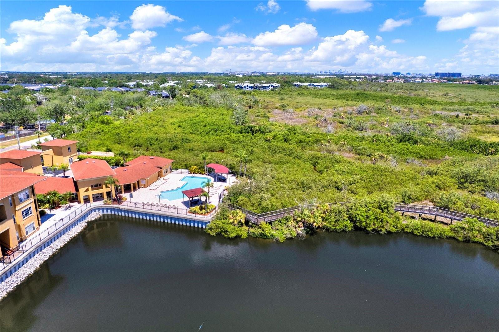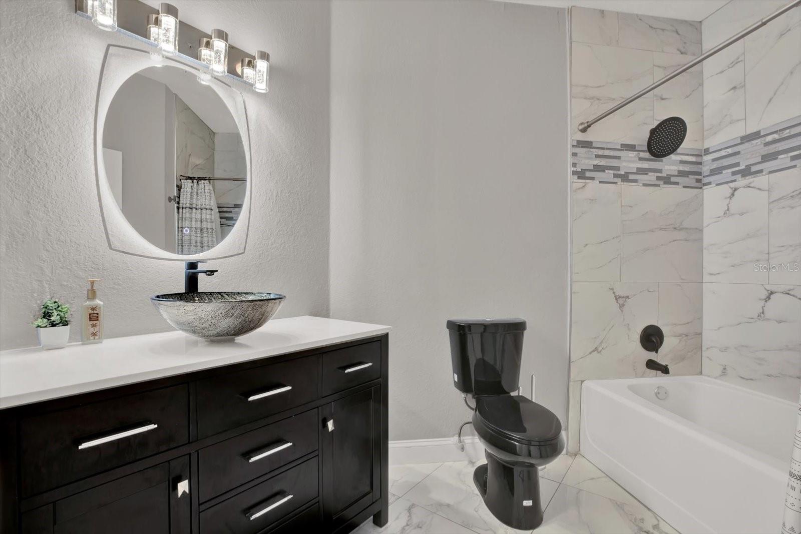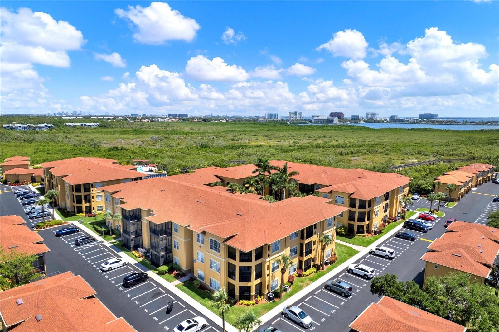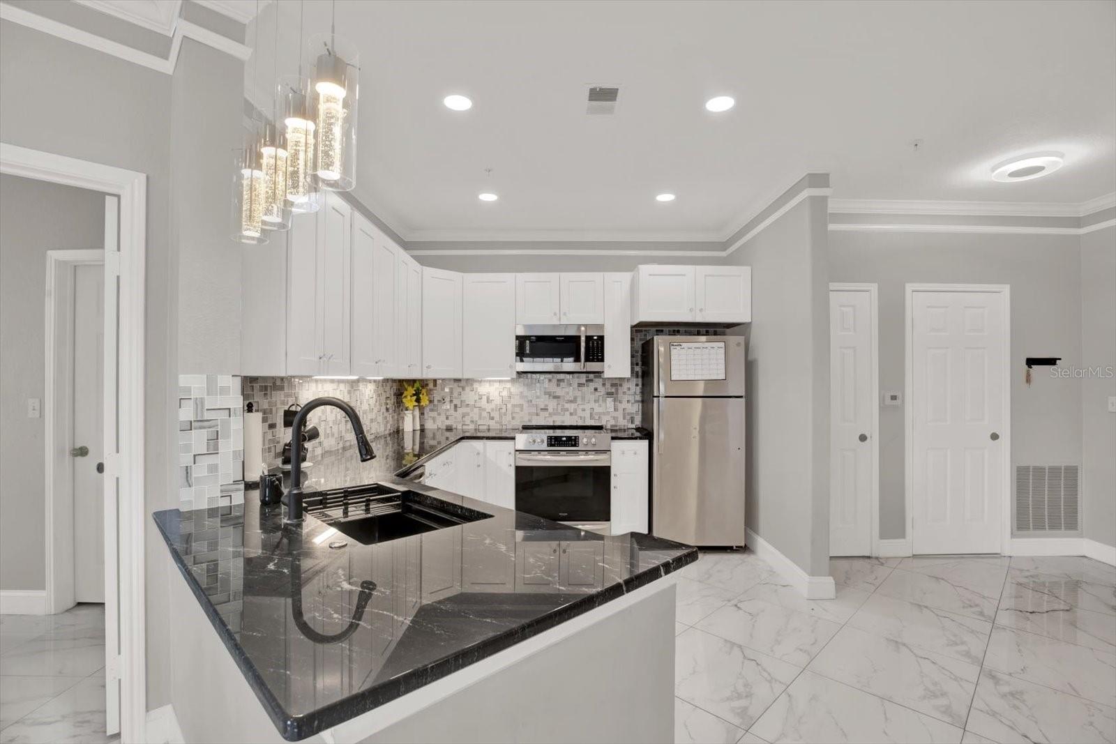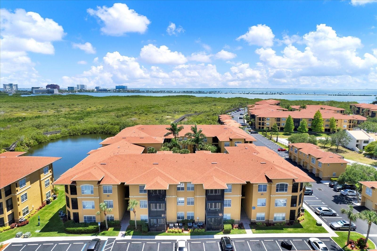 One or more photo(s) has been virtually staged. Step into this beautifully updated modern condo in the desirable, gated Beachwalk Condominiums community in Tampa. Designed for both comfort and style, this home features an open-concept layout with premium porcelain tile flooring throughout, creating a seamless flow between the kitchen, dining, and living areas. The fully renovated kitchen is a standout with granite countertops, custom cabinetry, mosaic tile backsplash, pull-down faucet, stainless steel appliances, and designer pendant lighting. Retreat to the spa-inspired bathrooms, each thoughtfully upgraded with marble-tiled shower walls, rain shower heads, LED vanity mirrors, mirrored shelving cabinets, and waterfall vessel sinks. The primary bath boasts a multiple shower head system for a true at-home oasis. Both bedrooms are generously sized with walk-in closets, and the home is enhanced with crown molding, fresh paint, and oversized insulated windows that fill the space with natural light. The private balcony features newly replaced screens, storage space, and tranquil views of the lush tropical landscaping. Recent updates include newer A/C (2019), LED lighting, washer, dryer, and water heater. Beachwalk Condominiums offers a resort-style living experience with a 24-hour manned security gate, fitness center, pool, game room, billiards tables, office and printer rooms, auditorium, canoe dock with bay access, and a scenic boardwalk along the water. HOA fees include water, sewer, and valet trash service, making this a turnkey opportunity in a prime Tampa location.
