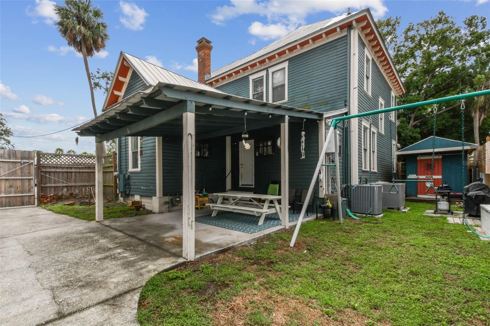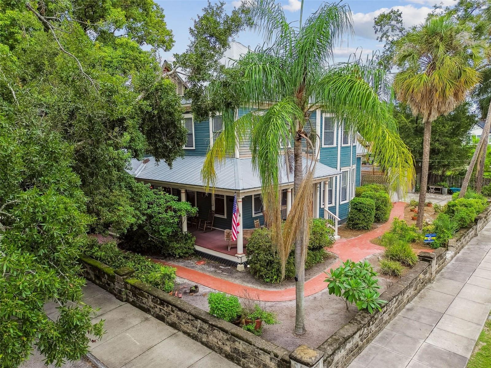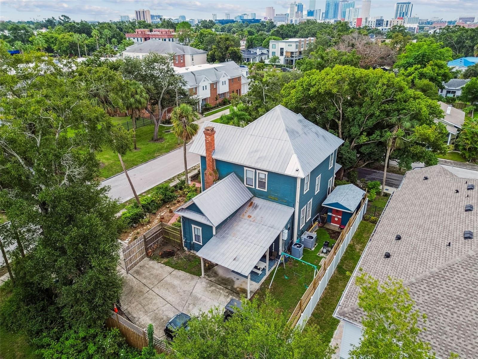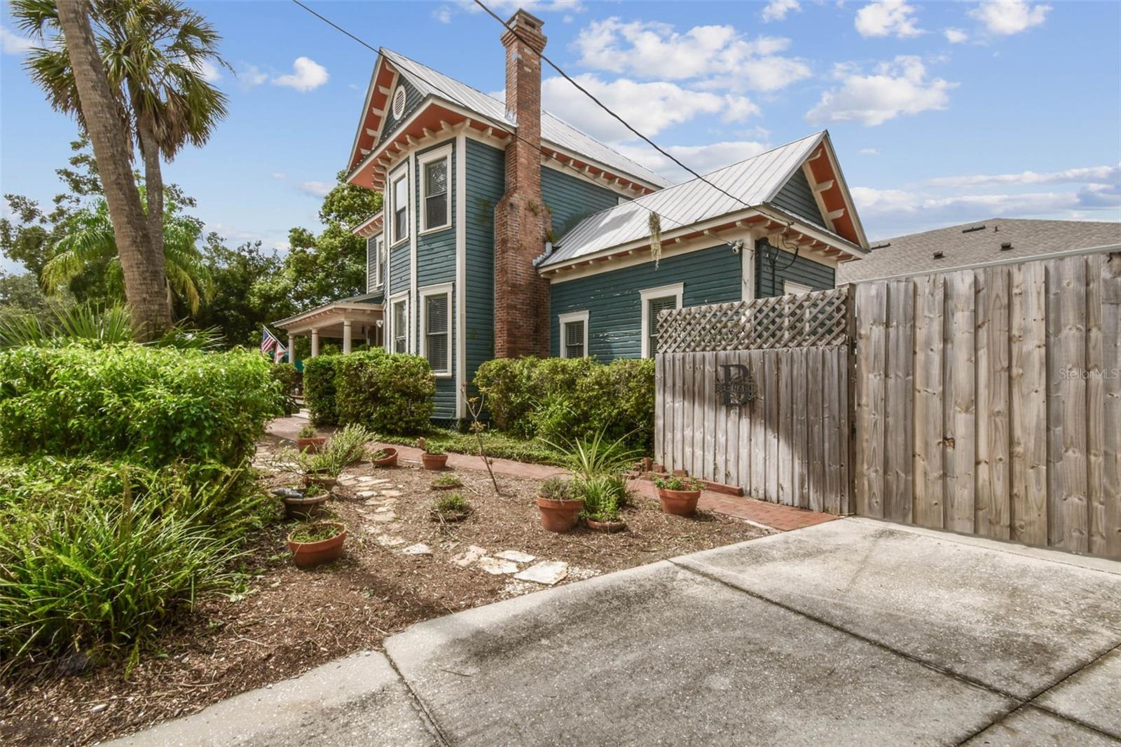 Welcome to this beautifully preserved 1913 home located in the heart of highly sought-after Tampa Heights. Nestled on a picturesque 75 x 109 corner lot, this historic residence blends timeless charm with thoughtful updates-perfectly suited for those who appreciate character and vintage ambiance. From the moment you arrive, the curb appeal is undeniable. A stunning wraparound porch invites you in, offering the ideal spot to relax under the shade of majestic trees. The back yard is fully fenced, features large double gates, providing secure access, ample parking, a covered carport (that may double as an outdoor patio), and a newer solid shed with hurricane straps. This home has been lovingly maintained. A durable and long lasting metal roof (2006), a newer HVAC unit (2022/2023), and a commercial-grade gas tankless water heater (2018/250k BTU's) ensure comfort and efficiency. Step inside to find a grand entryway full of light that leads to a spacious dining room and an expansive living room with gas fireplace-ideal for entertaining and holiday meals. The retro-style kitchen features newer appliances (gas range), a built in table and bench duo. Downstairs you will also find a laundry room and a full bedroom and bathroom for added convenience and flexibility. Climb the impressive staircase to find 3 bedrooms, 2 of which are generously sized, a large full bath, and access to a fully insulated attic, already plumbed for an additional bathroom. The attic may easily be converted into a private retreat, a studio, or more living space. Tampa Heights offers unbeatable location perks. Head South and you are minutes from Armature Works and Downtown Tampa. Go North for quick access to vibrant Riverside Heights and trendy Seminole Heights. I275, I4, Ybor City, Port Tampa, the Channelside District and more are a short drive away. Don't miss this rare opportunity to own a piece of Tampa's History-with all the updates needed to enjoy it for years to come.