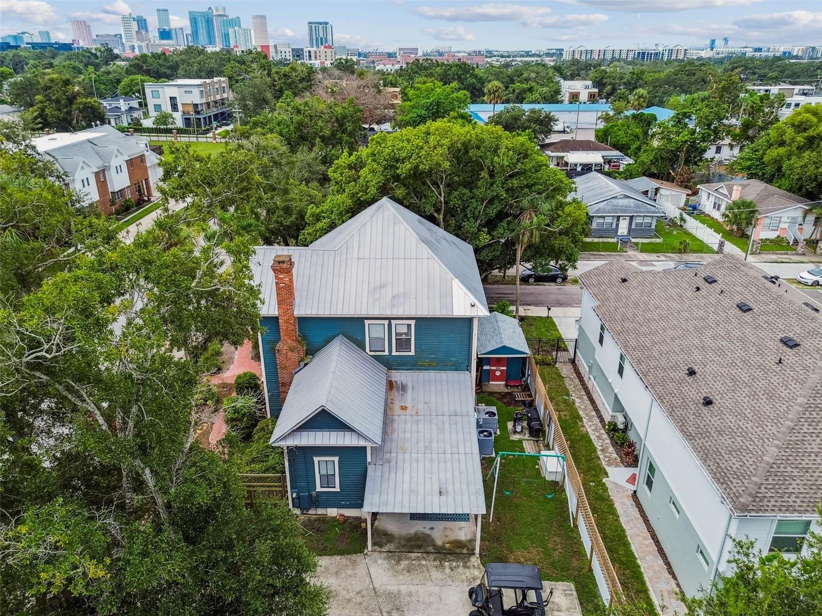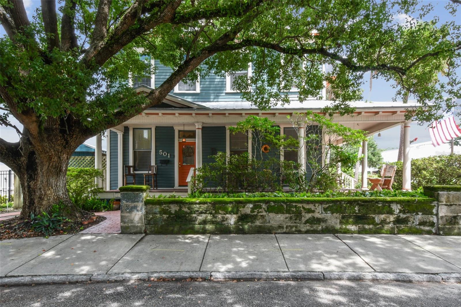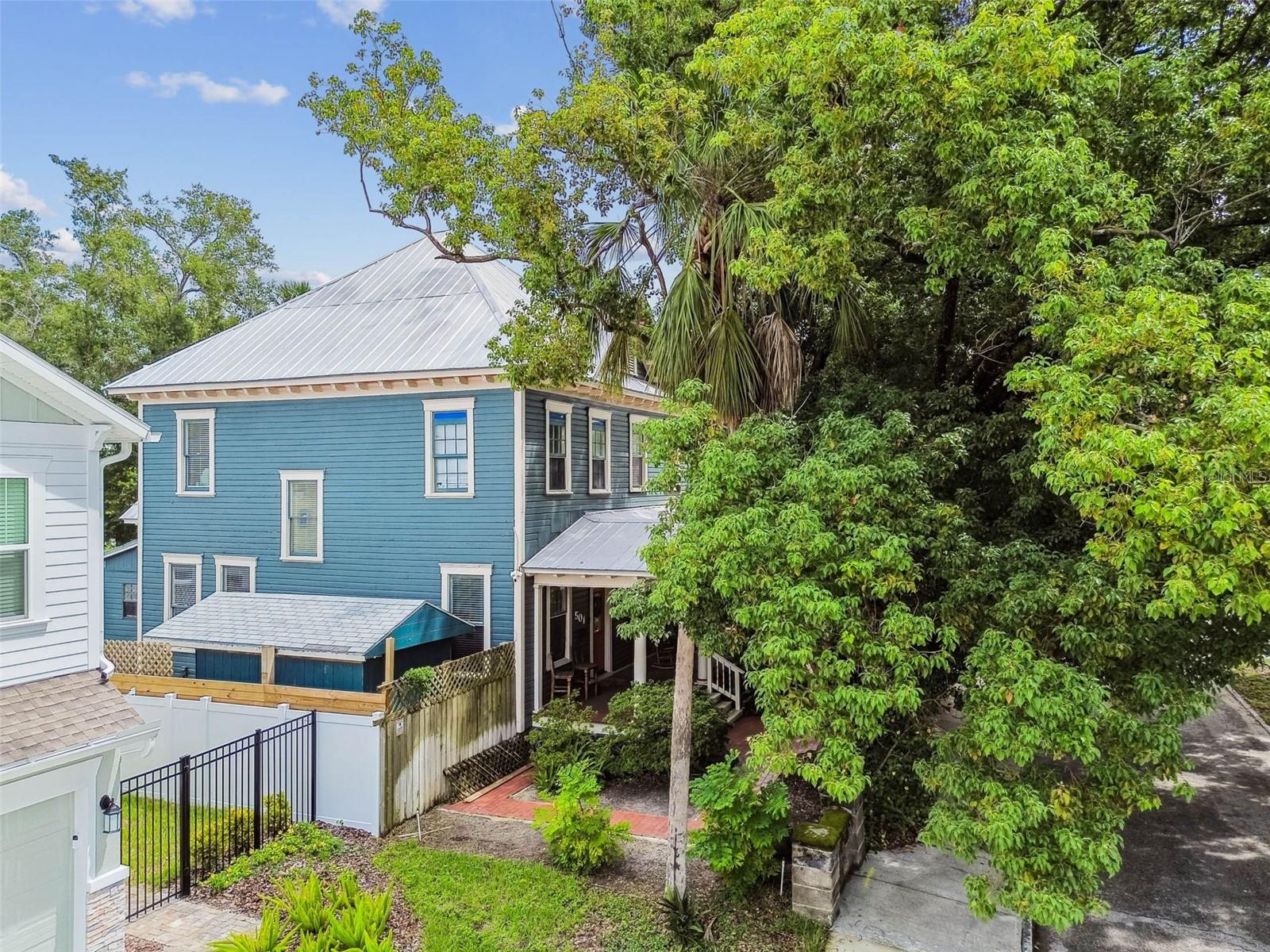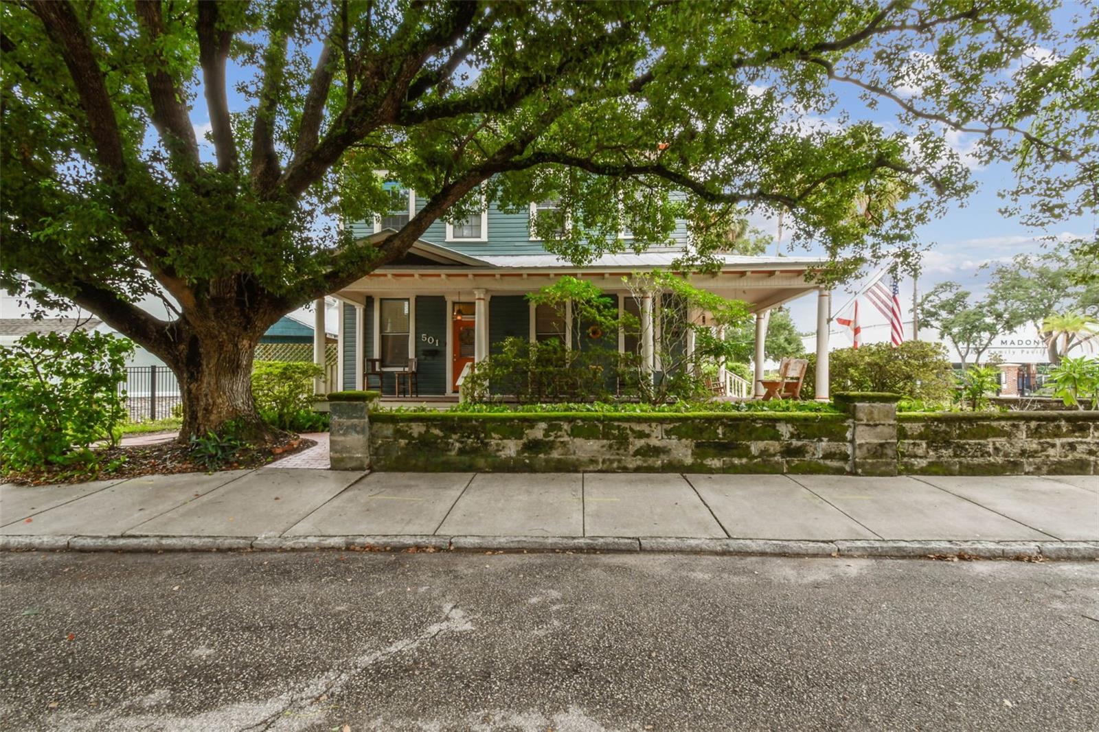Welcome to this beautifully preserved 1913 home located in the heart of highly sought-after Tampa Heights. Nestled on a picturesque 75 x 109 corner lot, this historic residence blends timeless charm with thoughtful updates-perfectly suited for those who appreciate character and vintage ambiance. From the moment you arrive, the curb appeal is undeniable. A stunning wraparound porch invites you in, offering the ideal spot to relax under the shade of majestic trees. The back yard is fully fenced, features large double gates, providing secure access, ample parking, a covered carport (that may double as an outdoor patio), and a newer solid shed with hurricane straps. This home has been lovingly maintained. A durable and long lasting metal roof (2006), a newer HVAC unit (2022/2023), and a commercial-grade gas tankless water heater (2018/250k BTU's) ensure comfort and efficiency. Step inside to find a grand entryway full of light that leads to a spacious dining room and an expansive living room with gas fireplace-ideal for entertaining and holiday meals. The retro-style kitchen features newer appliances (gas range), a built in table and bench duo. Downstairs you will also find a laundry room and a full bedroom and bathroom for added convenience and flexibility. Climb the impressive staircase to find 3 bedrooms, 2 of which are generously sized, a large full bath, and access to a fully insulated attic, already plumbed for an additional bathroom. The attic may easily be converted into a private retreat, a studio, or more living space. Tampa Heights offers unbeatable location perks. Head South and you are minutes from Armature Works and Downtown Tampa. Go North for quick access to vibrant Riverside Heights and trendy Seminole Heights. I275, I4, Ybor City, Port Tampa, the Channelside District and more are a short drive away. Don't miss this rare opportunity to own a piece of Tampa's History-with all the updates needed to enjoy it for years to come.