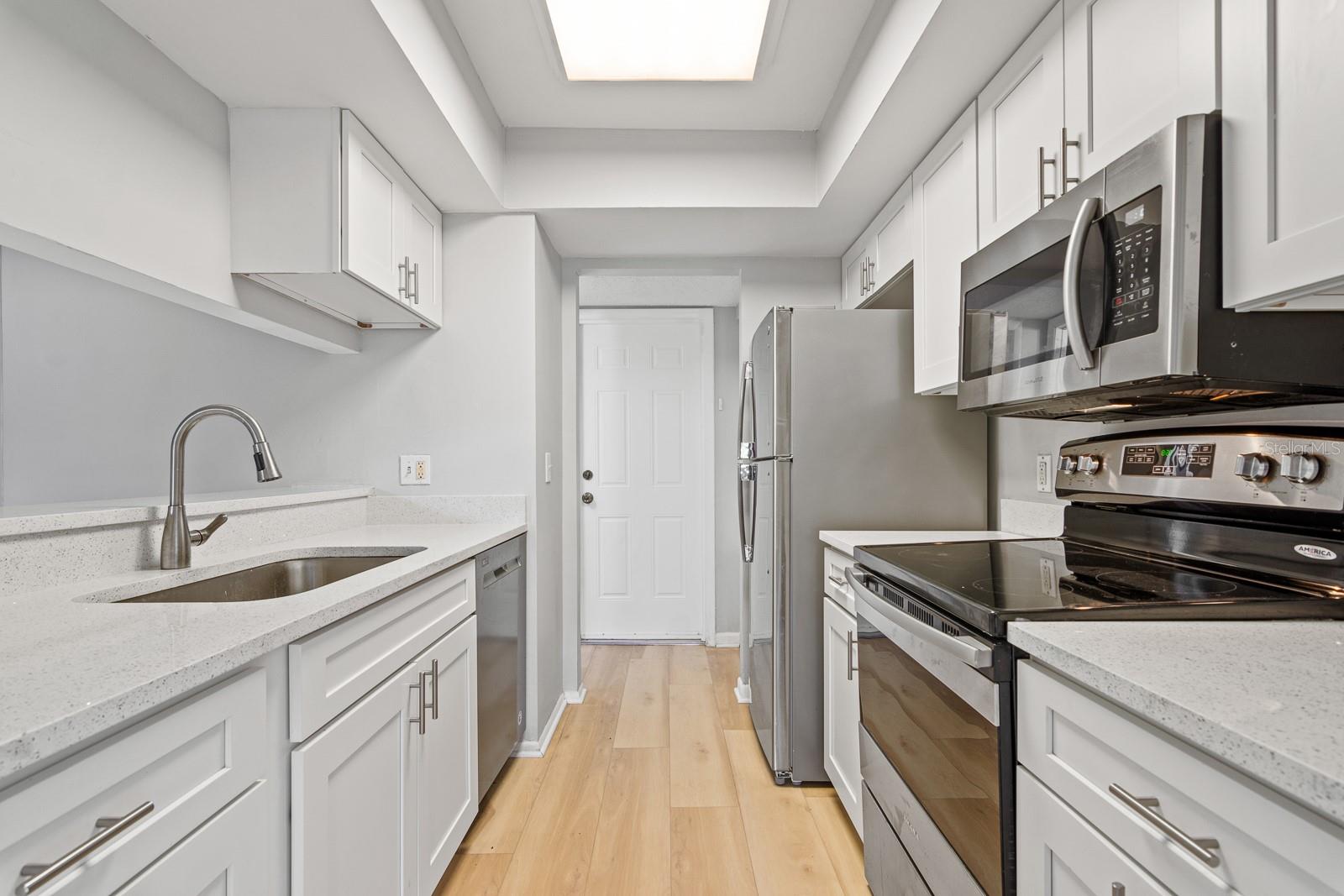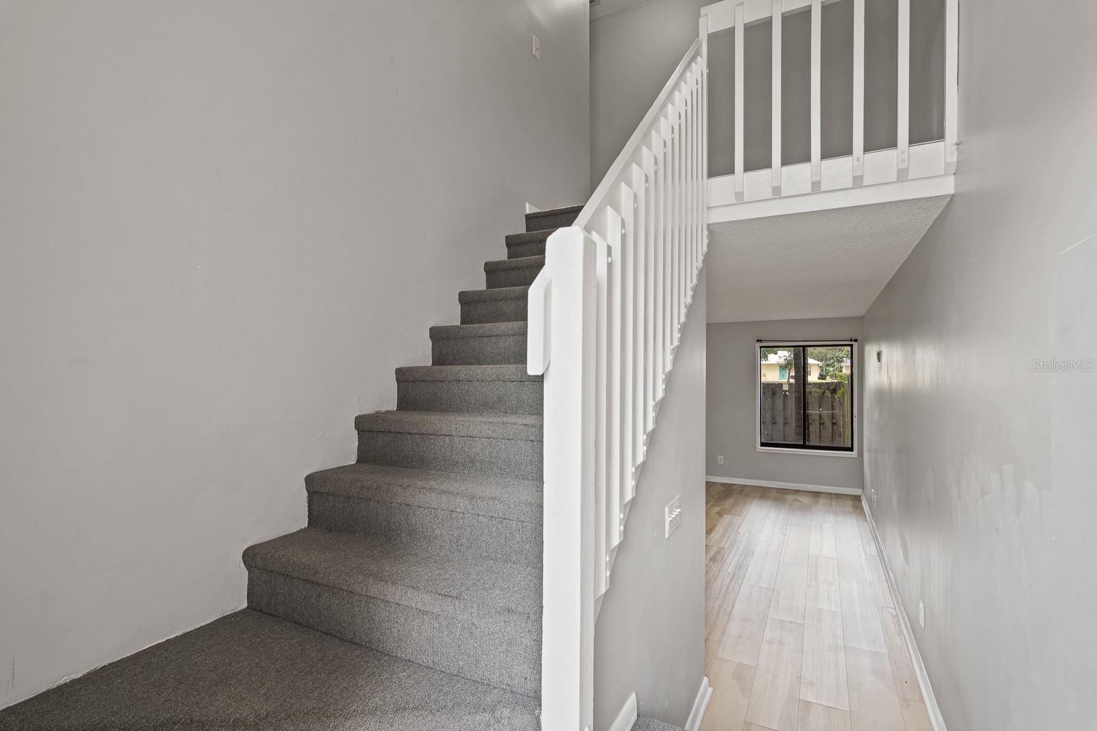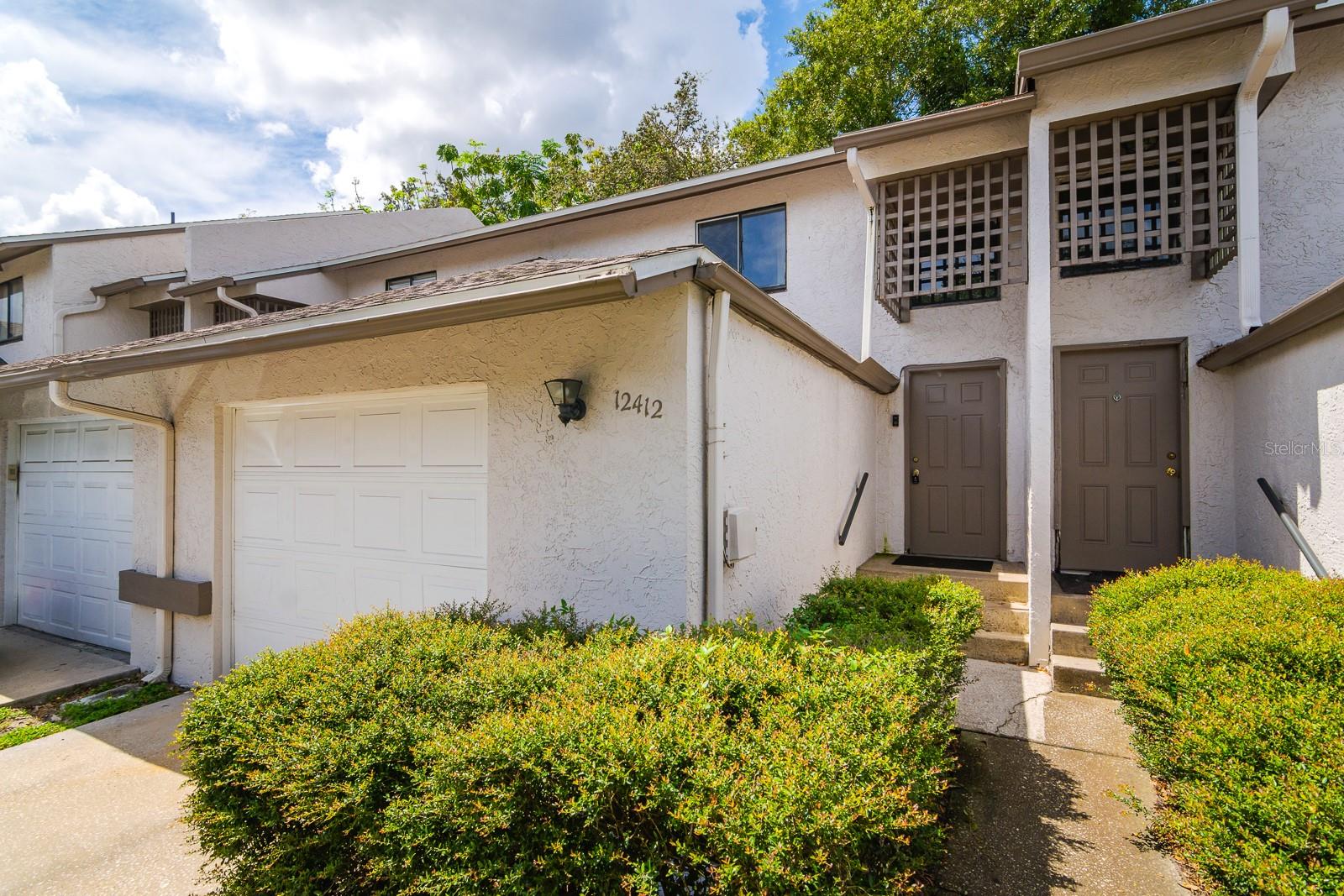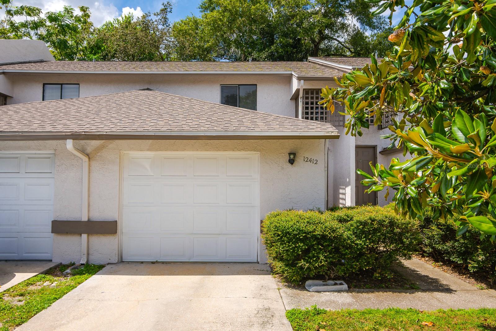 Welcome to this beautifully updated two-story home in the desirable Carlyle Garden community. Offering 2 bedrooms, 1.5 bathrooms, and a 1-car garage, this 1,072 sq ft condo combines comfort, convenience, and modern finishes in a well-maintained setting. Step inside to an open floor plan featuring fresh paint and brand-new laminate flooring throughout. The updated kitchen boasts sleek quartz countertops, stainless steel appliances, a closet pantry, and a breakfast bar overlooking the spacious living room—perfect for entertaining. A conveniently located half bath sits just off the kitchen, leading toward the attached garage, where you'll also find a washer and dryer. Upstairs, you'll discover a functional landing area ideal for a small home office or study nook. The master bedroom includes a generous walk-in closet, and both bedrooms offer plenty of natural light. Enjoy outdoor living in the private, fenced-in courtyard shaded by mature oak trees—perfect for relaxing or gardening. The community is clean and well-maintained, and its location offers quick access to shopping, dining, schools, local hospitals, and I-275 for easy commuting.