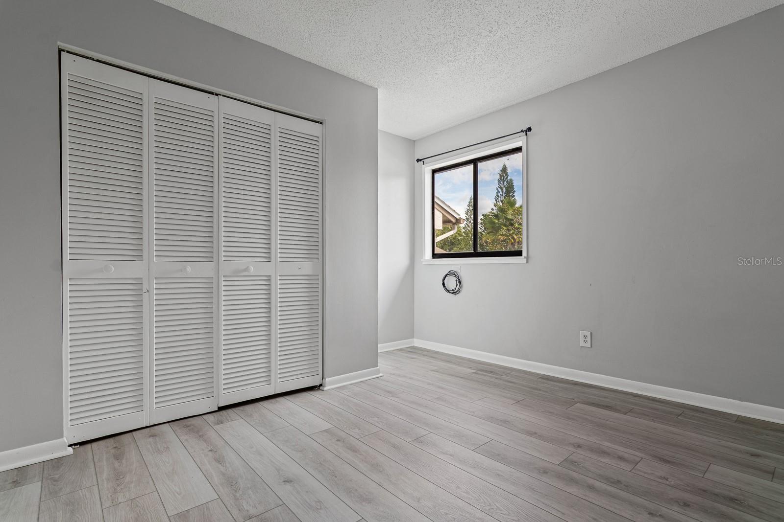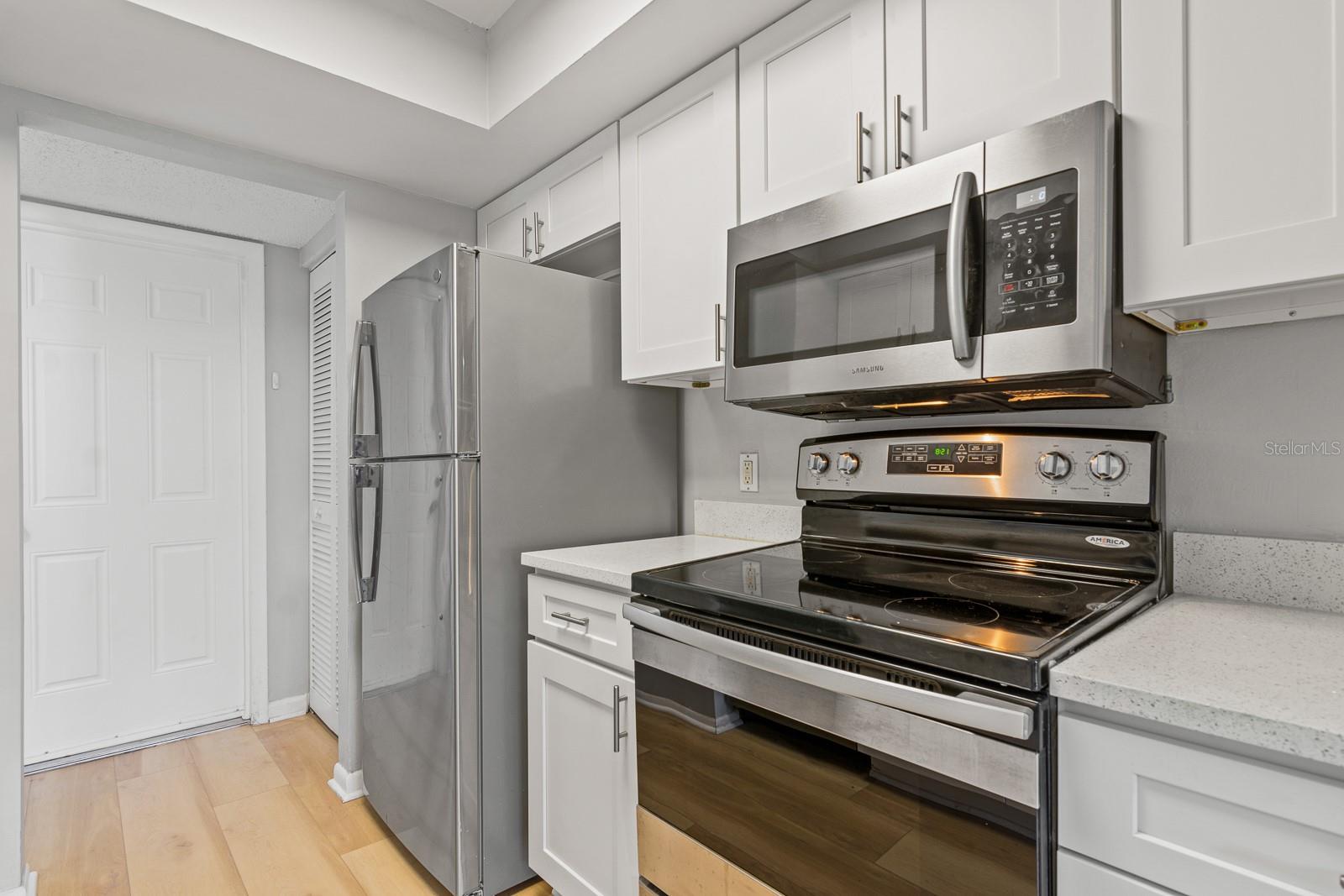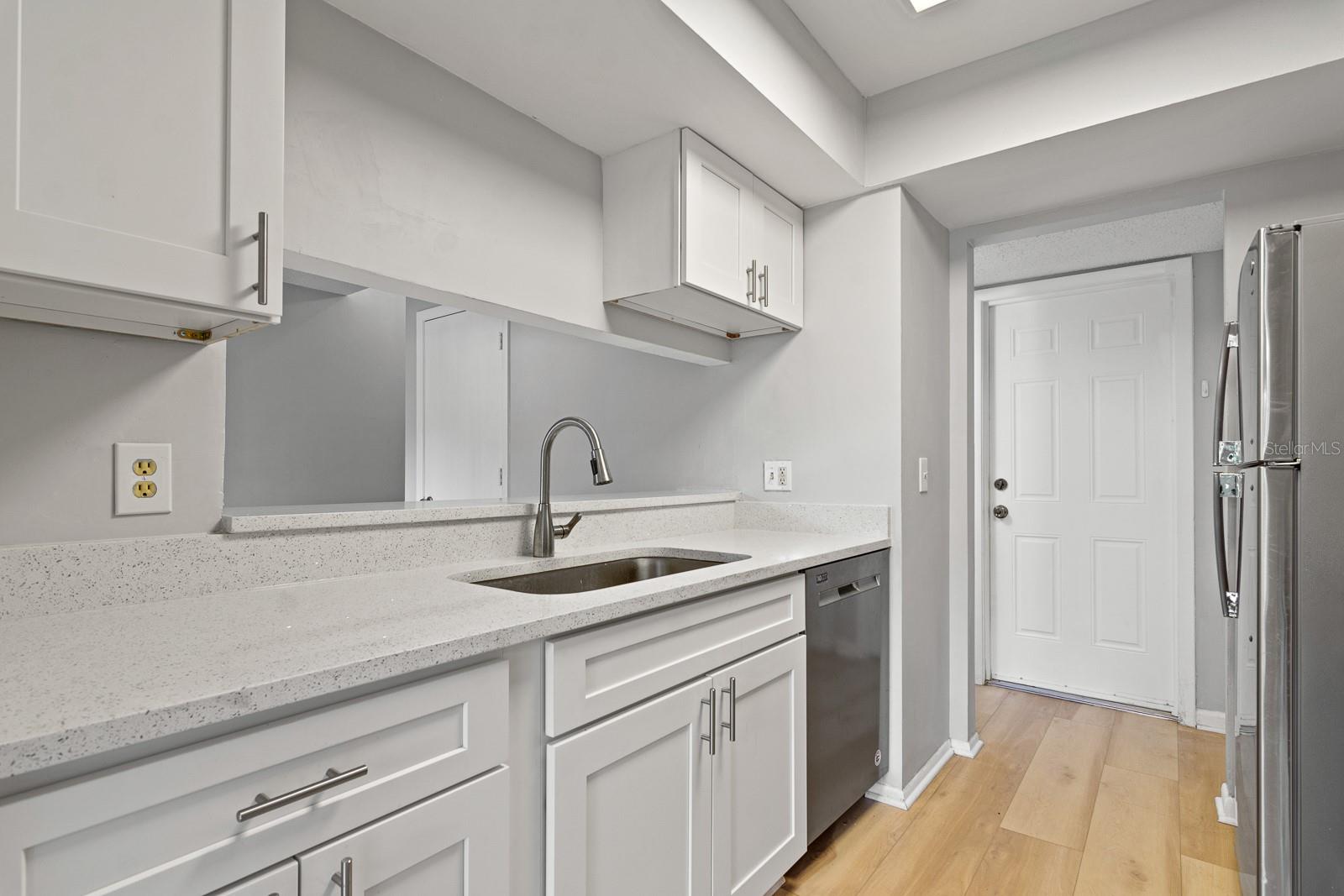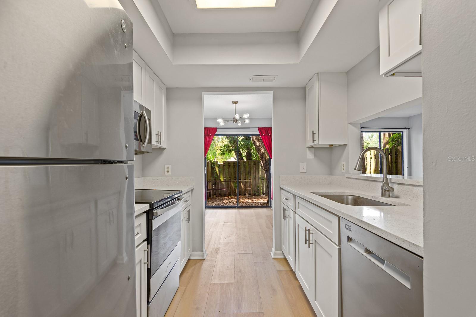 Welcome to this beautifully updated two-story home in the desirable Carlyle Garden community. Offering 2 bedrooms, 1.5 bathrooms, and a 1-car garage, this 1,072 sq ft condo combines comfort, convenience, and modern finishes in a well-maintained setting. Step inside to an open floor plan featuring fresh paint and brand-new laminate flooring throughout. The updated kitchen boasts sleek quartz countertops, stainless steel appliances, a closet pantry, and a breakfast bar overlooking the spacious living room—perfect for entertaining. A conveniently located half bath sits just off the kitchen, leading toward the attached garage, where you'll also find a washer and dryer. Upstairs, you'll discover a functional landing area ideal for a small home office or study nook. The master bedroom includes a generous walk-in closet, and both bedrooms offer plenty of natural light. Enjoy outdoor living in the private, fenced-in courtyard shaded by mature oak trees—perfect for relaxing or gardening. The community is clean and well-maintained, and its location offers quick access to shopping, dining, schools, local hospitals, and I-275 for easy commuting.