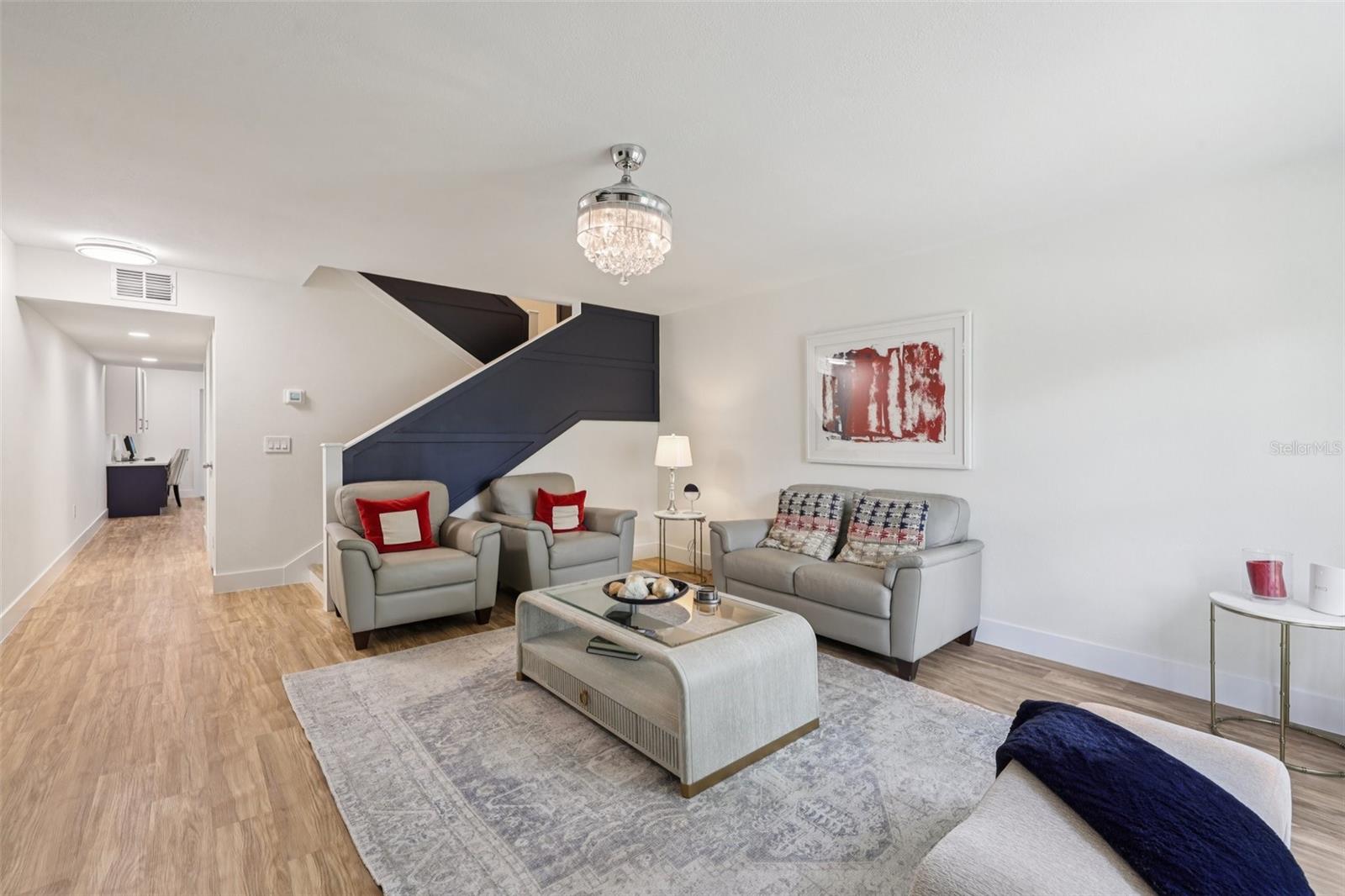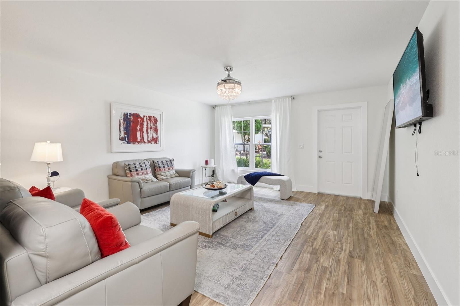 This condominium has been fully renovated and updated on the interior since it was last listed on the market, offering a move-in ready experience in a private community just minutes from USF. Behind its solid block construction, you’ll find two large bedrooms with a private balcony off the master, two and a half remodeled bathrooms, and an oversized two-car garage enhanced with custom storage solutions and a sliding barn door. Nearly every detail has been addressed, including new impact-rated sliding glass doors and windows, updated plumbing, serviced HVAC with new vents, waterproof deluxe laminate flooring, efficient lighting and fans, modern paint, baseboards, and a custom stair wall. The kitchen is a showpiece with ceiling-height cabinetry, quartz counters, stainless steel appliances, deep farmhouse sink, custom pantry, and a built-in desk with storage. Bathrooms feature quartz surfaces, marble backsplash, glass shower doors, and in the primary suite, a custom vanity, built-in closet system, headboard accent wall, and balcony seating area. The secondary bedroom includes a custom closet with shelving and a new window. Community amenities include a pool, clubhouse, landscaped courtyards, guest parking, and HOA coverage for exterior structure, water, and grounds maintenance. Positioned across from the USF golf course with quick access to Moffitt, James A. Haley VA, shopping, dining, and I-75/I-275, this property delivers a modern interior, excellent location, and long-term rental potential.