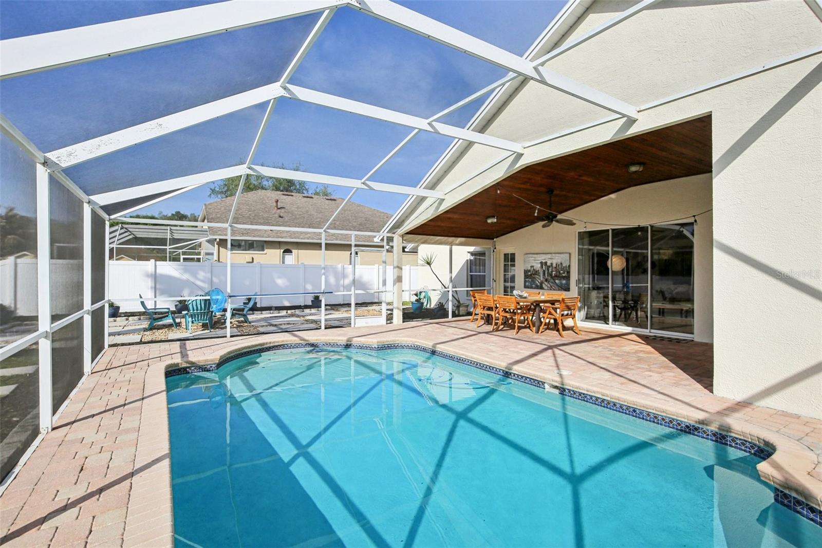 Beautiful pool home located in the gated Kingshyre neighborhood of Cross Creek in desirable New Tampa. A welcoming entry with double leaded glass front doors opens to a well-designed layout featuring formal living and dining rooms with arched windows—ideal for entertaining or a home office. The spacious eat-in kitchen overlooks the family room and includes white cabinetry, granite countertops, a custom tile backsplash, stainless appliannces including gas range, and breakfast bar. Architectural details such as arched walkways and subtle faux brick accents add character, while a neutral color palette and LVP flooring throughout the main areas and primary suite provide a clean, updated look. The primary suite features dual walk-in closets, a stylish accent wall, and an upgraded en suite bath with dual vanities, a freestanding soaking tub, and a large walk-in shower. Enjoy indoor-outdoor living with triple sliders leading to the lanai, complete with upgraded pavers, a slatted wood ceiling, and a brand-new screened enclosure. The second bathroom offers direct lanai access for added convenience. The backyard is generously sized and includes a firepit—perfect for relaxing or entertaining. Located in a fantastic New Tampa community close to shopping, dining, and major roadways.