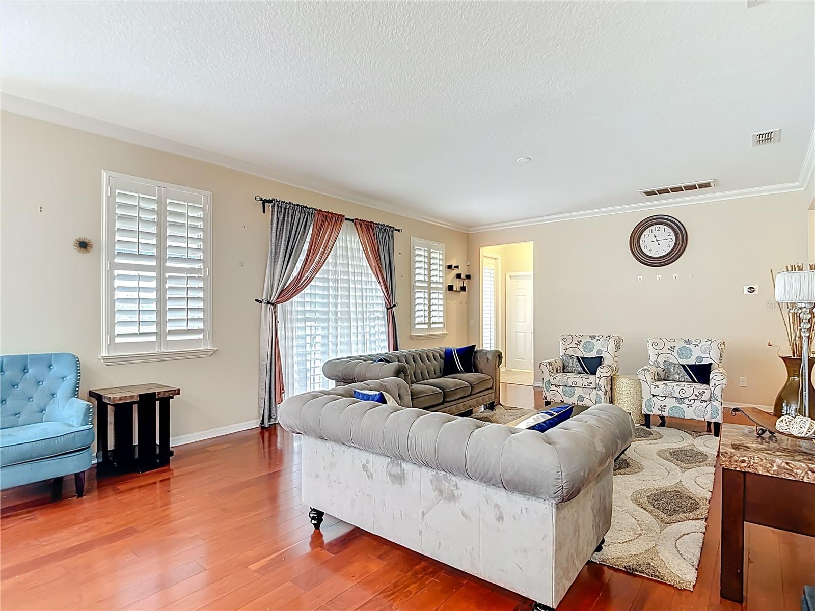 OVERLOOKING A SERENE WATER VIEW and surrounded by nature and neighborhood charm, this 5-bedroom, 3-bath home in Easton Park offers the perfect balance of space, serenity, and convenience. Designed for both entertaining and everyday comfort, the open floor plan features soaring ceilings, elegant details, and light-filled living areas that instantly feel inviting. The GOURMET KITCHEN overlooks the family room and outdoor living space, complete with 42-inch cabinetry, stainless steel appliances, granite countertops, a glass tile backsplash, and an oversized island perfect for gatherings. The primary suite is EXCEPTIONALLY SPACIOUS, offering hardwood floors, plantation shutters, a cozy sitting area, and a spa-like bath with a garden tub and separate shower heated by a tankless water heater. Upstairs, a versatile bonus area provides the perfect spot for work, play, or movie nights, while a first-floor bedroom offers flexibility for guests or a home office. Step outside to your private backyard paradise - a beautifully upgraded screened patio featuring a stone-accented OUTDOOR KITCHEN and bar, built-in beverage cooler, gas fireplace, and plenty of space to unwind while taking in the stunning pond views. Recent updates include a NEW roof and solar panels, combining comfort, efficiency, and peace of mind. Residents of Easton Park enjoy a resort-style pool, park, and playground—all surrounded by the scenic beauty of Flatwoods and Hillsborough River State Parks, with easy access to Bruce B. Downs, USF, and I-75 for a quick commute and convenient city connection. Don’t miss your chance to make this waterfront retreat your next home! *** Age of Roof - 4 months, Age of A/C - 10 years