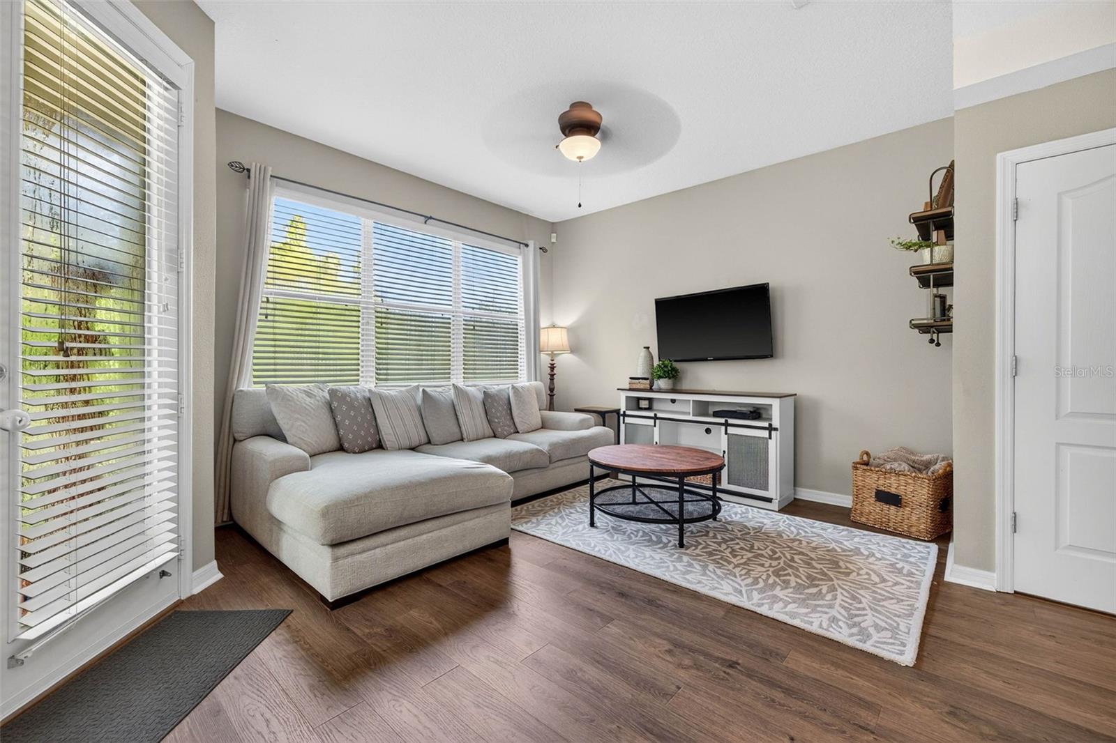 This tastefully updated townhome features 3 spacious bedrooms plus an office, 2.5 baths, and a two-car garage. As you enter the home, you'll notice pride of ownership and the newly installed luxury vinyl floors. Downstairs boasts a bright and inviting family room, a dining nook, and a modern kitchen equipped with granite countertops and stainless-steel appliances. Adjacent to the kitchen, you’ll find a cozy office space with French doors, large windows and an electric fireplace, perfect for working from home or relaxing with a book. The owners have thoughtfully added custom shelving in the under-stairs closet, offering clever storage or an extra pantry. A stylish half bath on the main floor is ideal for guests, and the laundry room is charming with a custom folding shelf and utility sink. Upstairs, the primary suite is a true retreat, featuring tall ceilings, a decorative accent wall, and a spa-like en-suite bathroom with dual sinks and a walk-in shower. The custom walk-in closet includes built-in shelving and drawers to keep everything organized. Two additional bedrooms are generously sized and share a well-appointed bathroom with dual sinks and a separate door for added privacy. This townhome is nestled in a sought-after community in New Tampa with easy access to I75, I275, Flatwoods running/biking trails, restaurants, golf courses, Advent Hospital, Moffitt Cancer Hospital and Advent Center-Ice Rink. The community HOA covers a variety of amazing amenities, including pool, playground, basketball and tennis courts—perfect for active lifestyles and family fun. Cable and internet are also included in the HOA fees, adding even more value and convenience. Don’t miss your chance to make this home yours!