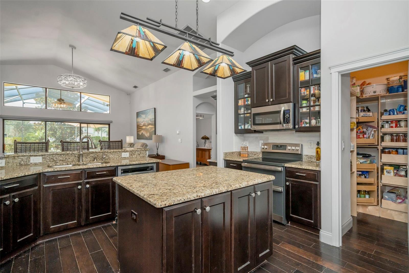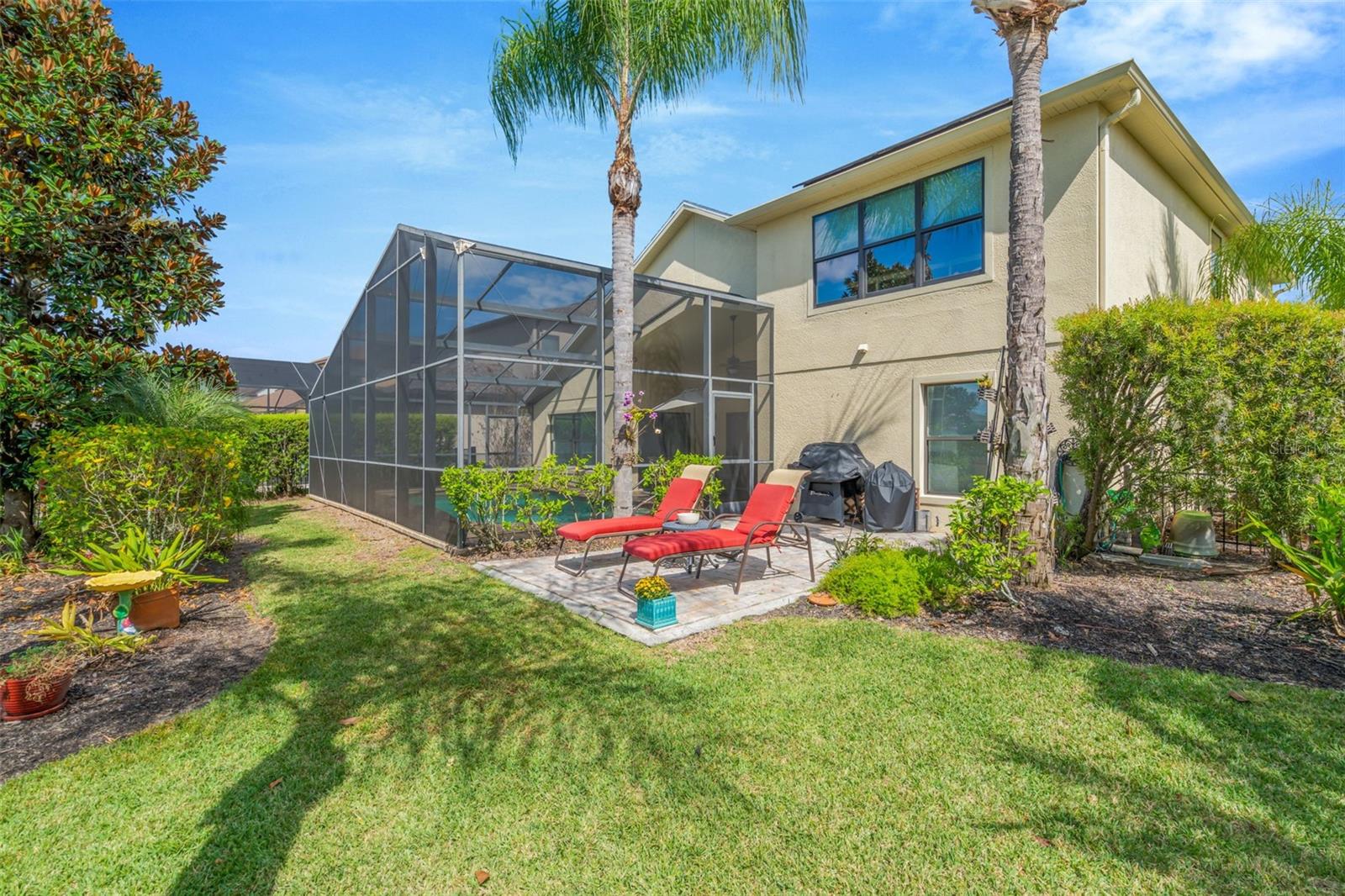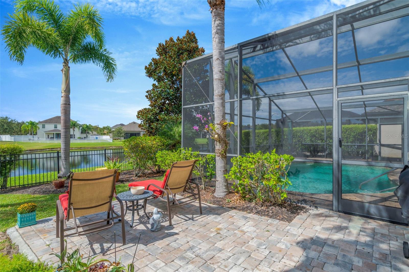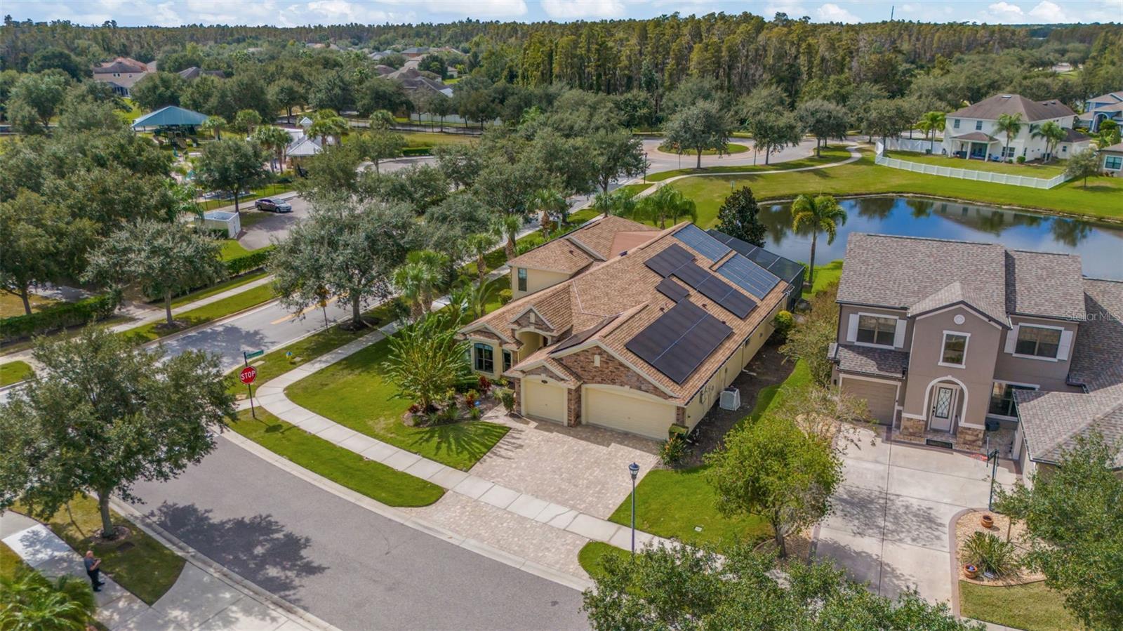 One or more photo(s) has been virtually staged. Elegance and craftsmanship define this stunning corner-lot pool home with pond views and access to community amenities. Wood-look tile flooring, decorative niches, custom window shades, Tiffany-style lighting, French doors to the den, and remote-controlled ceiling fans set the tone throughout. The gourmet kitchen is thoughtful and stylish. Featuring a tiled backsplash, window display cabinetry, breakfast bar, pull-out trash bin, walk-in pantry, and an office nook, all complemented by stainless steel appliances and whole-home pull-out drawer systems. The primary suite offers a serene retreat with a sitting area, lanai access, and a spa-style bath with a jacuzzi tub, walk-in shower, and double vanities. The custom cedar-lined walk-in closet is truly impressive, with hidden jewelry storage, valets, display windows, hamper bins, and plenty of adjustable shelving. Upstairs, a loft with wet bar, mini fridge, and half bath provides versatile living space for entertaining or relaxing. Outdoors, enjoy a heated saltwater pool with nebulous lighting, pavers in the pool and grill areas. OWNED SOLAR for the home and pool means saving thousands a year on electric! Additional features include a 3-car garage, water softener and filtration system with sink dispenser, alarm system, two HVAC systems with UV lights, and a NEW ROOF (2023). With a low HOA in a highly desirable neighborhood, this move-in-ready luxury home truly has it all with so many upgrades and features you have to view for yourself.