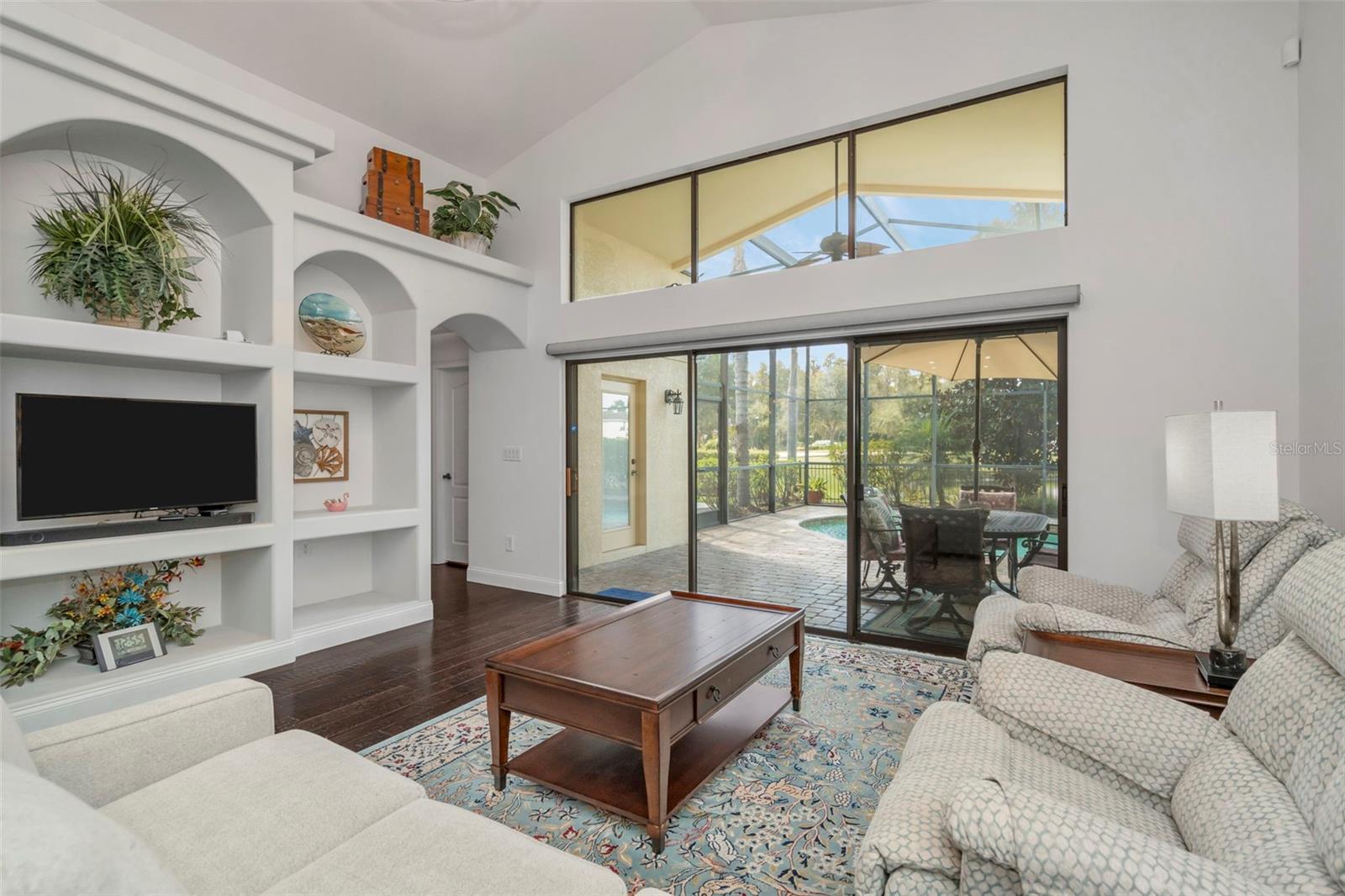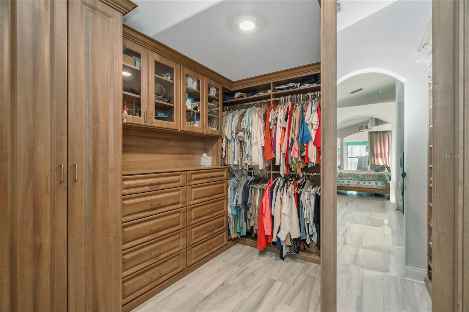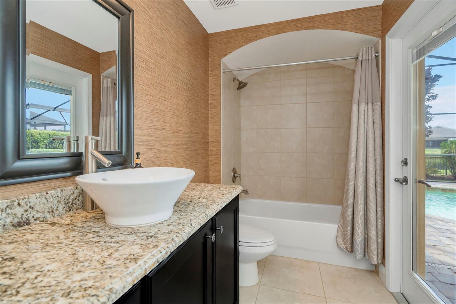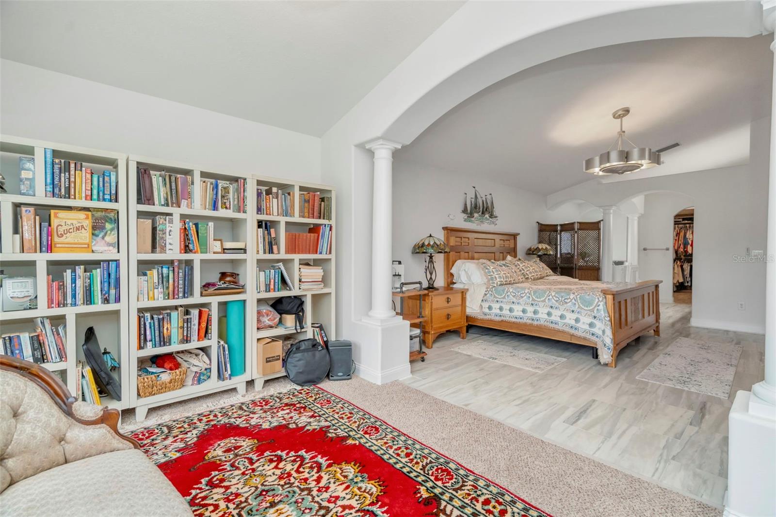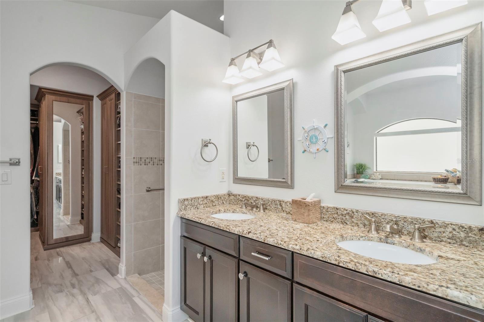 One or more photo(s) has been virtually staged. Elegance and craftsmanship define this stunning corner-lot pool home with pond views and access to community amenities. Wood-look tile flooring, decorative niches, custom window shades, Tiffany-style lighting, French doors to the den, and remote-controlled ceiling fans set the tone throughout. The gourmet kitchen is thoughtful and stylish. Featuring a tiled backsplash, window display cabinetry, breakfast bar, pull-out trash bin, walk-in pantry, and an office nook, all complemented by stainless steel appliances and whole-home pull-out drawer systems. The primary suite offers a serene retreat with a sitting area, lanai access, and a spa-style bath with a jacuzzi tub, walk-in shower, and double vanities. The custom cedar-lined walk-in closet is truly impressive, with hidden jewelry storage, valets, display windows, hamper bins, and plenty of adjustable shelving. Upstairs, a loft with wet bar, mini fridge, and half bath provides versatile living space for entertaining or relaxing. Outdoors, enjoy a heated saltwater pool with nebulous lighting, pavers in the pool and grill areas. OWNED SOLAR for the home and pool means saving thousands a year on electric! Additional features include a 3-car garage, water softener and filtration system with sink dispenser, alarm system, two HVAC systems with UV lights, and a NEW ROOF (2023). With a low HOA in a highly desirable neighborhood, this move-in-ready luxury home truly has it all with so many upgrades and features you have to view for yourself.