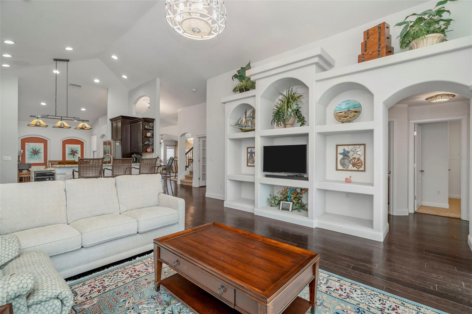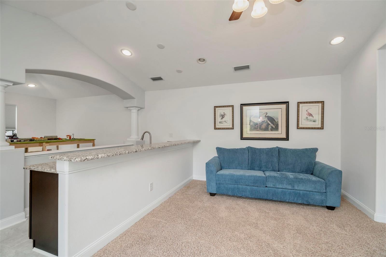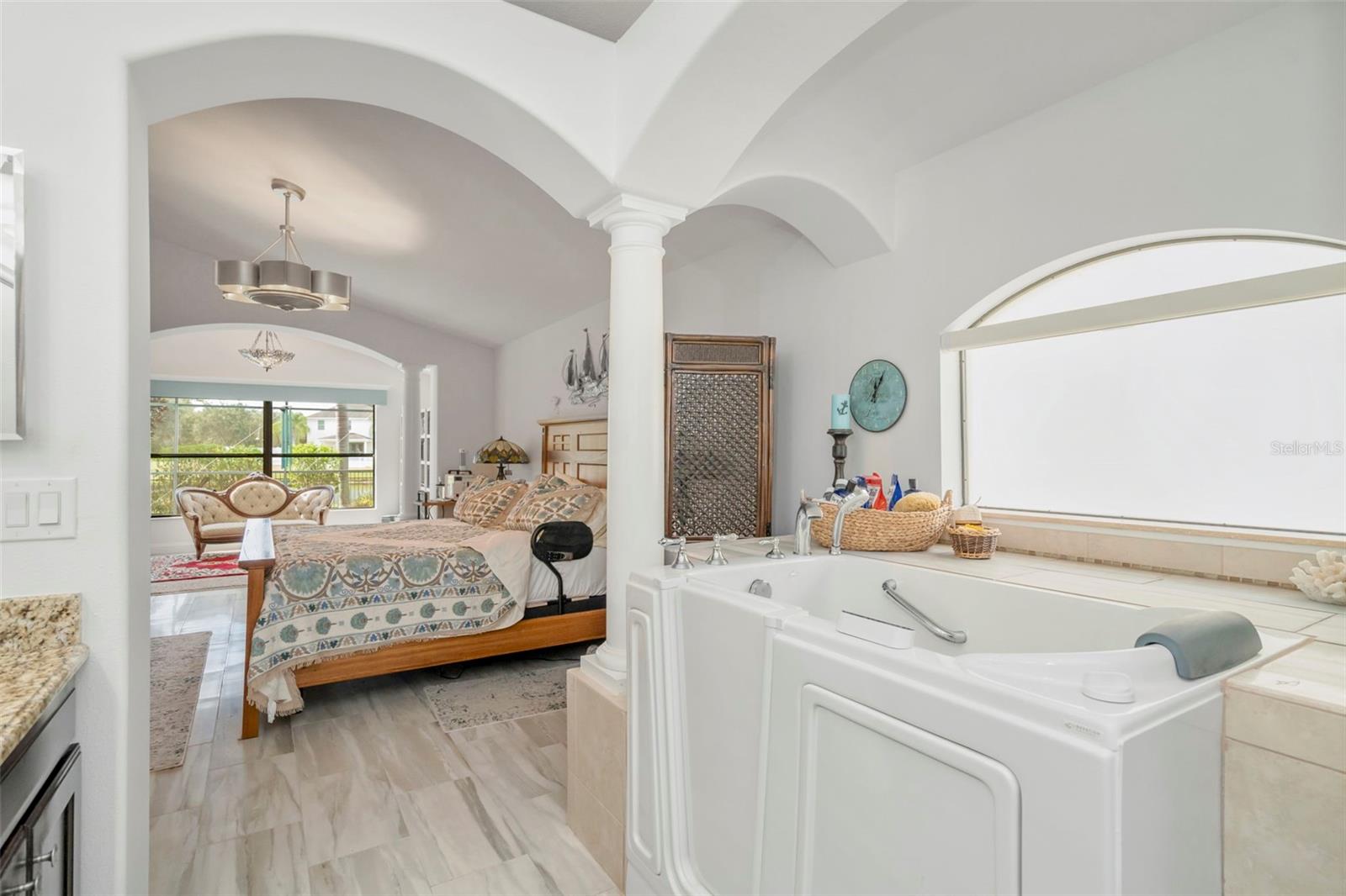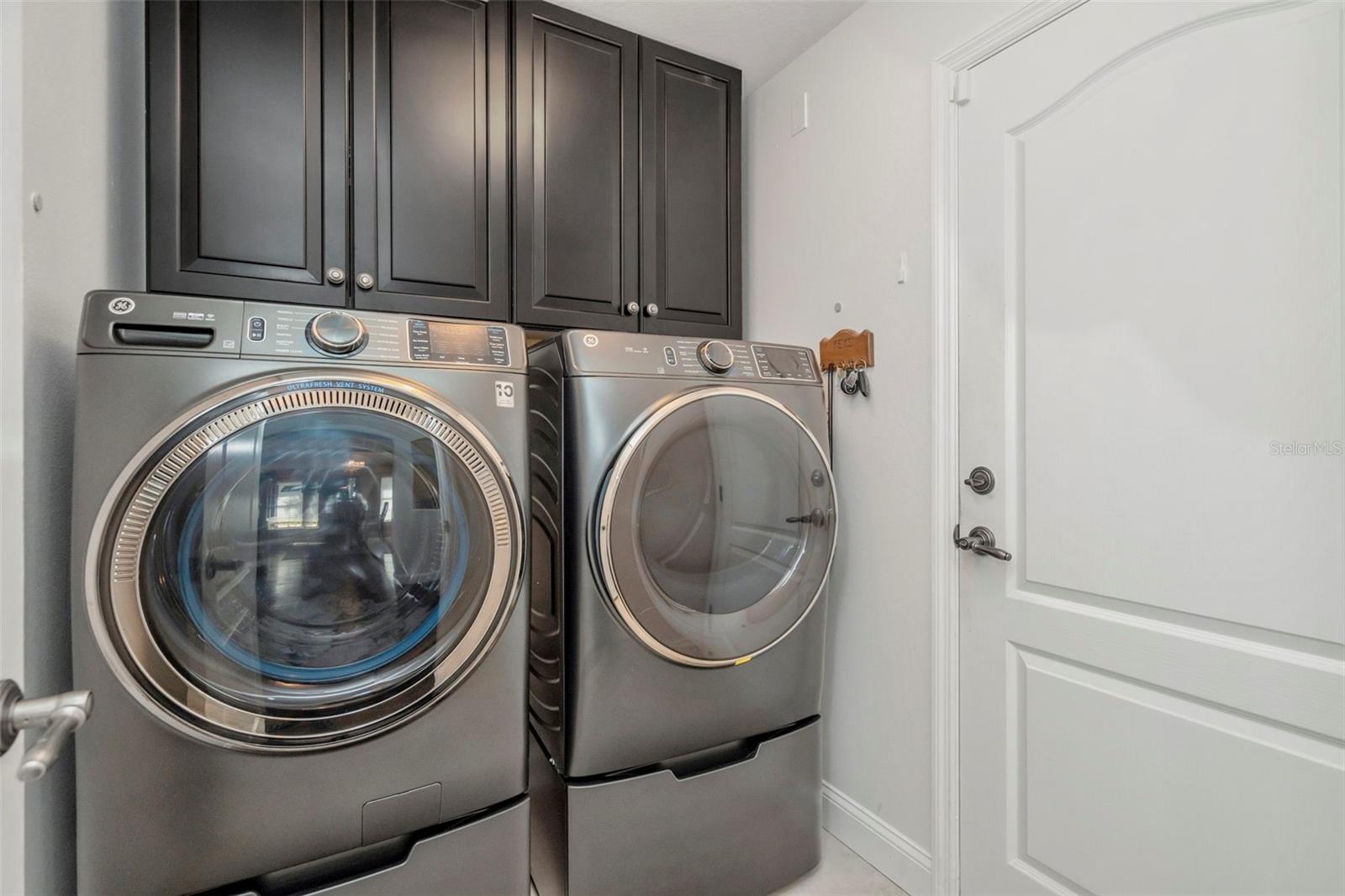 One or more photo(s) has been virtually staged. Elegance and craftsmanship define this stunning corner-lot pool home with pond views and access to community amenities. Wood-look tile flooring, decorative niches, custom window shades, Tiffany-style lighting, French doors to the den, and remote-controlled ceiling fans set the tone throughout. The gourmet kitchen is thoughtful and stylish. Featuring a tiled backsplash, window display cabinetry, breakfast bar, pull-out trash bin, walk-in pantry, and an office nook, all complemented by stainless steel appliances and whole-home pull-out drawer systems. The primary suite offers a serene retreat with a sitting area, lanai access, and a spa-style bath with a jacuzzi tub, walk-in shower, and double vanities. The custom cedar-lined walk-in closet is truly impressive, with hidden jewelry storage, valets, display windows, hamper bins, and plenty of adjustable shelving. Upstairs, a loft with wet bar, mini fridge, and half bath provides versatile living space for entertaining or relaxing. Outdoors, enjoy a heated saltwater pool with nebulous lighting, pavers in the pool and grill areas. OWNED SOLAR for the home and pool means saving thousands a year on electric! Additional features include a 3-car garage, water softener and filtration system with sink dispenser, alarm system, two HVAC systems with UV lights, and a NEW ROOF (2023). With a low HOA in a highly desirable neighborhood, this move-in-ready luxury home truly has it all with so many upgrades and features you have to view for yourself.