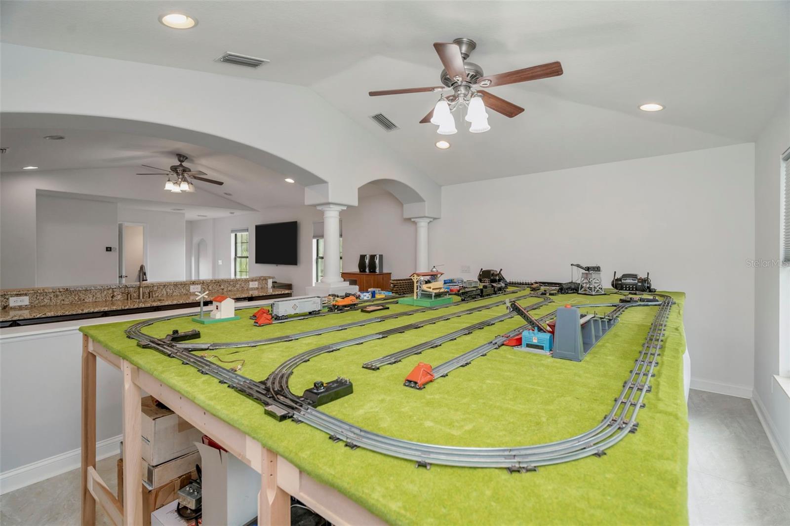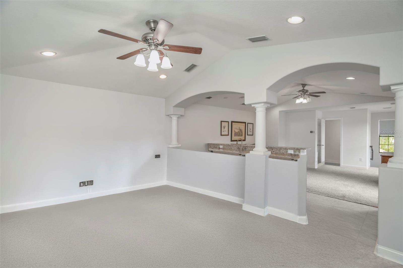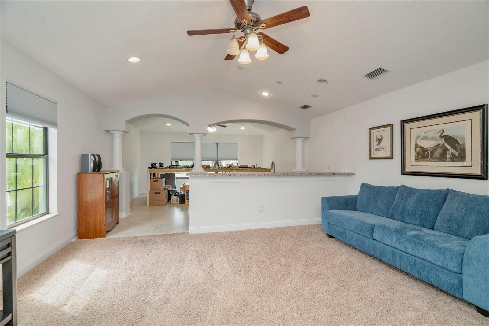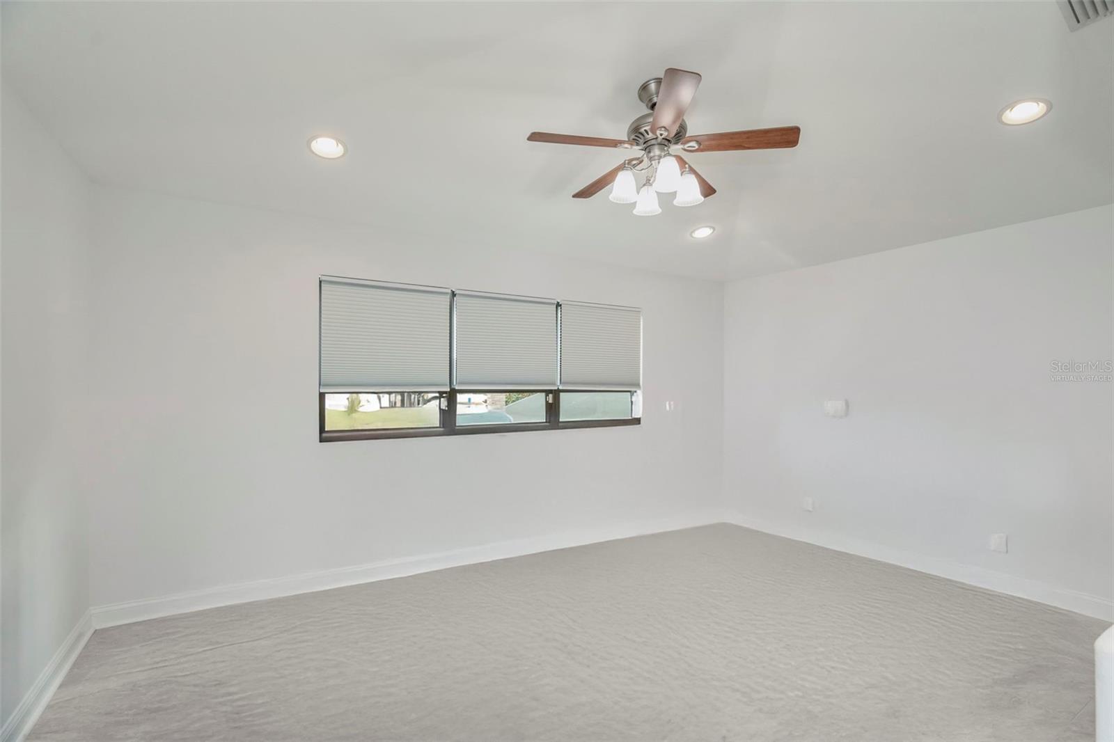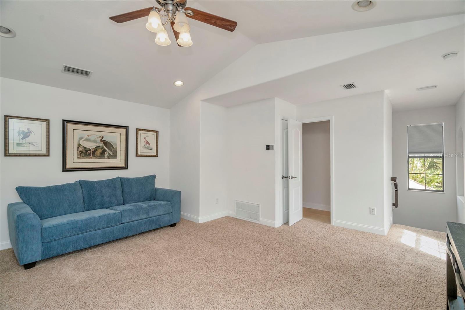One or more photo(s) has been virtually staged. Elegance and craftsmanship define this stunning corner-lot pool home with pond views and access to community amenities. Wood-look tile flooring, decorative niches, custom window shades, Tiffany-style lighting, French doors to the den, and remote-controlled ceiling fans set the tone throughout. The gourmet kitchen is thoughtful and stylish. Featuring a tiled backsplash, window display cabinetry, breakfast bar, pull-out trash bin, walk-in pantry, and an office nook, all complemented by stainless steel appliances and whole-home pull-out drawer systems. The primary suite offers a serene retreat with a sitting area, lanai access, and a spa-style bath with a jacuzzi tub, walk-in shower, and double vanities. The custom cedar-lined walk-in closet is truly impressive, with hidden jewelry storage, valets, display windows, hamper bins, and plenty of adjustable shelving. Upstairs, a loft with wet bar, mini fridge, and half bath provides versatile living space for entertaining or relaxing. Outdoors, enjoy a heated saltwater pool with nebulous lighting, pavers in the pool and grill areas. OWNED SOLAR for the home and pool means saving thousands a year on electric! Additional features include a 3-car garage, water softener and filtration system with sink dispenser, alarm system, two HVAC systems with UV lights, and a NEW ROOF (2023). With a low HOA in a highly desirable neighborhood, this move-in-ready luxury home truly has it all with so many upgrades and features you have to view for yourself.
