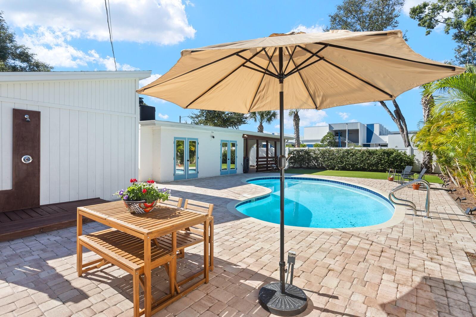 Stunning Mid-Century Modern Adobe-Style Pool Home in coveted South Tampa Norma Park. Located on a desirable corner lot, this beautifully renovated single-story home offers 1,480 sq ft of stylish living space with 4 uniquely designed bedrooms featuring charming brick accent walls and 2 elegant bathrooms. And air-conditioned 140 sqft ADU is currently a large laundry room with custom closets, bringing the total heated living area to 1,620 sq ft. This home went through an extensive renovation in 2021-2022, followed by nearly $96k in owner improvements in late 2022-2025. Impeccable finishes are found throughout, creating a true showpiece that is even more impressive in person. Last year, minor water intrusion (1–2 inches in limited areas due to pool overflow from excessive rain) was promptly and professionally addressed with new porcelain tile floors, updated baseboards, fresh paint, and a new guest bath vanity, restoring the home to pristine condition. Exceptional Indoor–Outdoor Living! The entertaining kitchen layout features a cooking island, breakfast bar, and flows seamlessly into the inviting living room with its cozy brick wood-burning fireplace. Outdoor living shines here with multiple spaces to enjoy year-round including a welcoming front porch, a side patio lined with Agusta Bricks, and a 280 SqFt covered carport/patio area, plus a lush no-mow green turf yard, and a sparkling kidney-shaped pool with a true deep end, surrounded by beautiful pavers and generous lounging areas. Fido even has a fenced side yard with a plush green no-mow turf. The outdoor shower has hot water too, and is attached to the back of the ADU. The ADU currently serves as a laundry and storage space with newer full-size washer/dryer and custom closets. However, existing hookups inside the main home allow easy relocation of the laundry, opening the possibility of transforming the ADU into a studio, office, pool house, or playroom. This is a neighborhood on the rise. Families and future resale value benefit from proximity to the highly regarded Kenneth E. Adum K-8 Magnet and IB Candidate School, a growing asset to the beloved Norma Park community. This exceptional home offers versatility, style, and a resort-like lifestyle in one of South Tampa’s most desirable neighborhoods. Do not miss seeing this property. Furnishings can be sold separately. Schedule a showing today!