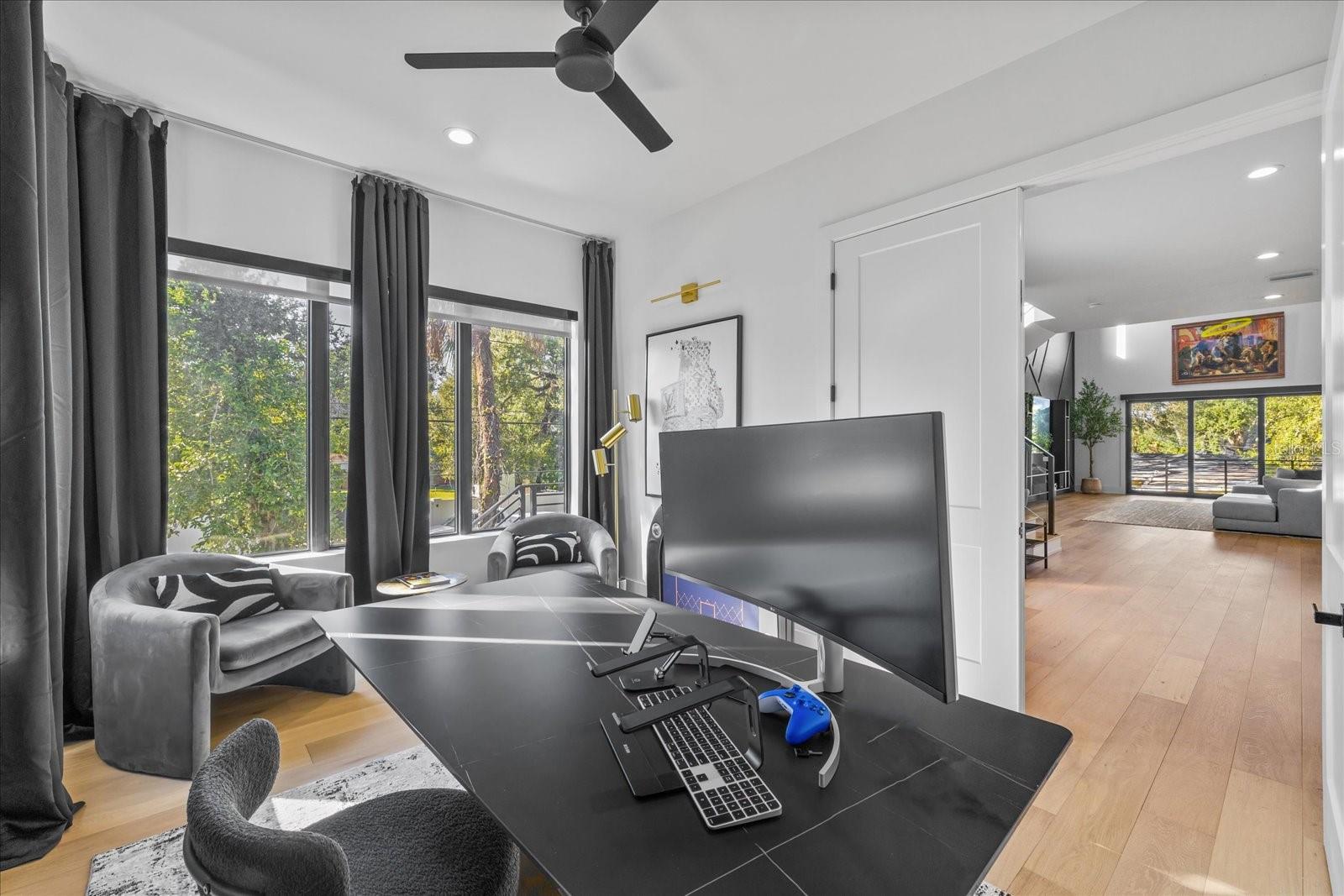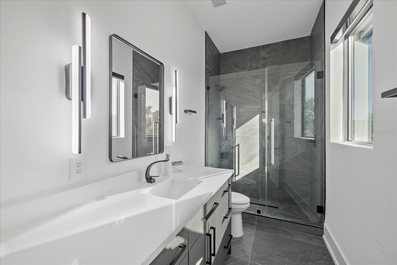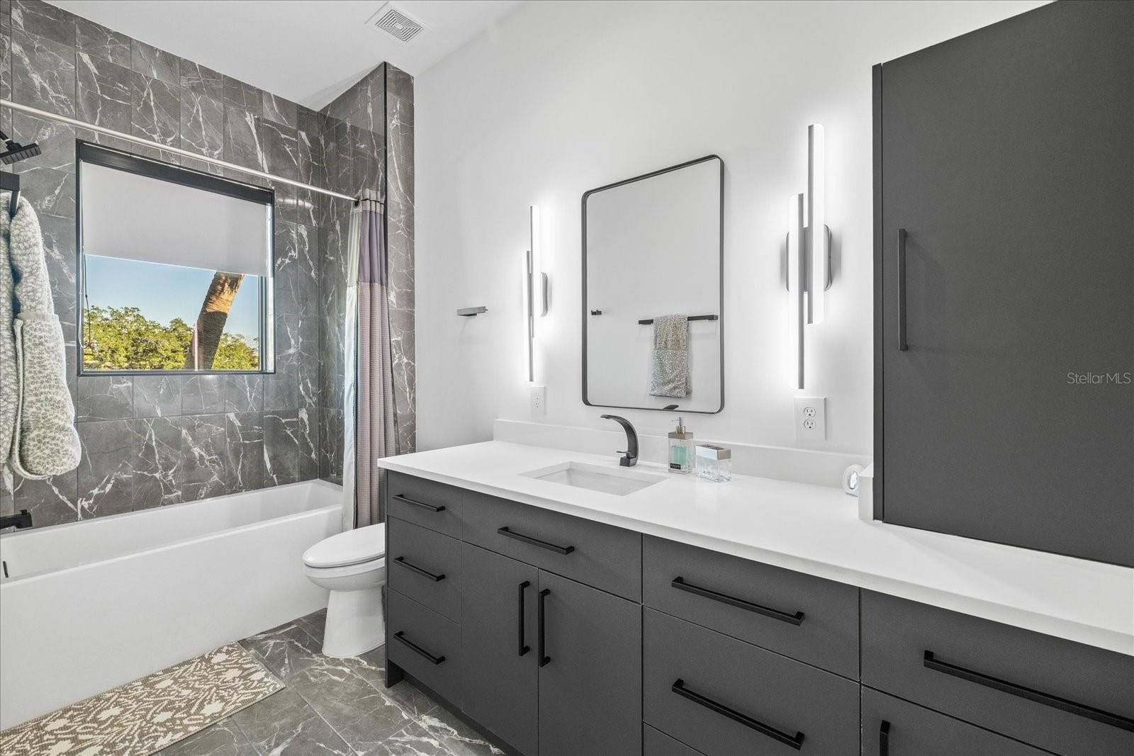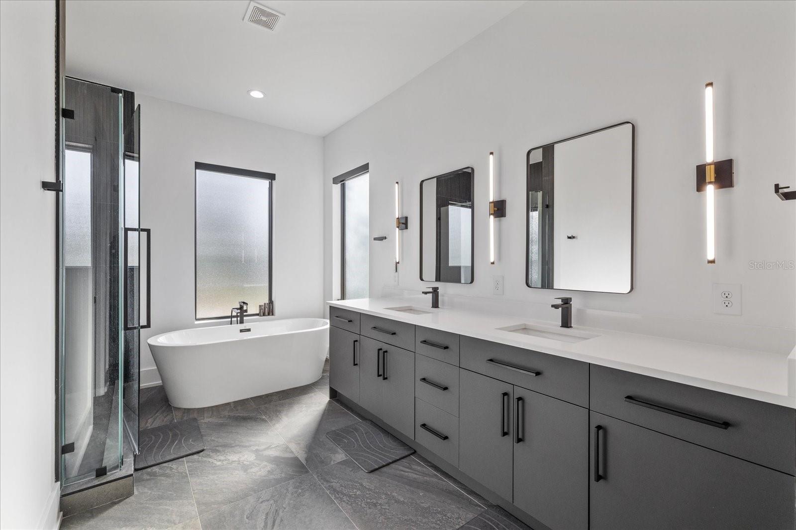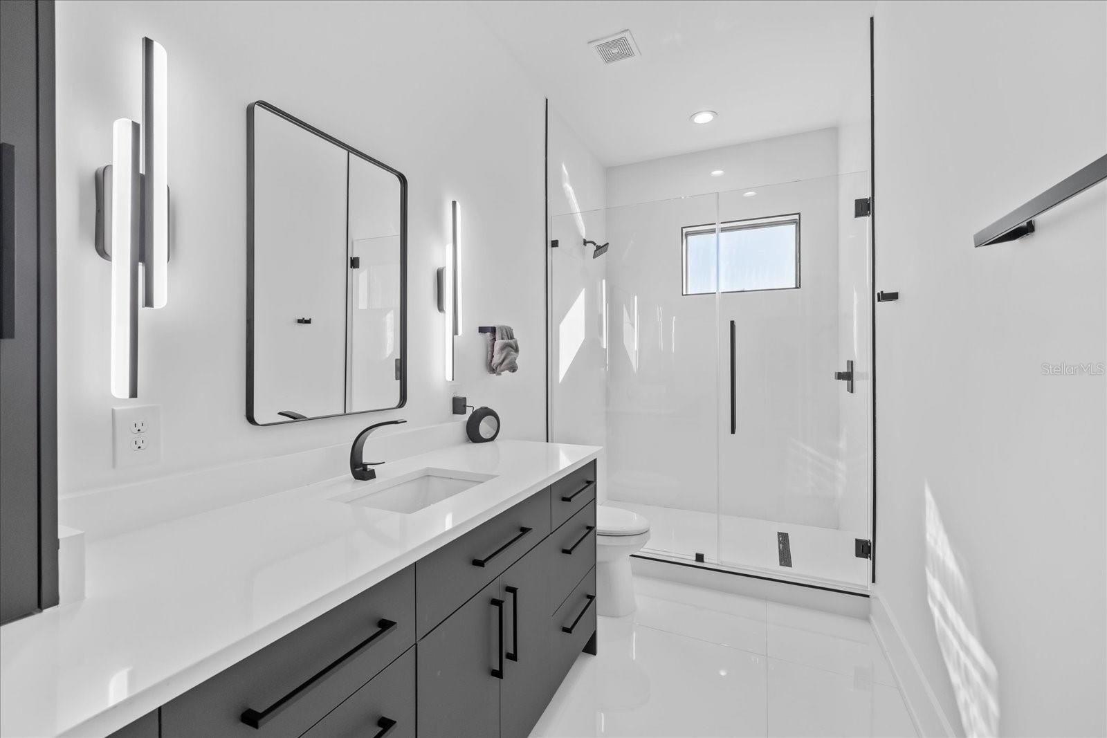 Located in the heart of Sunset Park, this modern South Tampa residence offers 4 bedrooms, 4.5 baths, and 4,200 square feet of beautifully designed living space. This 3 story home showcases a clean, contemporary aesthetic with impressive upgrades throughout. The main level features an open layout anchored by a spacious family room with a custom accent wall and a chef’s kitchen with double waterfall islands, sleek black cabinetry, professional ZLINE appliances, and a wine bar with refrigeration. Brand new European Oak hardwood flooring enhances the entire downstairs, creating a warm contrast to the modern finishes, and upgraded electric window shades provide added comfort and privacy. The main level also includes a dining room, office, and powder bath. The primary suite is located on the main level and offers a private terrace, a custom walk-in closet, and a spa-style bath with a soaking tub, a 10 foot frameless glass shower, slate flooring, and floor-to-ceiling tile. Upstairs are 3 additional ensuite bedrooms, each with large walk-in closets, plus a full laundry room for convenience. Outdoor living includes a covered terrace overlooking the private pool with waterfall spa, paver patio, and fenced side yard. Additional features include impact windows and doors, a glass stairway and railing system, a state-of-the-art security system, and an oversized garage spanning the entire first floor with parking for 10 plus vehicles, storage, and flex space. The location offers quick access to Tampa International Airport, St. Pete/Clearwater Airport, Midtown, Water Street, Hyde Park Village, beaches, dining, shopping, and top rated schools.