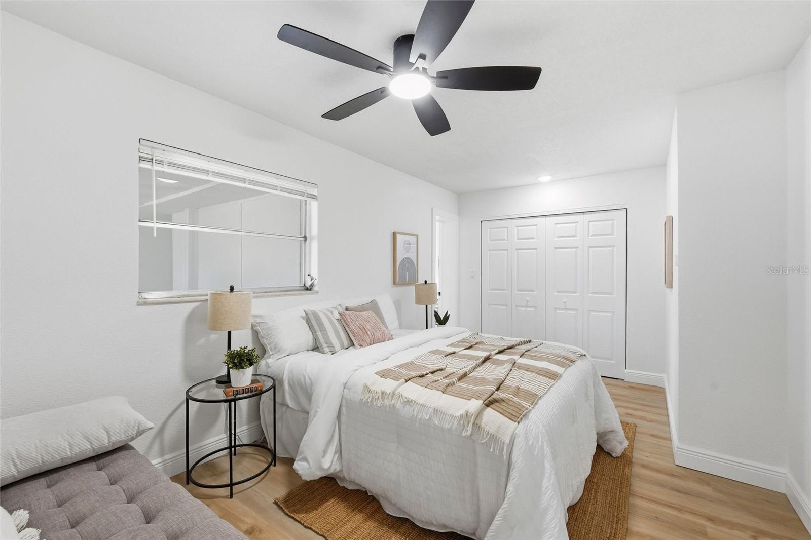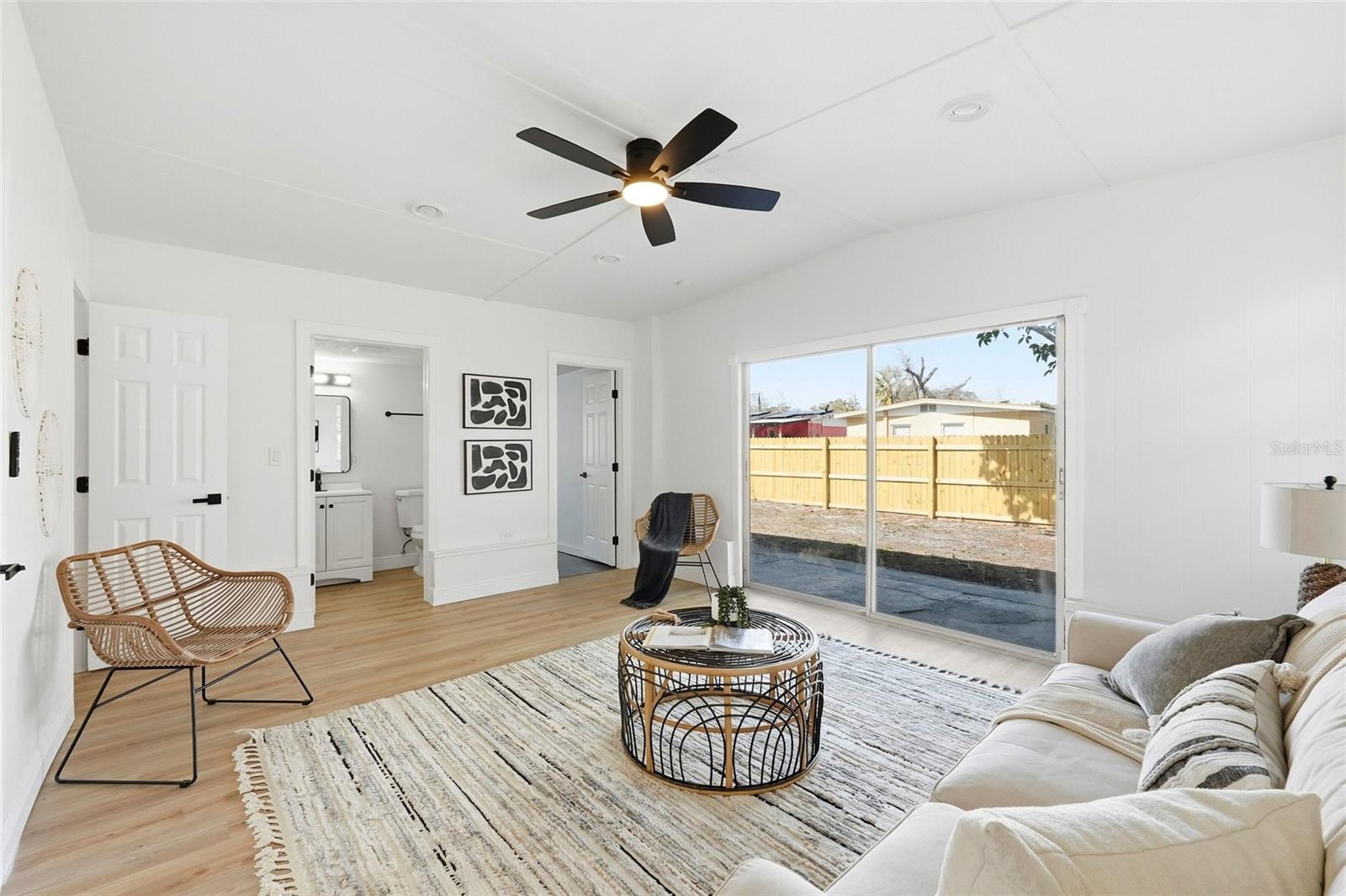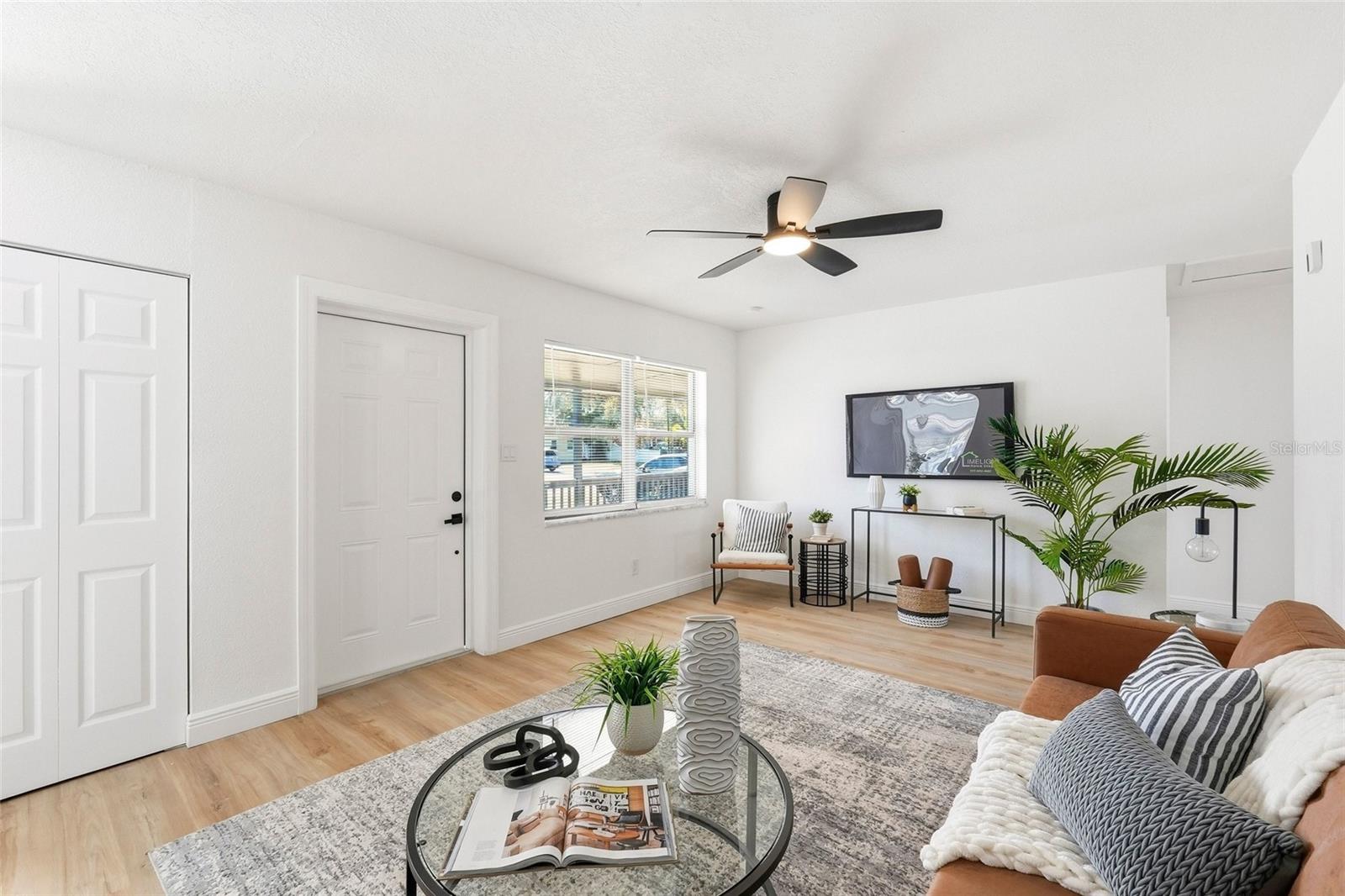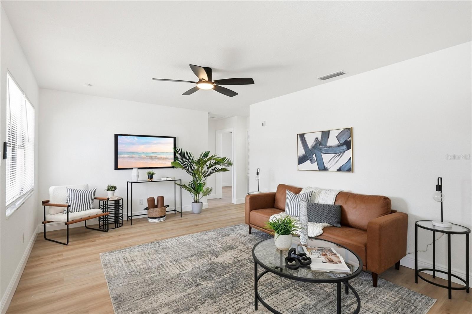 Discover this beautifully renovated SANCTUARY tucked quietly away in the Tilsen Manor Community. This home features 3 bedrooms and 2 elegant bathrooms. The modern kitchen, complete with Quartz Countertops and Stainless-Steel Appliances, opens up to a spacious living room and dining room. This home can accommodate a large family with an additional large family room with high ceilings and an additional office/flex room that could easily be used as an additional bedroom. *LARGE INDOOR LAUNDRY ROOM*. The property sits on a generously sized lot and is equipped with a single vehicle carport, large driveway, and a large covered front porch that is perfect for relaxing. Retreat to your new FULLY FENCED IN BACKYARD with a LARGE STORAGE SHED. This home has a BRAND-NEW 2025 ROOF which will provide peace of mind for years to come! With NO HOA or CDD FEES, this home is even more appealing. Don't miss the chance to make this home yours!