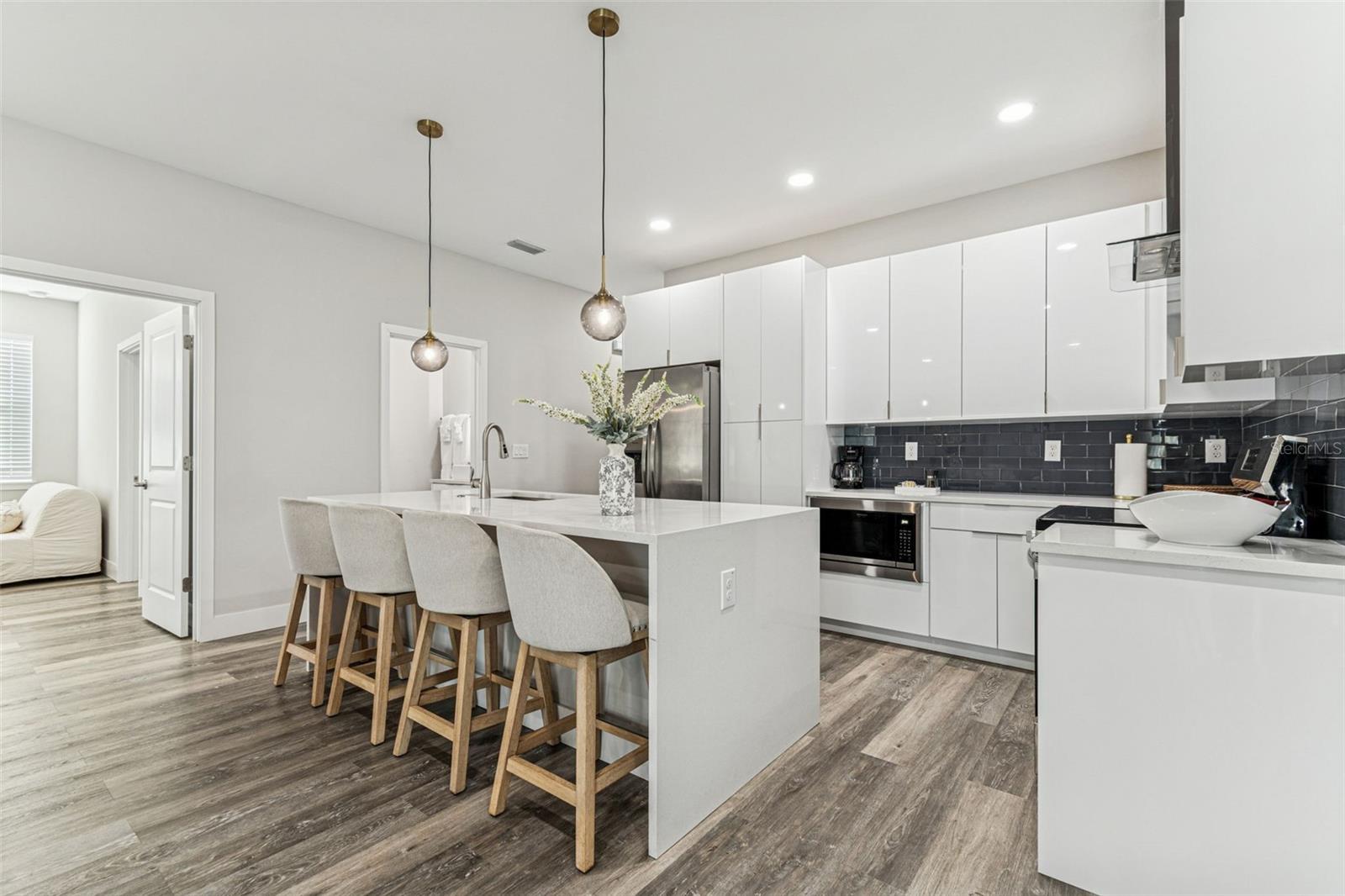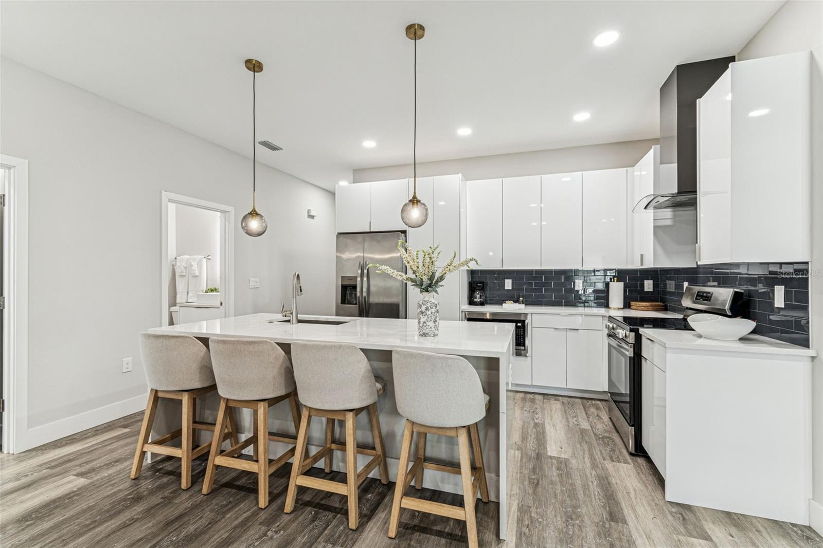 Built in 2024, this refined 4-bedroom, 3-bath residence offers a rare opportunity to accommodate multi-generational living, a private guest suite, or a discreet income-producing space, all while maintaining the elegance and cohesion of a single luxury home. The main residence features three bedrooms and two bathrooms, thoughtfully designed with 9-foot ceilings, abundant natural light, and luxury vinyl plank flooring throughout, creating a seamless, contemporary aesthetic. At the heart of the home, the island kitchen showcases sleek modern cabinetry, a designer backsplash, waterfall-edge quartz countertops, and stainless steel appliances, perfectly suited for both everyday living and elevated entertaining. The primary suite serves as a private retreat, offering a spacious walk-in closet and a spa-inspired bath complete with double vanities, illuminated mirrors, a soaking tub, and an expansive rain shower, delivering a true sense of relaxation and refinement. A separate bedroom and bathroom with a private entrance provides exceptional versatility, ideal for extended family, long-term guests, a home office, or a curated rental opportunity, allowing privacy and independence. Outdoors, the fully fenced and irrigated backyard offers a tranquil setting for entertaining or quiet enjoyment, further enhancing the home’s livability. With no HOA or CDD, ownership remains effortless and unrestricted. Ideally positioned in the heart of Tampa, this residence offers convenient access to Tampa International Airport, Hyde Park, Armature Works, Midtown, and Tampa’s cultural and entertainment destinations, blending lifestyle, location, and long-term value. The residence is currently operated as a short-term accommodation, offering the next owner the flexibility to continue income-producing use or transition the home seamlessly into a primary residence or multi-generational retreat.