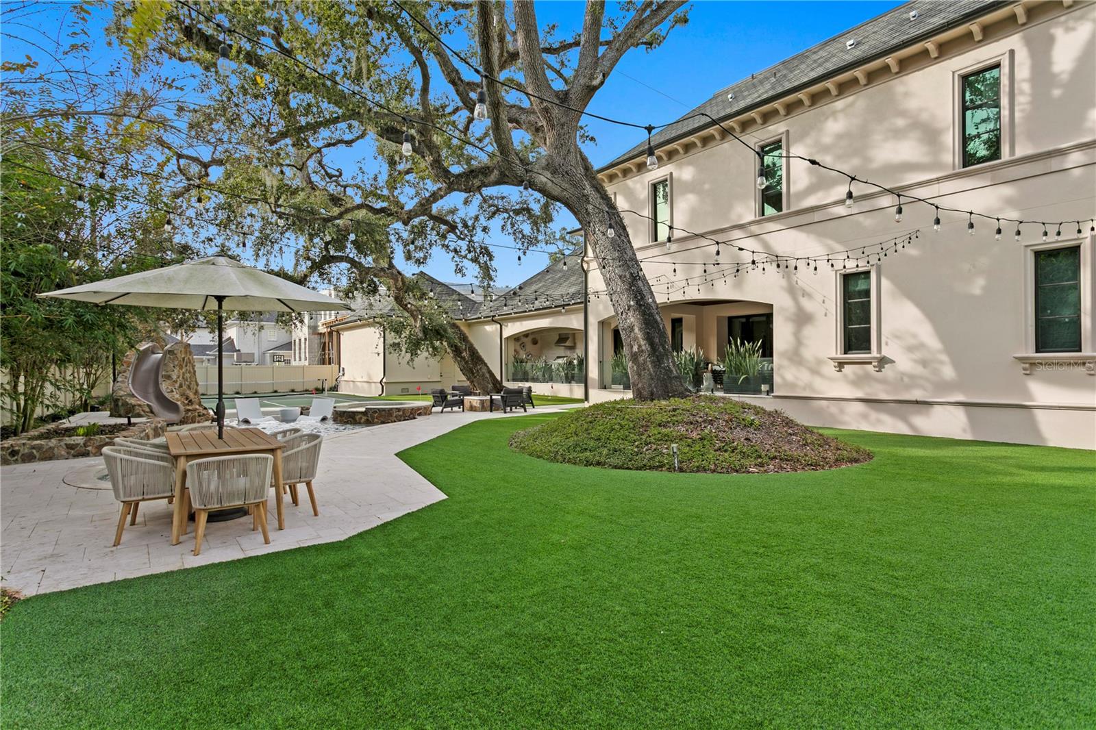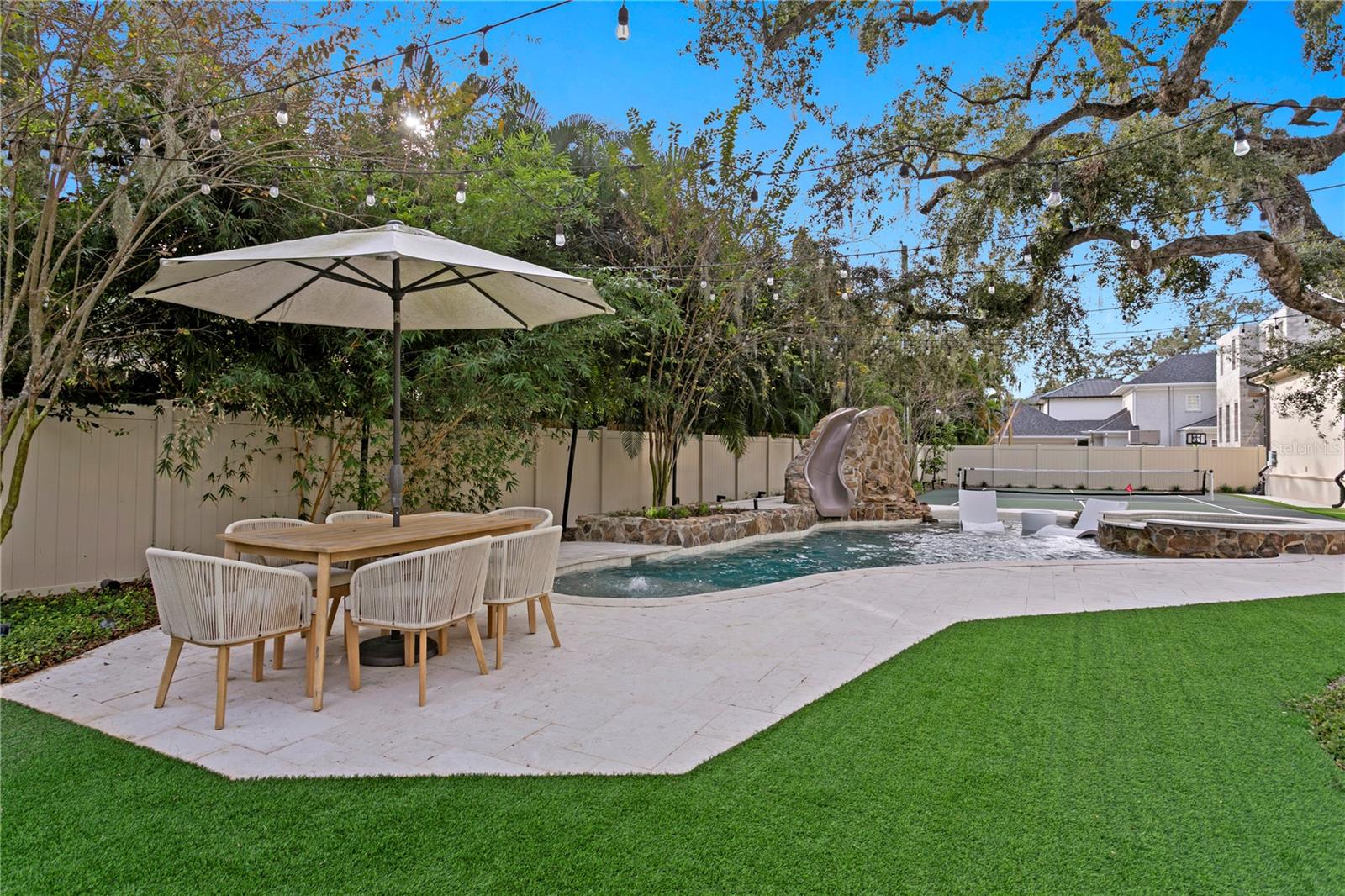 An exceptional Windstar custom-built estate in South Tampa’s coveted Beach Park neighborhood, where refined design meets resort-style living. Completed in 2018 and enhanced in 2022, this impressive residence spans over 6,200 square feet and is thoughtfully designed for elevated everyday living and unforgettable entertaining. At the heart of the home is a gourmet kitchen—a true culinary showpiece—featuring dual oversized islands, ideal for hosting and gathering. Outfitted with Sub-Zero refrigeration, a Wolf gas range, two dishwashers, two sinks, an expansive walk-in pantry, and ample storage space. This kitchen seamlessly blends function and performance, making it a standout for chefs and entertainers alike. The home offers five bedrooms, five full bathrooms, and two half bathrooms, including a luxurious primary suite retreat complete with a cozy gas fireplace, custom closets, and separate his-and-her bathrooms designed for comfort and privacy. Additional interior amenities include an elevator, a spacious laundry room with dual washers and dryers with dedicated crafting space, and abundant storage throughout. Outdoor living is nothing short of extraordinary. Set on an oversized 140 x 144 lot (approximately 0.46 acres), the backyard has been designed as a private resort, featuring a freshly resurfaced pickleball court, putting green, gas fire pit, and a resort-style swimming pool with a slide, all surrounded by generous green space for recreation and relaxation. The first-floor living room opens seamlessly to an expansive covered lanai with phantom electric screens and a fully equipped summer kitchen, creating the ultimate indoor-outdoor entertaining experience. Car enthusiasts will appreciate the two two-car garages with three lifts, offering space for up to seven vehicles. A third-floor bonus room with a full bath and closet provides flexible use as a fifth bedroom, guest or nanny suite, fitness studio, or playroom. The first floor also includes a large bonus/playroom, home office, and family room—each designed for comfort and versatility. Completed with a Generac Home Generator, this exceptional Beach Park estate delivers a rare combination of luxury, lifestyle, and functionality in one of South Tampa’s most desirable neighborhoods.