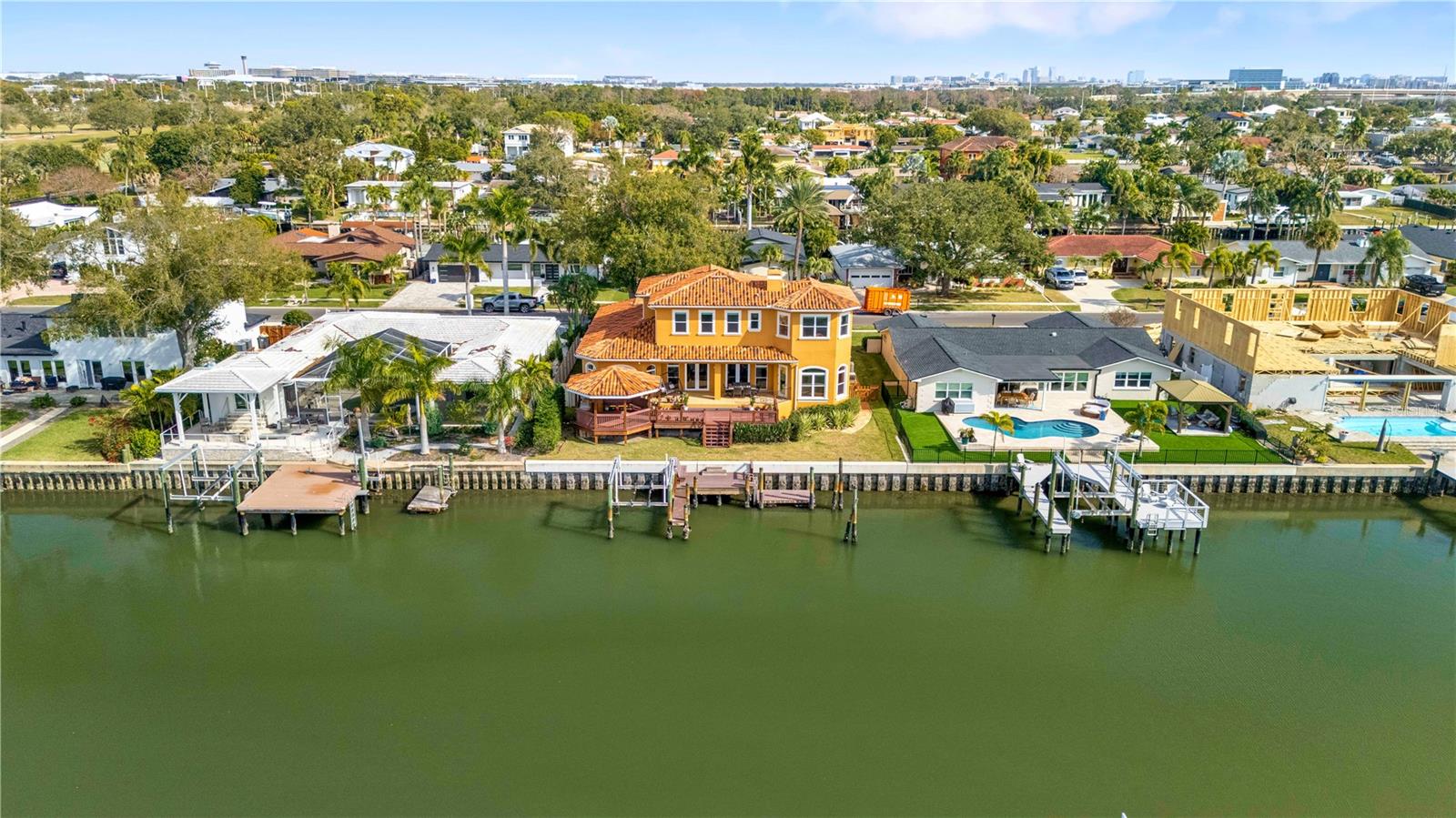 Welcome to an exceptional coastal retreat offering 5 bedrooms, 4 bathrooms, and 4,189 square feet of refined living space, perfectly positioned in the highly sought-after Dana Shores waterfront community. This stunning residence blends timeless elegance with relaxed coastal luxury, all set against the backdrop of breathtaking Tampa Bay views. Wake up each morning to the shimmer of the water and step outside to your private boat dock, ready for sunset cruises, fishing adventures, or a quick ride to open bay waters. This home is designed for those who crave both sophistication and the freedom of a true waterfront lifestyle. Inside, a magnificent open floor plan showcases artful craftsmanship, graceful architectural archways, and expansive living spaces ideal for both everyday comfort and upscale entertaining. The home flows effortlessly, creating a warm yet luxurious atmosphere throughout. Wine enthusiasts will appreciate the sophisticated wine cellar, perfect for showcasing and storing your collection. The primary suite is conveniently located on the main floor, offering a peaceful retreat complete with a spacious en-suite bath designed for relaxation. Each additional bedroom is generously sized, and with bathrooms thoughtfully positioned to provide comfort and privacy, the layout easily accommodates family and guests alike. Step outside to your own private oasis featuring an inviting outdoor gazebo with a built-in grill, the perfect setting for waterfront gatherings, sunset dinners, and unforgettable evenings under the Florida sky. Ideally located, you’ll enjoy quick access to popular waterfront dining spots like Whiskey Joe’s and Bahama Breeze, nearby executive golf courses, and easy boating routes to Clearwater and St. Petersburg. This is more than a home — it’s a lifestyle of luxury, leisure, and life on the bay. Don’t miss your opportunity to own one of Dana Shores’ standout waterfront properties.