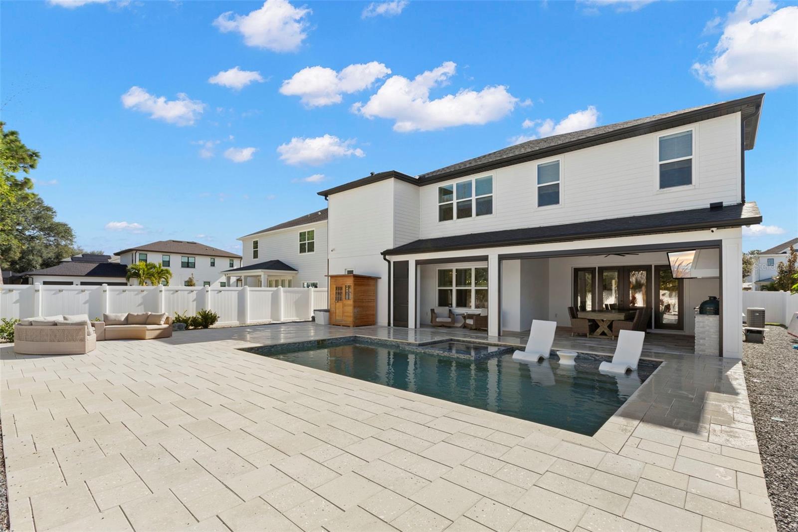 This newer construction luxury pool home blends refined craftsmanship, intentional design, and exceptional livability across 4,476 square feet. Offering 5 bedrooms, 4.5 bathrooms, and a 2-car garage, the residence is thoughtfully designed for both everyday comfort and elevated entertaining. The heart of the home is a designer chef’s kitchen, featuring an expansive 11-foot island, apron-front sink, gas Fisher & Paykel appliance package, 36" gas cooktop, built-in oven and microwave, double-drawer dishwasher, refrigerator and freezer towers, pot filler, custom soft-close cabinetry, walk-through pantry, and ambient LED under-cabinet lighting. The first floor is exceptionally well appointed, offering a study, dining room, expansive great room with French doors leading to a covered lanai with retractable exterior screens, guest suite, gym / secondary office / flexible space, prep pantry, and mudroom. Custom pavers extend the outdoor living space, enhancing both functionality and visual appeal. Upstairs, the primary suite provides a private retreat, complemented by a recreation room, three additional bedrooms with walk-in closets, two full bathrooms, and an efficiently located laundry room connected to the primary closet. Notable upgrades include impact-rated windows, smooth drywall, Elan home automation, remote video doorbell, in-wall pest control system, 8-foot interior doors, whole-home audio, USB outlets, spray foam insulation, and an 18-SEER multi-zoned Carrier HVAC system. The property is positioned on a quiet residential street while being just minutes to Downtown Tampa, Tampa International Airport, major shopping destinations, dining, and everyday essentials. Nearby public schools include Mabry Elementary School, Coleman Middle School, and Plant High School. The home is not located in a flood zone.