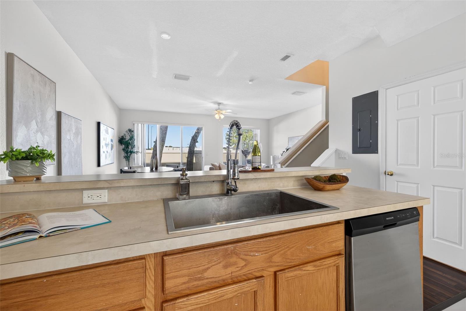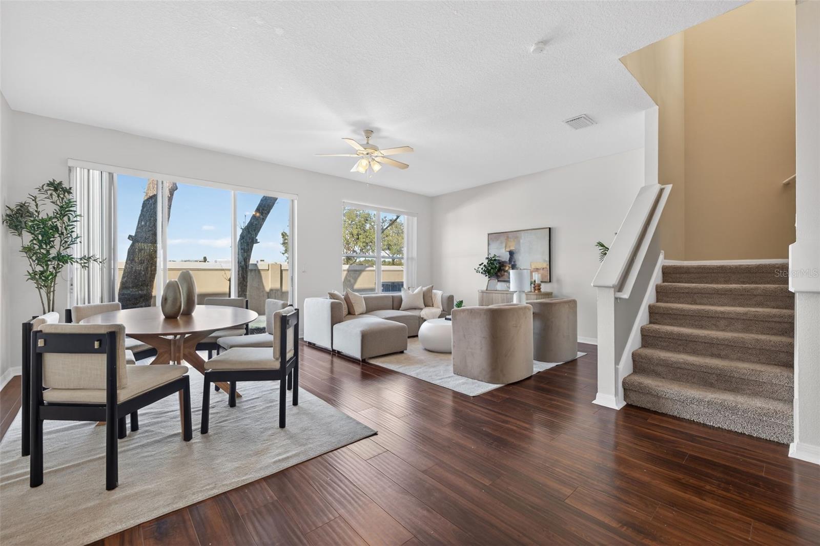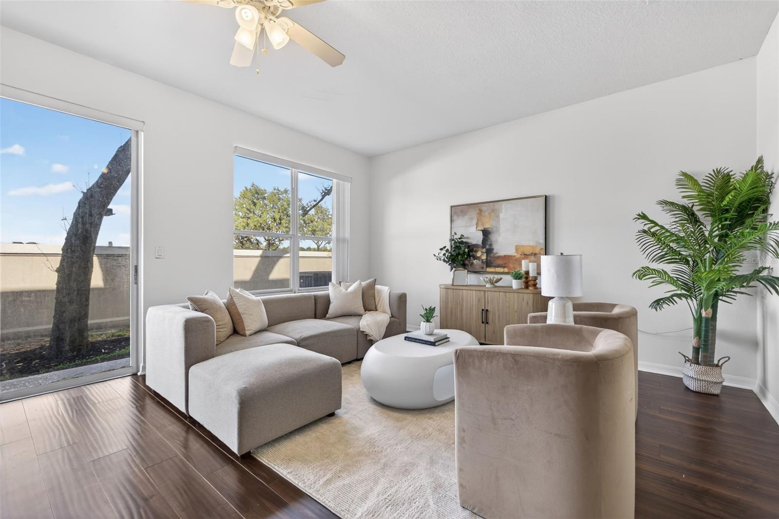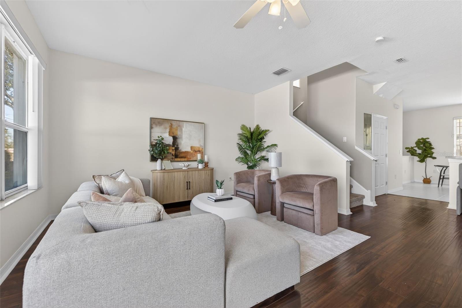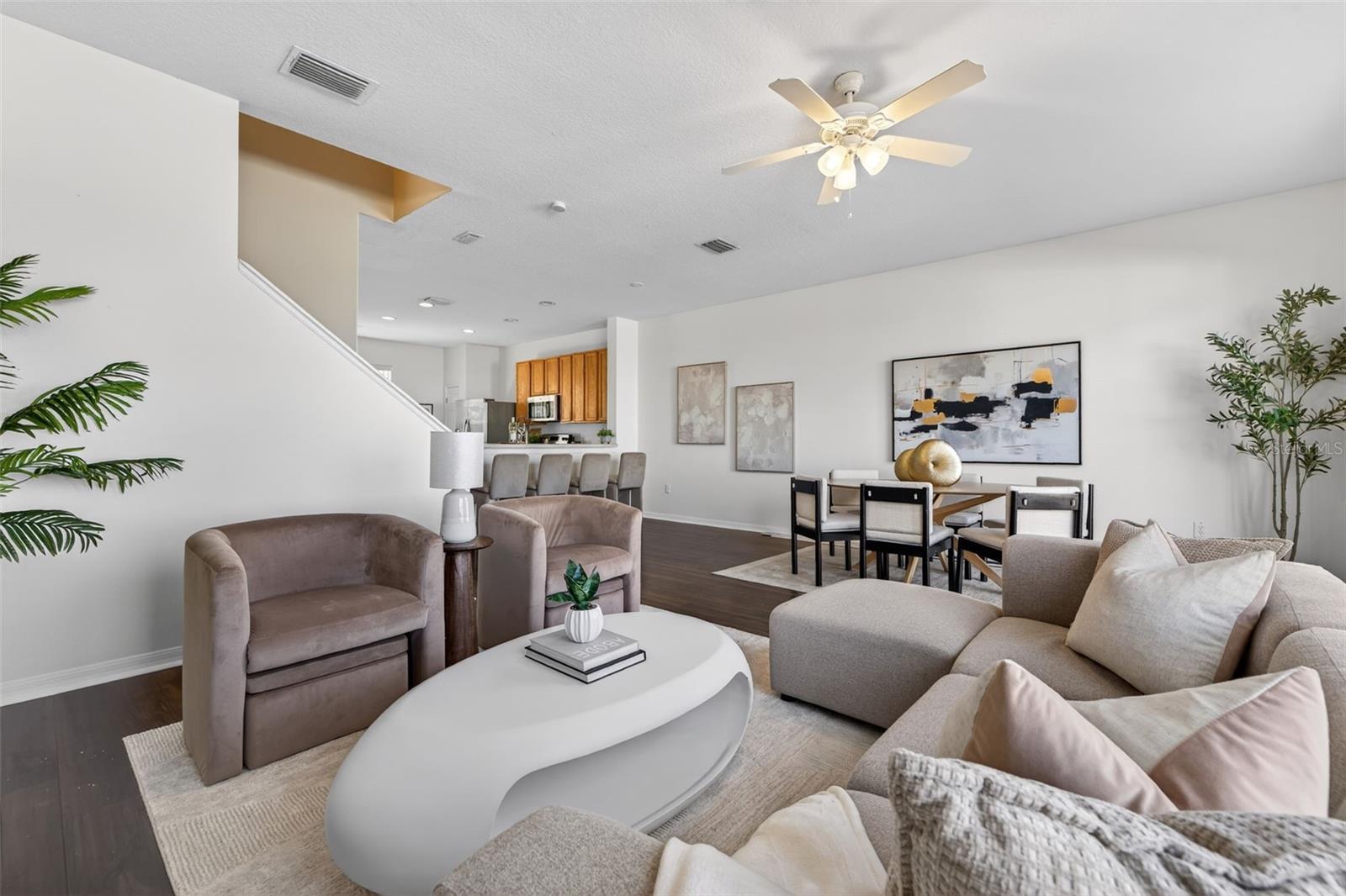 End unit townhome centrally located in Carrollwood with a welcoming front patio, tall ceilings, and a clean, open layout. The main level features a kitchen with stainless steel appliances, ample cabinet space, and a breakfast bar that opens to the dining and living areas with LVP flooring and large windows. Sliding doors lead to a small backyard space, perfect for pets, relaxing, or enjoying a bit of fresh air. Upstairs includes spacious bedrooms, including a sizable primary suite with tray ceilings and en suite primary bathroom. Neutral finishes throughout make this home move in ready and easy to personalize, while the end unit location adds extra privacy. Conveniently located just 15 to 20 minutes from Tampa International Airport and only a few minutes from major shopping centers including Publix and Walmart.