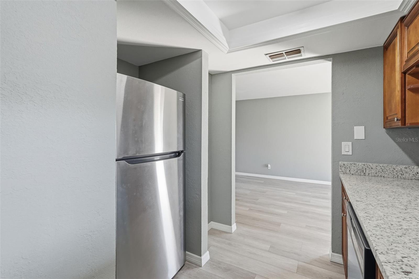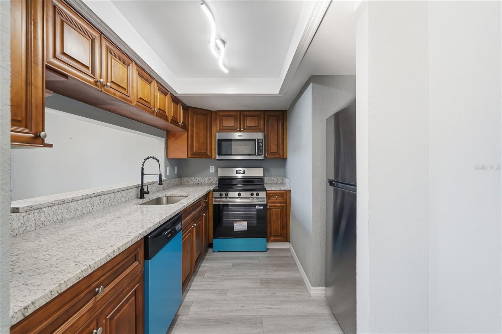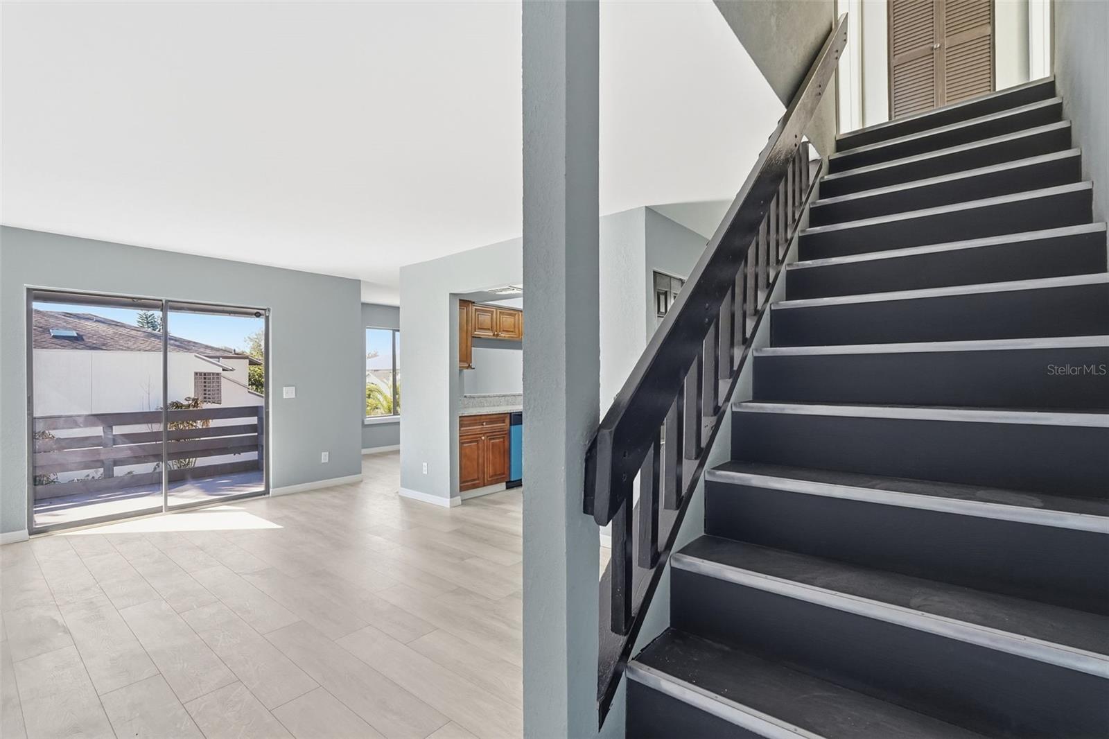 One or more photo(s) has been virtually staged. Fully renovated 3-story end-unit townhouse offering style, space, and turnkey convenience. Recent updates include new stainless steel appliances, granite countertops in the kitchen, and a raised breakfast bar with seating for four, perfect for entertaining or casual dining. The home also features fresh interior paint from top to bottom, modern light fixtures, and luxury vinyl plank flooring throughout. Slate look LVP flooring on the stairs & entry way. Both bathrooms have been upgraded with new vanities and mirrors, as well as refinished bathtubs and porcelain tile on the walls. Additional improvements include new entry and interior doors and a freshly recoated garage floor. Enjoy functional everyday living with a large second-floor laundry room, while both large bedrooms feature ceiling fans, en-suite baths, and oversized walk-in closets providing tons of storage storage. The end-unit location provides added privacy and extra natural light, and the 2nd story covered patio overlooks the front of the home and large common area. The HOA fee includes water and exterior maintenance, helping simplify monthly ownership and reduce upkeep responsibilities. Move-in ready and thoughtfully updated—ideal for homeowners or investors seeking a low-maintenance property with major improvements already completed. Conveniently located near 275, and a short drive to USF.