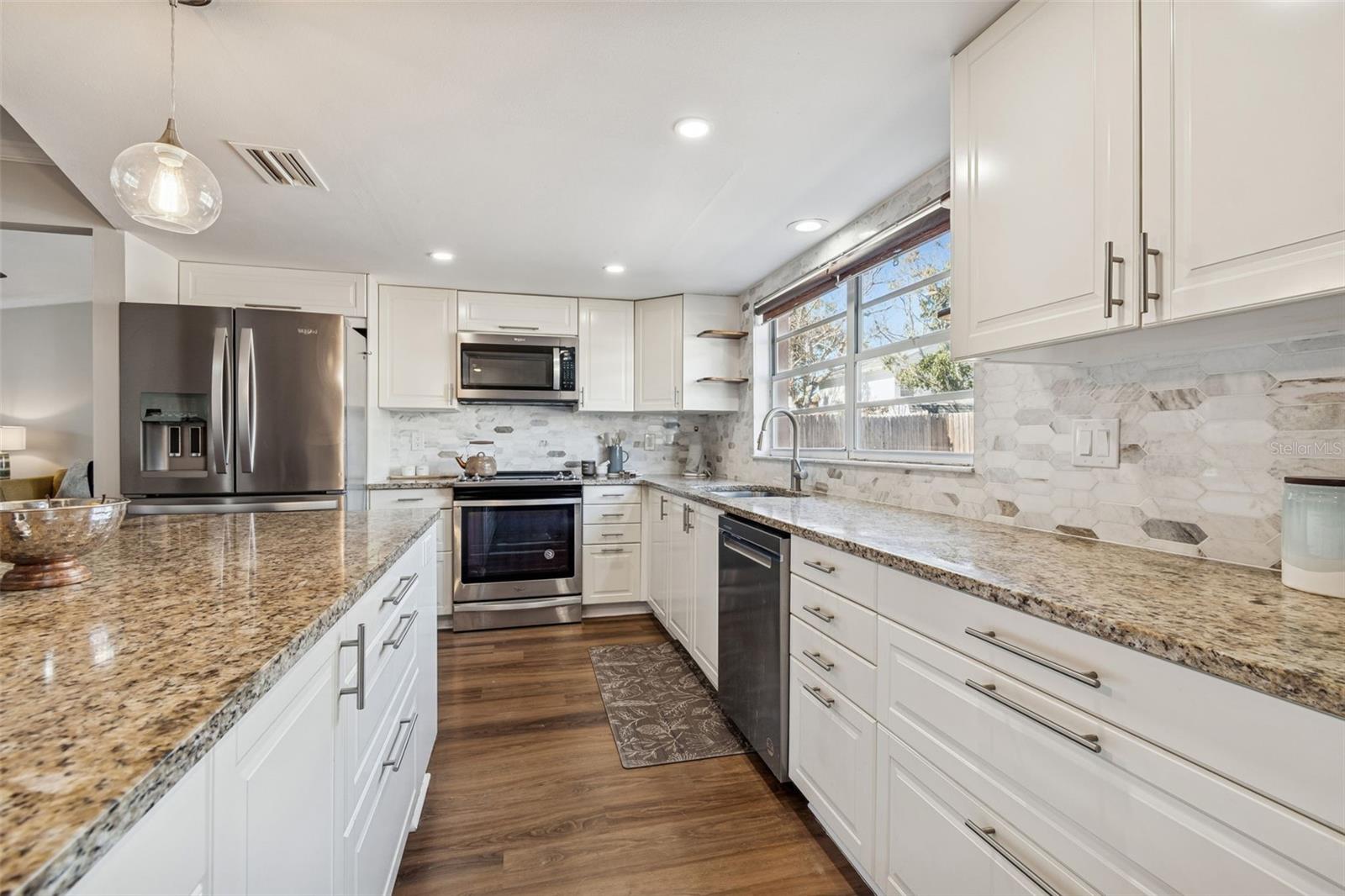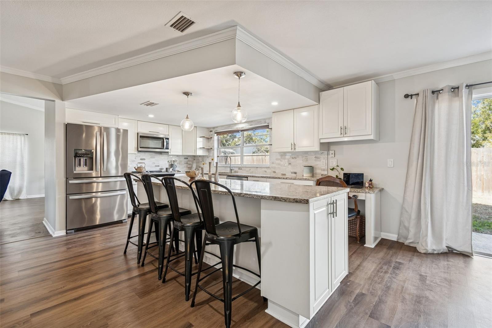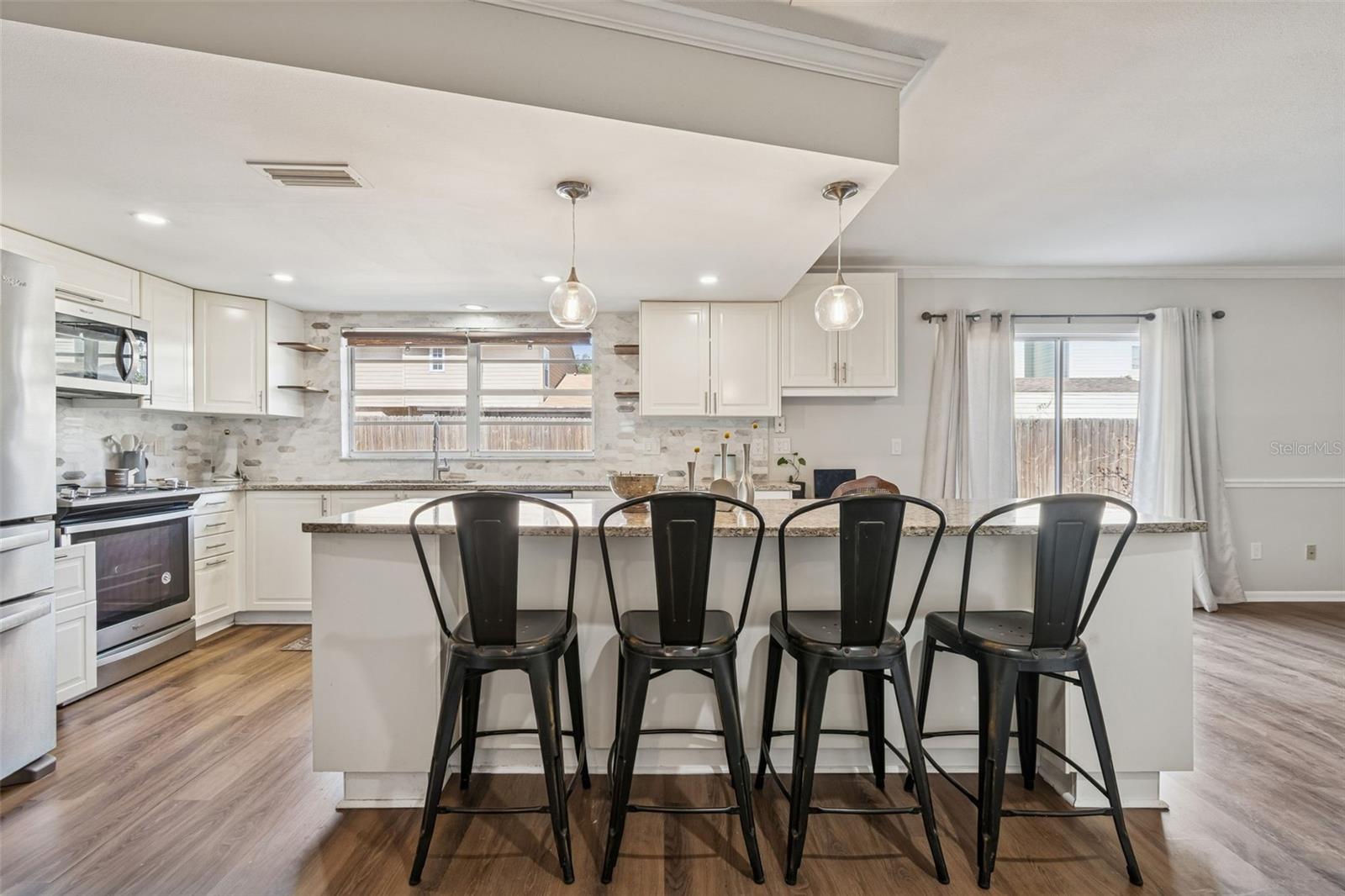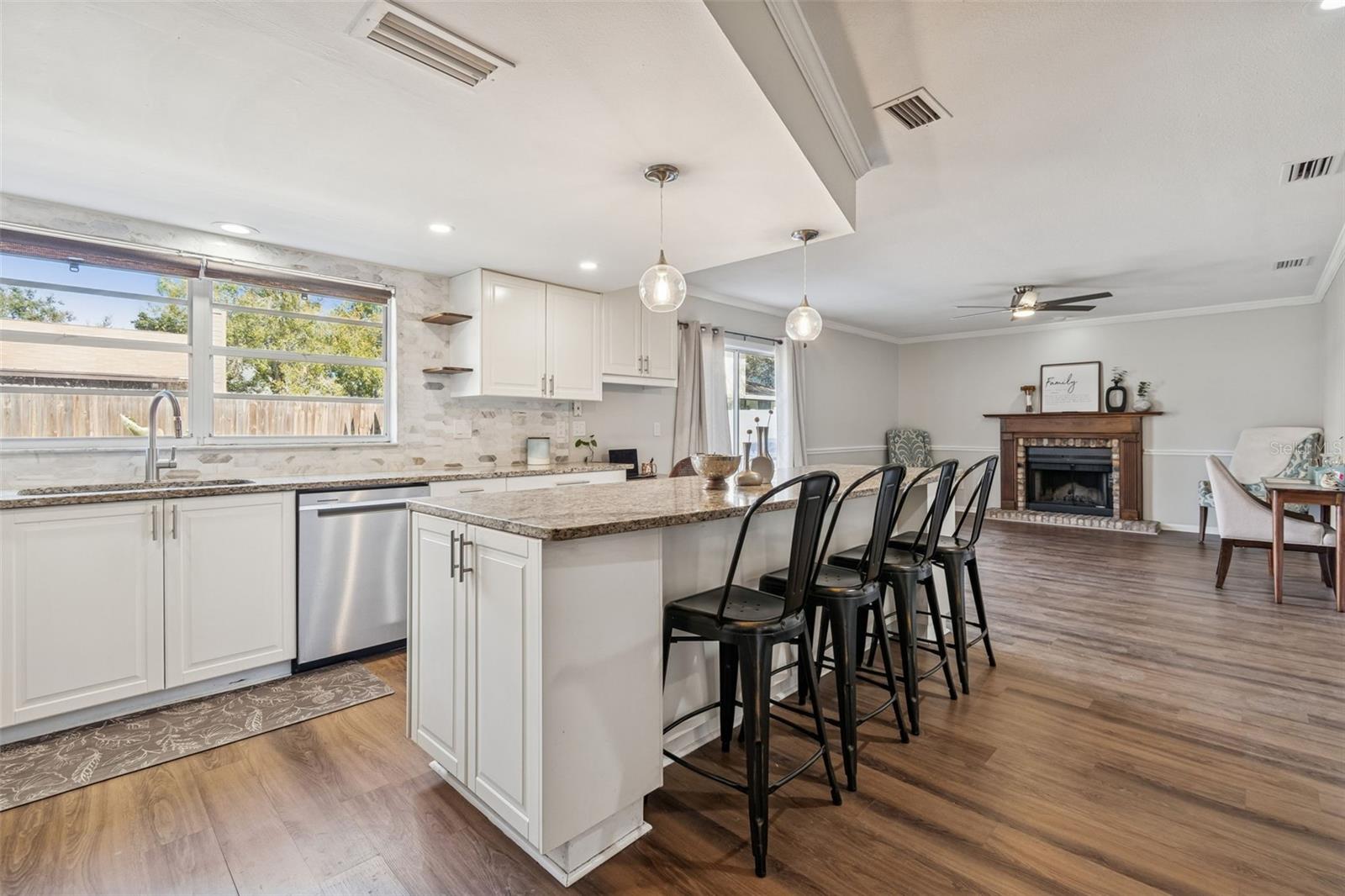 Welcome home to this beautifully updated 4 bedroom, 2 and a half bathroom property offering over 2,500 square feet of interior living space in one of Carrollwood’s most desirable and well established communities. With fresh exterior paint and great curb appeal, the home sits on a quiet street lined with sidewalks that wind through the neighborhood, perfect for evening strolls and bike rides. Stepping inside, you’ll find updated LVP flooring throughout, vaulted ceilings with wood beam accents, crown molding, and fresh interior paint that make the home feel warm and inviting. The spacious living and dining room combination flows directly into the heart of the home where the kitchen features granite countertops, a large island with generous barstool seating, stainless steel appliances, and all new marble backsplash that ties the space together. Off the kitchen, the family room offers a cozy fireplace, chair rail detailing, and sliding glass doors that lead out to the private fenced backyard, a blank canvas ready to become your outdoor oasis. The first floor also includes an updated half bathroom with modern finishes and the owner’s suite tucked behind double doors. The suite features a walk-in closet and an ensuite bathroom with separate vanities and a glass enclosed walk-in shower. Upstairs, the loft serves as an ideal flex space for a playroom, workout space, or bonus living space. Three additional bedrooms are located near the newly updated guest bathroom featuring a modern vanity and timeless subway tile. Additional updates include a new AC and a newer water heater for added peace of mind. This central Tampa location is truly unbeatable. You’ll be minutes from USF, Busch Gardens, Adventure Island, and the vibrant restaurant and shopping options throughout Carrollwood. Commuting is effortless with quick access to major roads, and Tampa International Airport is just a short drive away. Catch a Bucs game at nearby Raymond James Stadium, spend weekends along the Riverwalk, explore Downtown Tampa, or enjoy Florida’s famed Gulf Beaches less than an hour away. Everything Tampa has to offer is right at your fingertips. Schedule your showing today.