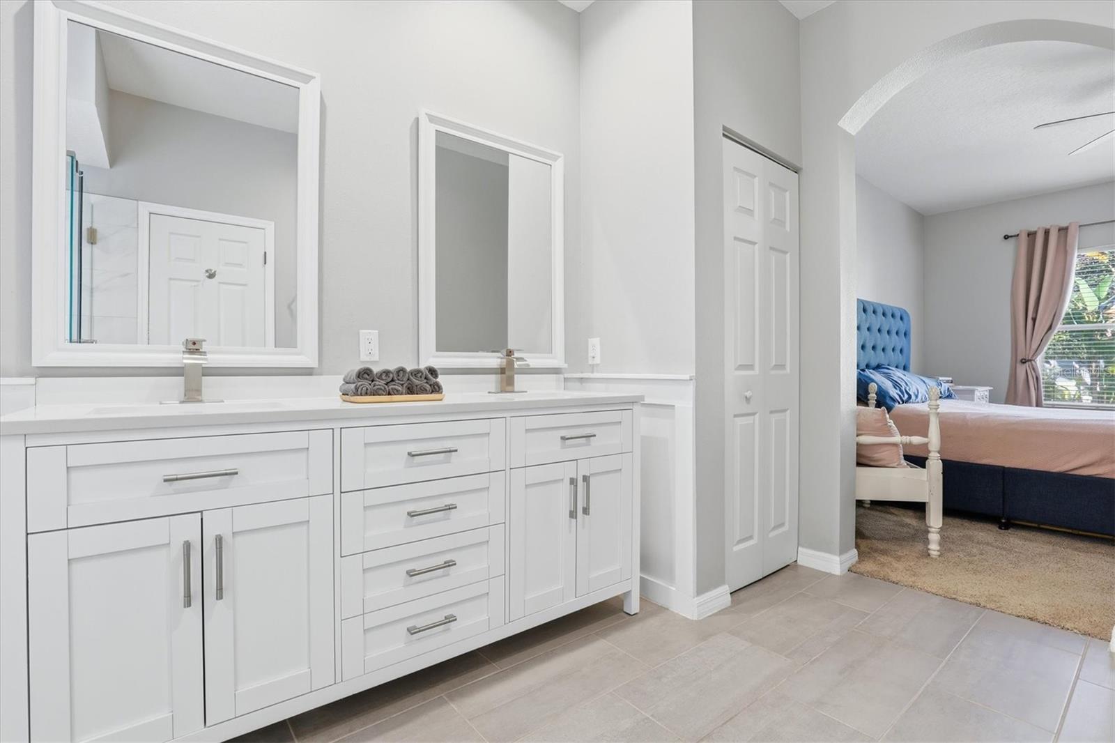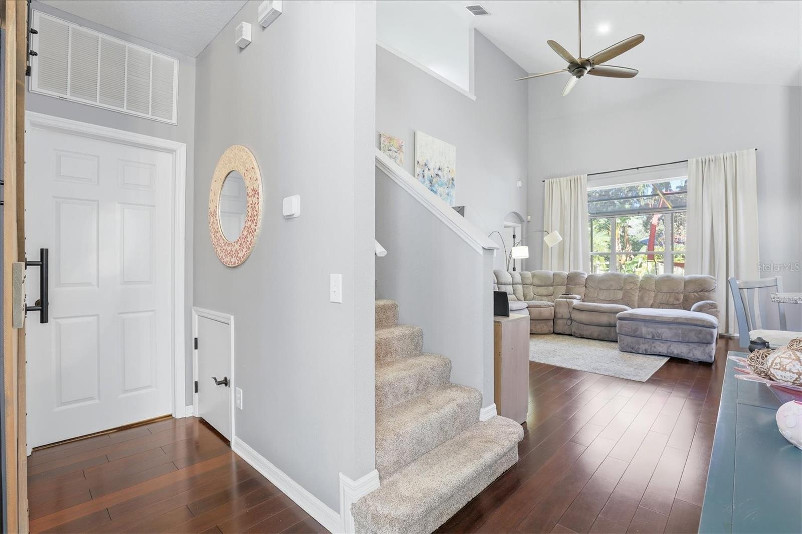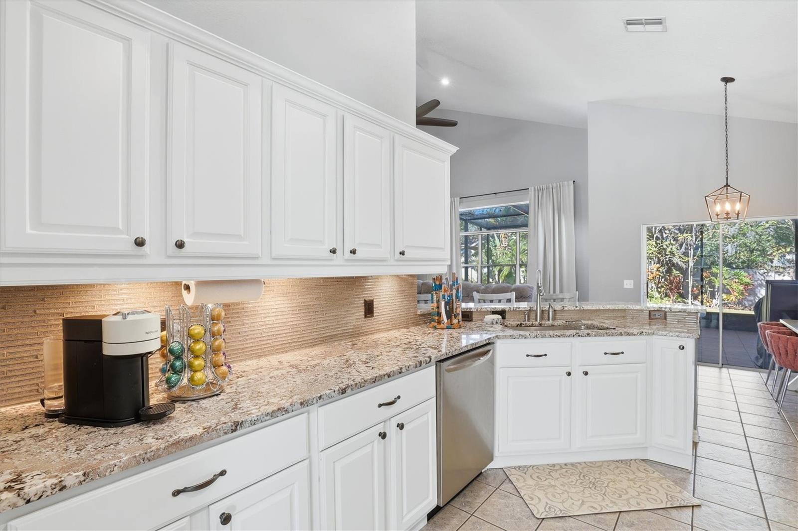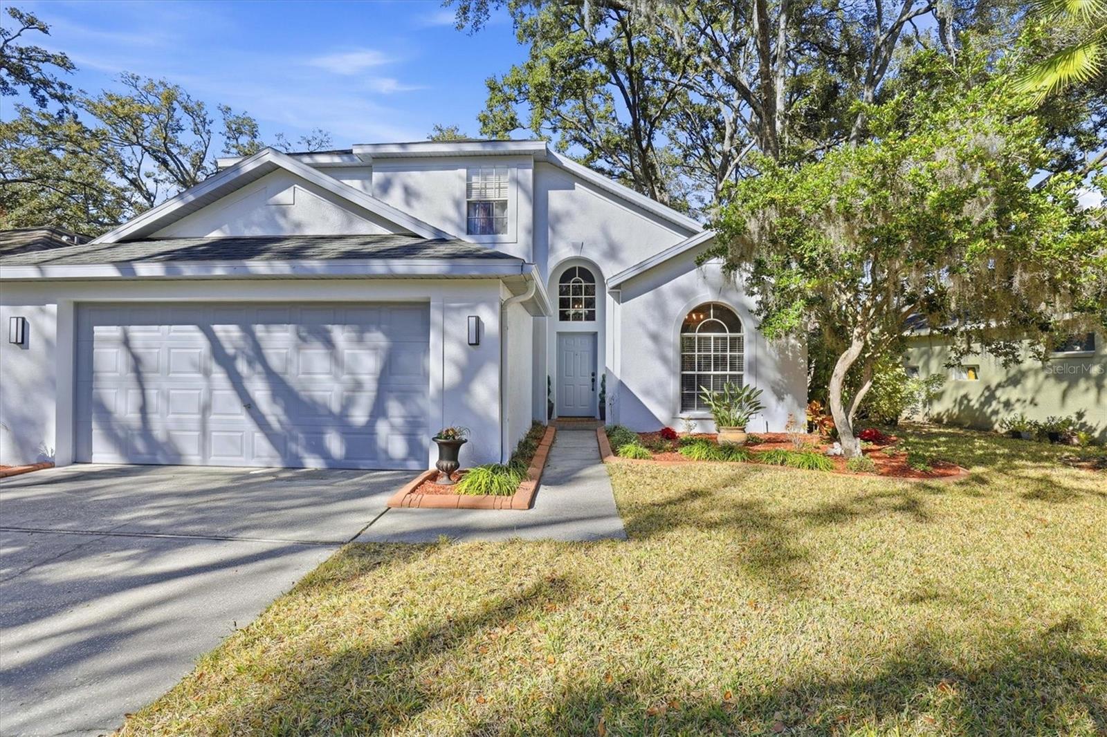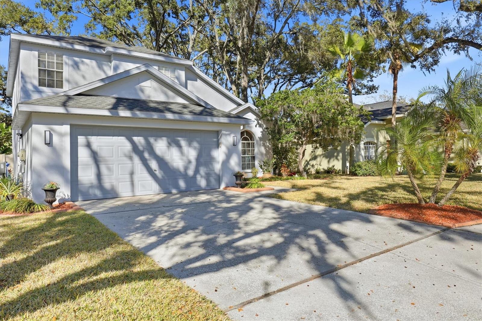 Beautifully curated two-story residence offering 3 bedrooms, 2.5 baths, and 1,922 square feet of elegant, light-filled space. Designed with both sophistication and comfort in mind, the home features an open-concept layout, vaulted ceilings, and an abundance of natural light that enhances the warmth of the Brazilian walnut flooring and tile throughout the main living areas. The chef-inspired kitchen seamlessly anchors the home, showcasing granite countertops, a farmhouse sink, stainless steel appliances, and a generous breakfast bar perfect for entertaining. The living area flows effortlessly from the kitchen, creating an inviting space for gatherings large and small. The primary suite, thoughtfully located on the main floor, serves as a private retreat. The spa-inspired ensuite bathroom features dual vanities, a freestanding soaking tub, and a glass-enclosed walk-in shower with marble flooring. A well-appointed laundry room with custom shelving and a stylish half bath complete the first level. Upstairs, two additional bedrooms, a full bath, and an overlooking loft provide flexible space ideal for a home office, lounge, or media area. Outdoors, enjoy a fenced backyard oasis with a covered, screened-in patio finished with composite tile flooring, surrounded by mature landscaping and shaded oak trees for year-round enjoyment. Nestled within the gated community of Whispering Oaks, this home offers sidewalks, serene surroundings, and a premier location in the heart of Tampa just minutes from Tampa International Airport, International Plaza, Raymond James Stadium, George Steinbrenner Field, Midtown, Downtown Tampa, hospitals, golf courses, shopping, and dining. Schedule your private showing today!