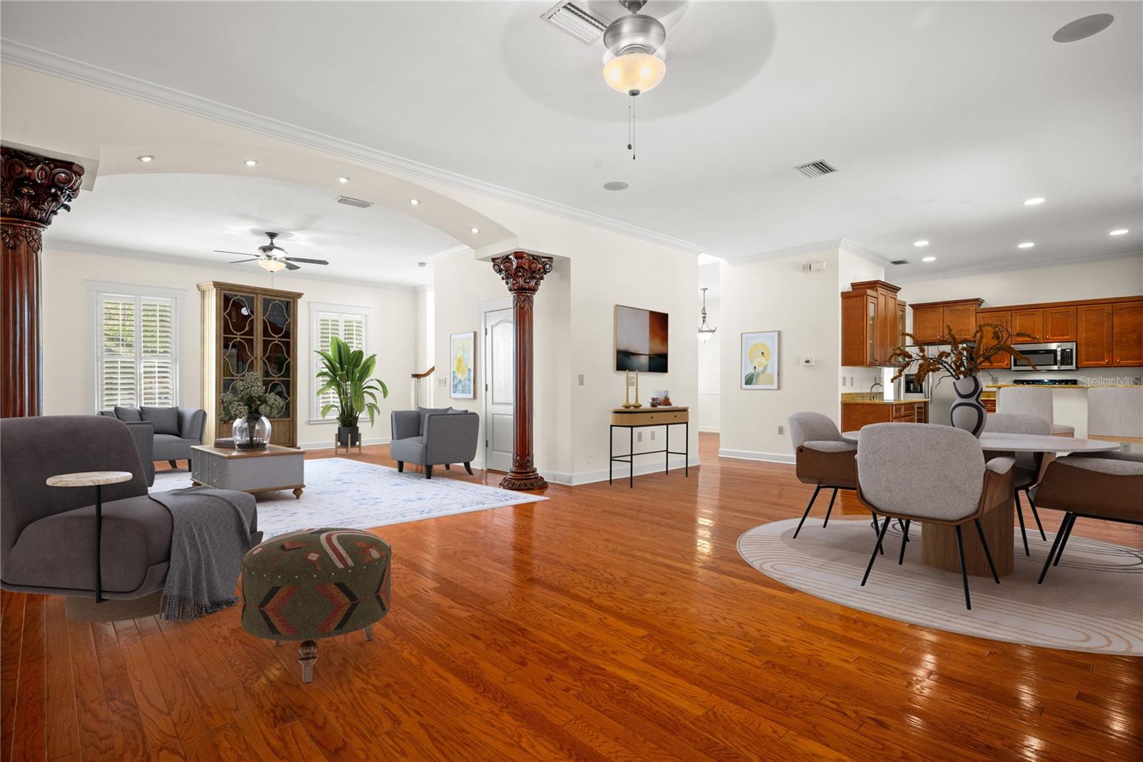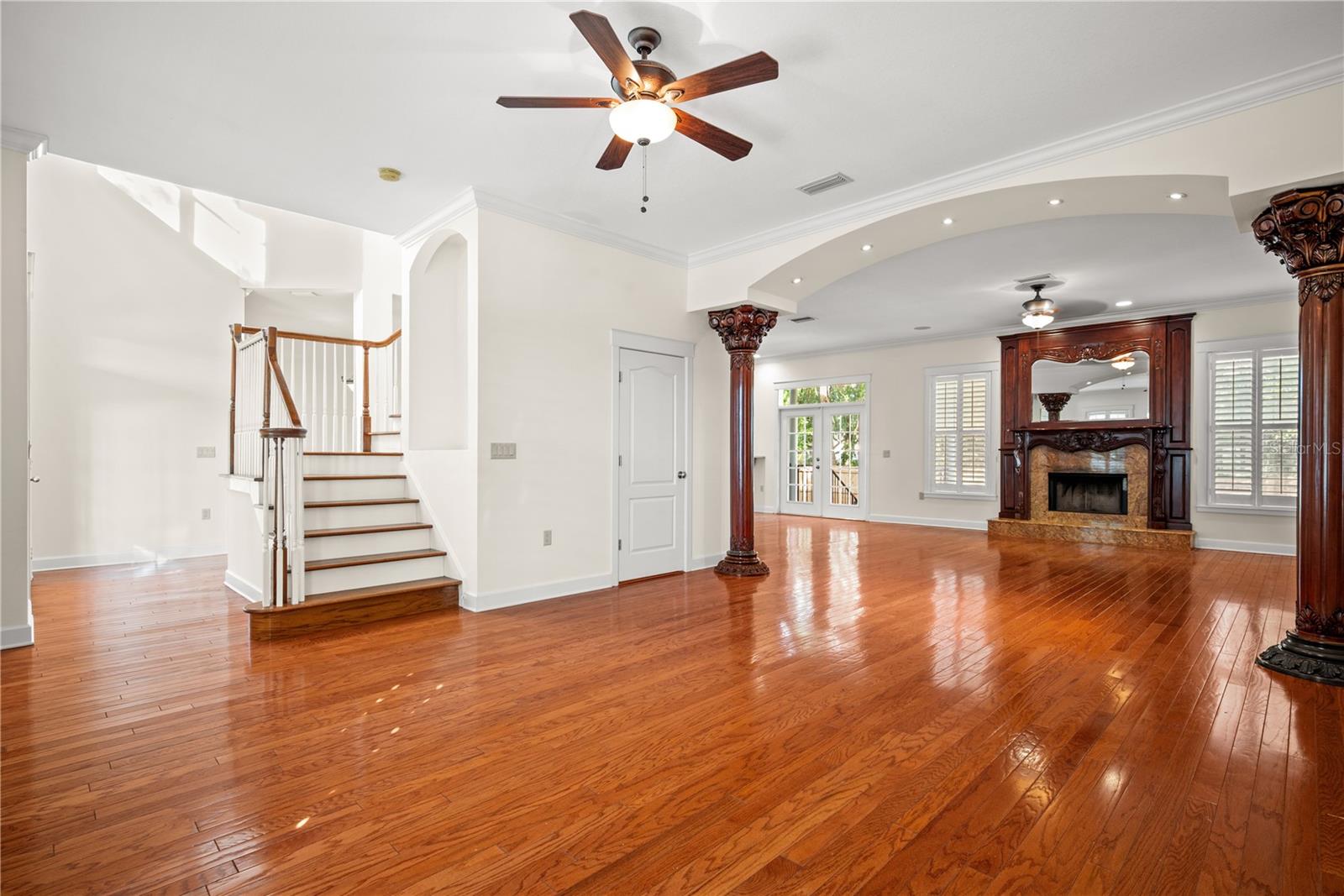 Aggressively priced South Tampa home near the Westshore Marina District featuring a large wrap-around front porch, side-set garage, and mature oak trees that frame the property with classic Southern charm. Custom wrought iron detailing enhances both the front and rear porches, adding distinctive architectural character rarely found in standard tract construction. Double glass entry doors with wrought iron accents open to a dramatic staircase that anchors the interior. The open floor plan offers 2,575 square feet with 4 bedrooms and 2.5 baths. Interior details include crown molding with craftsmen-style wood casings around all windows and doorways, plantation shutters, a wood burning fireplace, and a built-in wet bar with wine rack. The home includes traditional finishes such as tile, carpet, and granite countertops and has been positioned to allow the next owner to incorporate modern upgrades while building immediate equity. No HOA adds additional flexibility and long-term appeal. The lot and a half extends to a spacious backyard with no rear yard neighbors, mature oak trees, a paver patio with fire pit, and a sprinkler system - creating a private outdoor setting that complements the home’s southern character.