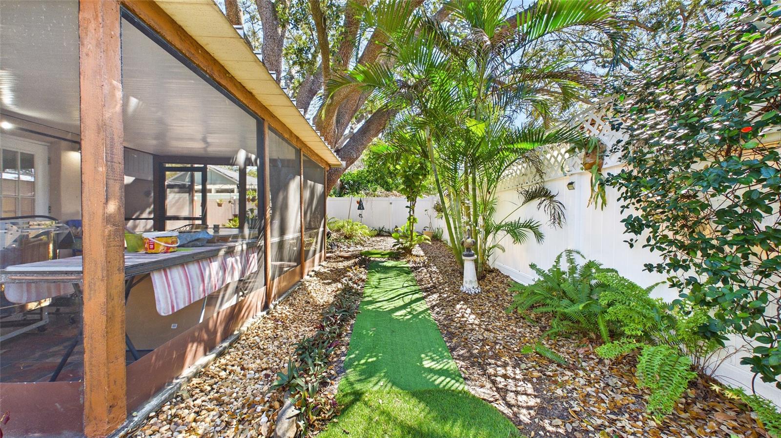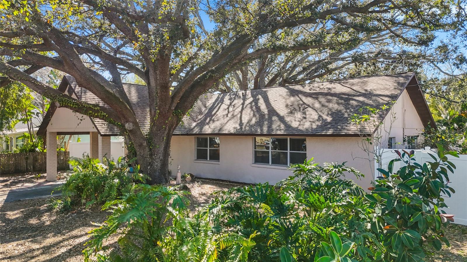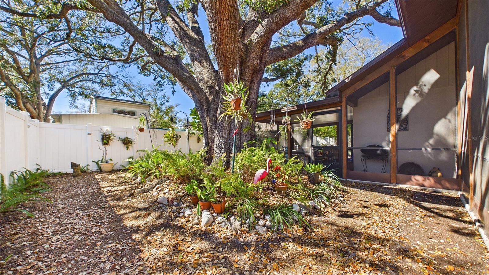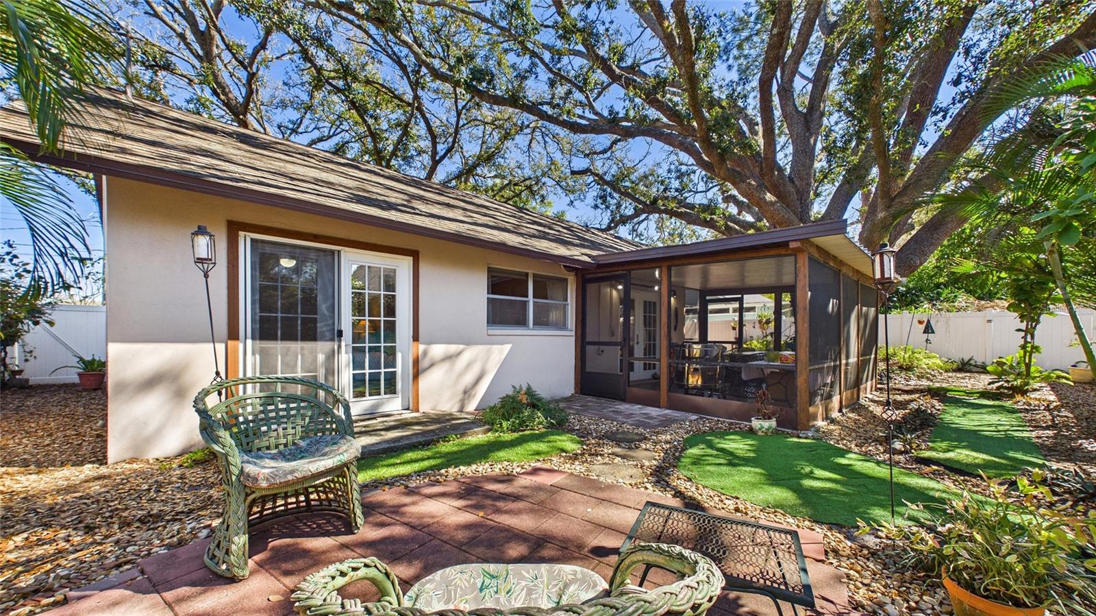 Tucked beneath centuries-old grand oaks, this nature-lover’s retreat blends comfortable Gulf Coast style with documented system updates and thoughtful improvements throughout. Located on a quiet no-through street between Old Tampa Bay and Bayshore Boulevard, the setting offers privacy, charm, and walkability in one of South Tampa’s most desirable pockets. The home features 1,240 square feet of heated living space with vaulted ceilings, original terrazzo and tile floors, custom built-in bookshelves, and abundant natural light. Three sets of double French doors create beautiful flow and open to a large wrap-around screened lanai — a true extension of the home and perfect for outdoor dining, relaxing, or entertaining. The kitchen was remodeled with granite countertops, breakfast bar, double stainless-steel sink, updated faucet and disposal, and refreshed cabinetry. The practical floor plan includes three bedrooms, a bonus office or den, and one-and-a-half remodeled baths. The main bath was fully renovated with updated flooring, tile, vanity, sink, and fixtures, while the powder room features recent updates and custom storage. The screened-in laundry room includes cabinetry, utility sink, and washer and dryer discreetly housed within cabinetry, offering functionality without sacrificing space. The door frame was widened for accessibility and additional storage. Major improvements include whole-house rewiring and new electrical panel (2008), attic re-plumbing with updated supply lines to the street, heat pump and air handler system (2008, serviced 2025), water heater (2013), and hip roof shingle replacement (2012). A comprehensive pre-listing inspection completed January 2026 evaluated roof, HVAC, plumbing, electrical, and major systems, all reported in good working order. Additional features include a 220 outlet on the lanai, large storage area above the double carport, painted exterior, vinyl privacy fencing with two lockable gates, mature landscaping with jasmine and hibiscus, and an eco-friendly yard design. High and dry location with no flooding during recent hurricane seasons. Approximately 1,900 total square feet including covered and screened areas. A well-maintained South Tampa home with strong mechanical integrity, timeless character, and move-in-ready appeal.