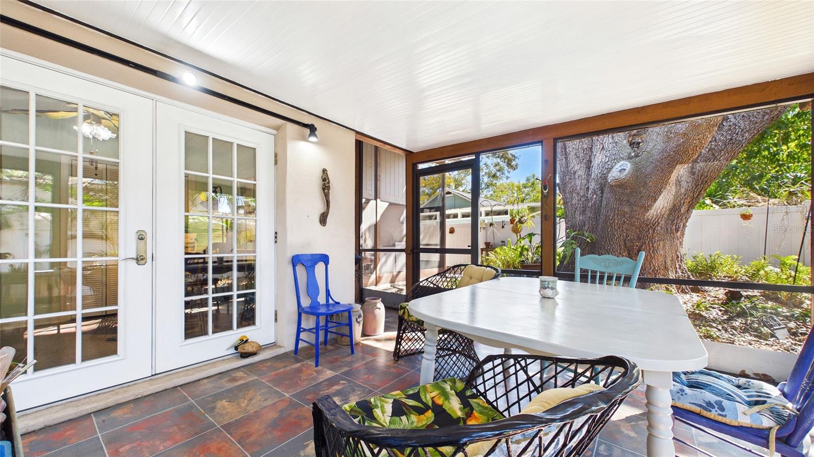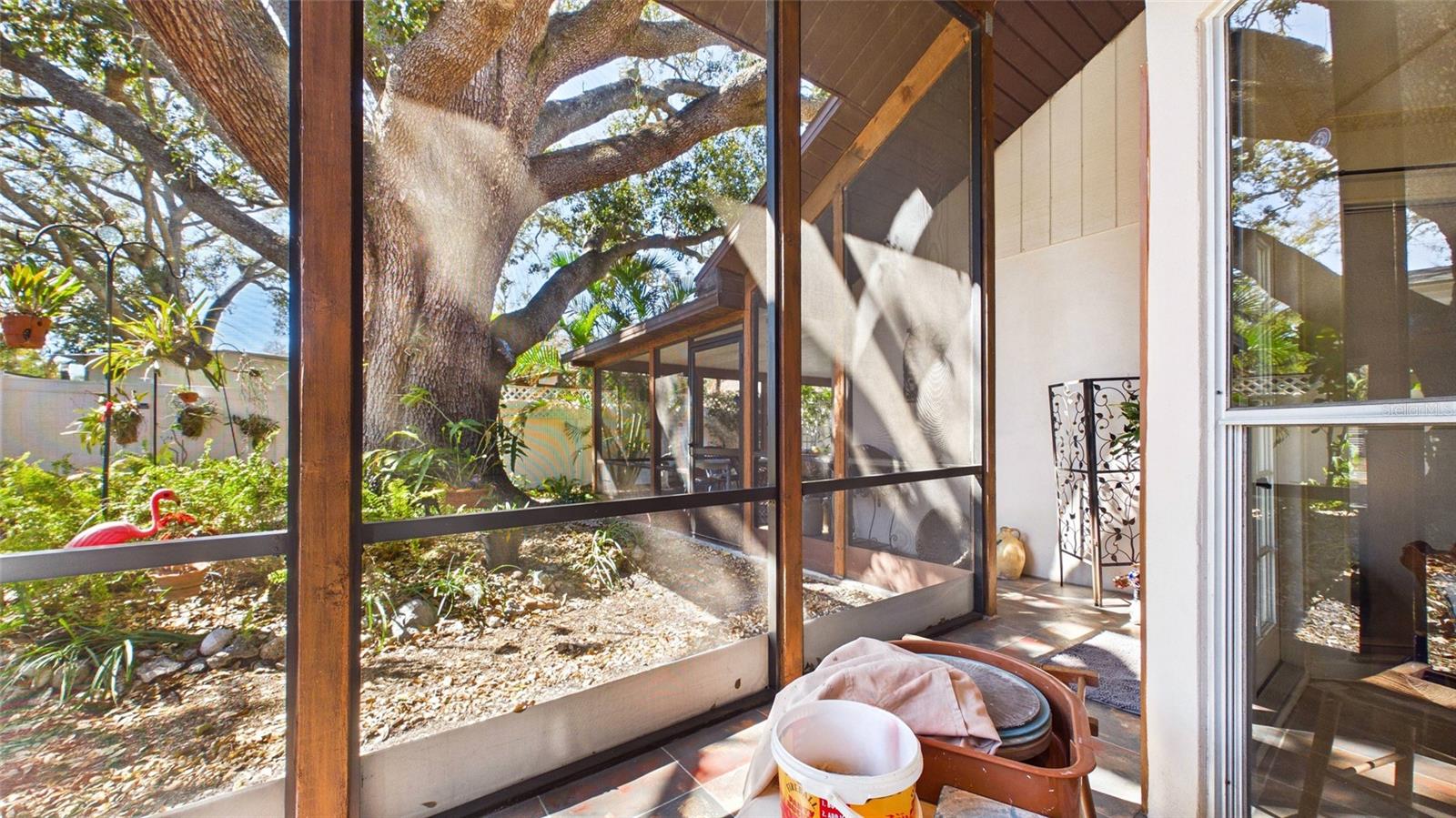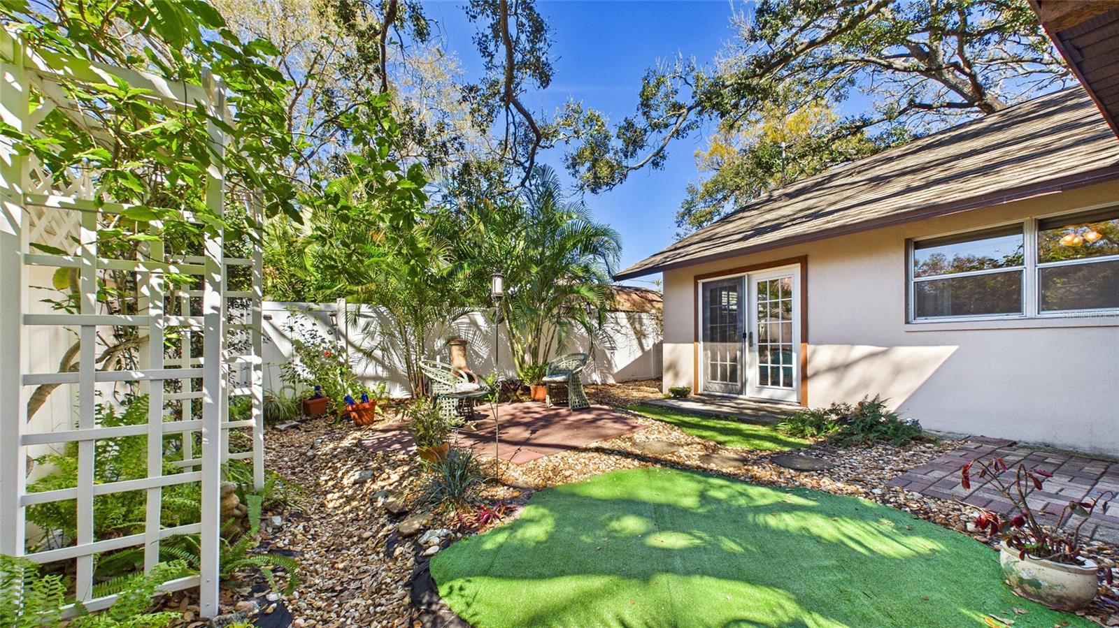 Tucked beneath centuries-old grand oaks, this nature-lover’s retreat blends comfortable Gulf Coast style with documented system updates and thoughtful improvements throughout. Located on a quiet no-through street between Old Tampa Bay and Bayshore Boulevard, the setting offers privacy, charm, and walkability in one of South Tampa’s most desirable pockets. The home features 1,240 square feet of heated living space with vaulted ceilings, original terrazzo and tile floors, custom built-in bookshelves, and abundant natural light. Three sets of double French doors create beautiful flow and open to a large wrap-around screened lanai — a true extension of the home and perfect for outdoor dining, relaxing, or entertaining. The kitchen was remodeled with granite countertops, breakfast bar, double stainless-steel sink, updated faucet and disposal, and refreshed cabinetry. The practical floor plan includes three bedrooms, a bonus office or den, and one-and-a-half remodeled baths. The main bath was fully renovated with updated flooring, tile, vanity, sink, and fixtures, while the powder room features recent updates and custom storage. The screened-in laundry room includes cabinetry, utility sink, and washer and dryer discreetly housed within cabinetry, offering functionality without sacrificing space. The door frame was widened for accessibility and additional storage. Major improvements include whole-house rewiring and new electrical panel (2008), attic re-plumbing with updated supply lines to the street, heat pump and air handler system (2008, serviced 2025), water heater (2013), and hip roof shingle replacement (2012). A comprehensive pre-listing inspection completed January 2026 evaluated roof, HVAC, plumbing, electrical, and major systems, all reported in good working order. Additional features include a 220 outlet on the lanai, large storage area above the double carport, painted exterior, vinyl privacy fencing with two lockable gates, mature landscaping with jasmine and hibiscus, and an eco-friendly yard design. High and dry location with no flooding during recent hurricane seasons. Approximately 1,900 total square feet including covered and screened areas. A well-maintained South Tampa home with strong mechanical integrity, timeless character, and move-in-ready appeal.