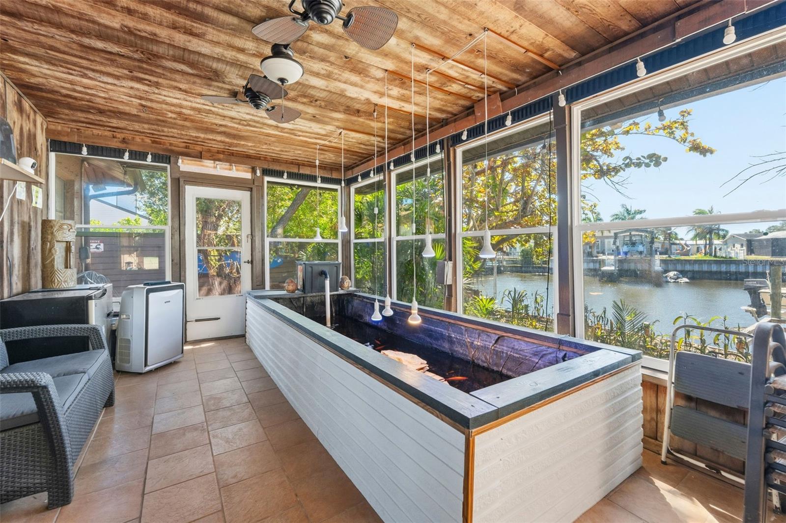 Boat directly to the open waters of Tampa Bay from your own backyard with full Gulf access! This exceptional waterfront home is designed for both relaxation and entertaining, featuring a 10,000 lb. boat lift, private dock for enjoying breathtaking sunsets, and the opportunity to watch dolphins and manatees glide by from your outdoor deck complete with a hot tub. Additional exterior highlights include a gazebo deck and enclosed lanai overlooking a salt/brackish water canal with effortless access to Tampa Bay. Inside, the home offers a fabulous open-concept floor plan, cozy fireplace, private movie theater (projector negotiable), and a stunning 320-gallon aquarium (negotiable). White tile lies beneath the carpet throughout, providing both style and long-term practicality. Conveniently located just minutes from the Veterans Expressway, this home offers the perfect blend of comfort, waterfront living, and easy access to all that Tampa has to offer.