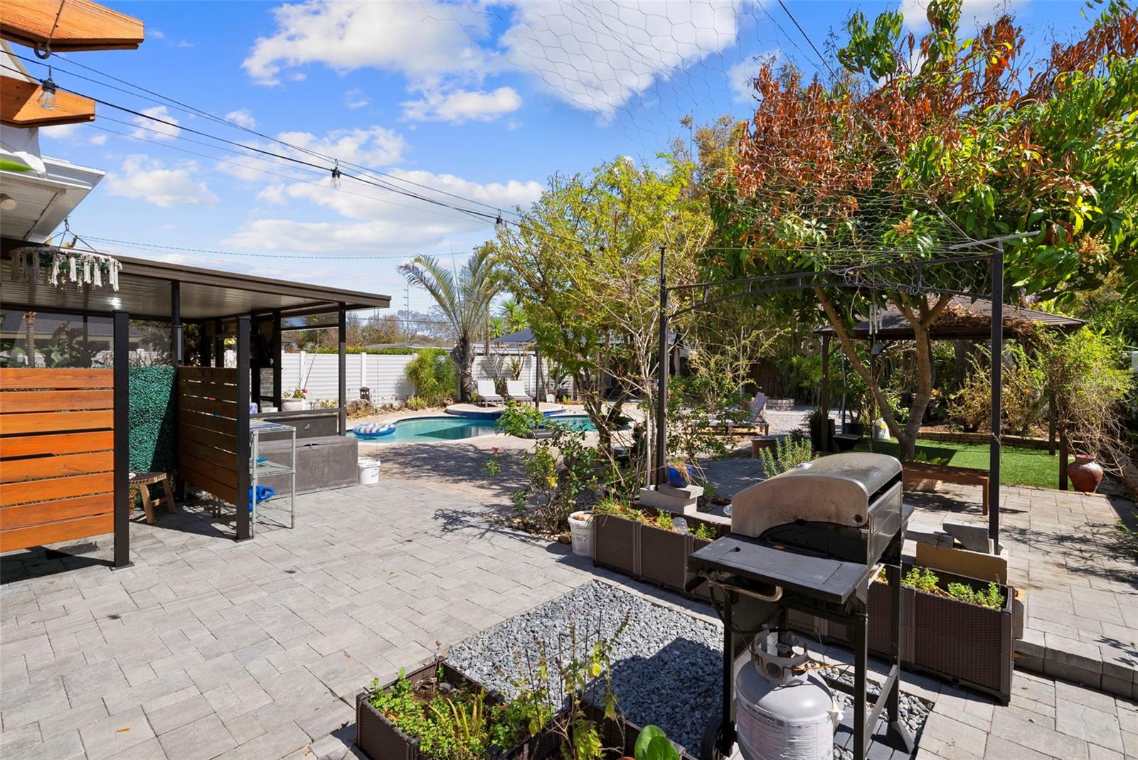 Welcome to this beautifully renovated 3-bedroom, 2-bath residence in the heart of Midtown — where charm, light, and effortless indoor-outdoor living come together. Situated on a generous corner lot, this home was thoughtfully updated in 2015 and features impact-rated windows that flood the interiors with natural light. The open living space flows seamlessly into the kitchen, creating a warm and inviting environment perfect for everyday living and entertaining. There are wood grained porcelain tiles throughout the home. At the center of the home, the kitchen is designed to gather — complete with a large butcher block island, abundant cabinetry, stainless steel appliances, and a bar area that comfortably seats four.The two toned cabinets give the kitchen a pop of style. The dining room is spacious with wall to wall windows. The dining overlooks the backyard and opens through double doors to a screened lanai, extending your living space outdoors. The layout offers two guest bedrooms at the front of the home, along with a beautifully updated secondary bath featuring a glass-enclosed shower and convenient separate washer/dryer (2024) closet. The primary suite is privately positioned and includes a spacious closet, a bright bath with a double vanity and original mid-century soaking tub, and double doors that lead to your own private patio retreat. Step outside and discover a true tropical oasis. The solar-heated pool is surrounded by lush, thoughtfully designed landscaping, creating multiple intimate spaces to relax and entertain — whether enjoying morning coffee, evenings by the fire pit, or gathering with friends under the stars. Tucked beneath mature bamboo is a custom koi pond with a tranquil waterfall feature. An outdoor shower completes the resort-style experience. With a low-maintenance zero-scaped yard and a circular driveway offering ample parking, this home delivers both style and practicality. Move-in ready and designed for living, this Midtown gem offers the kind of character, privacy, and indoor-outdoor lifestyle that rarely becomes available — and when it does, it doesn’t stay long.