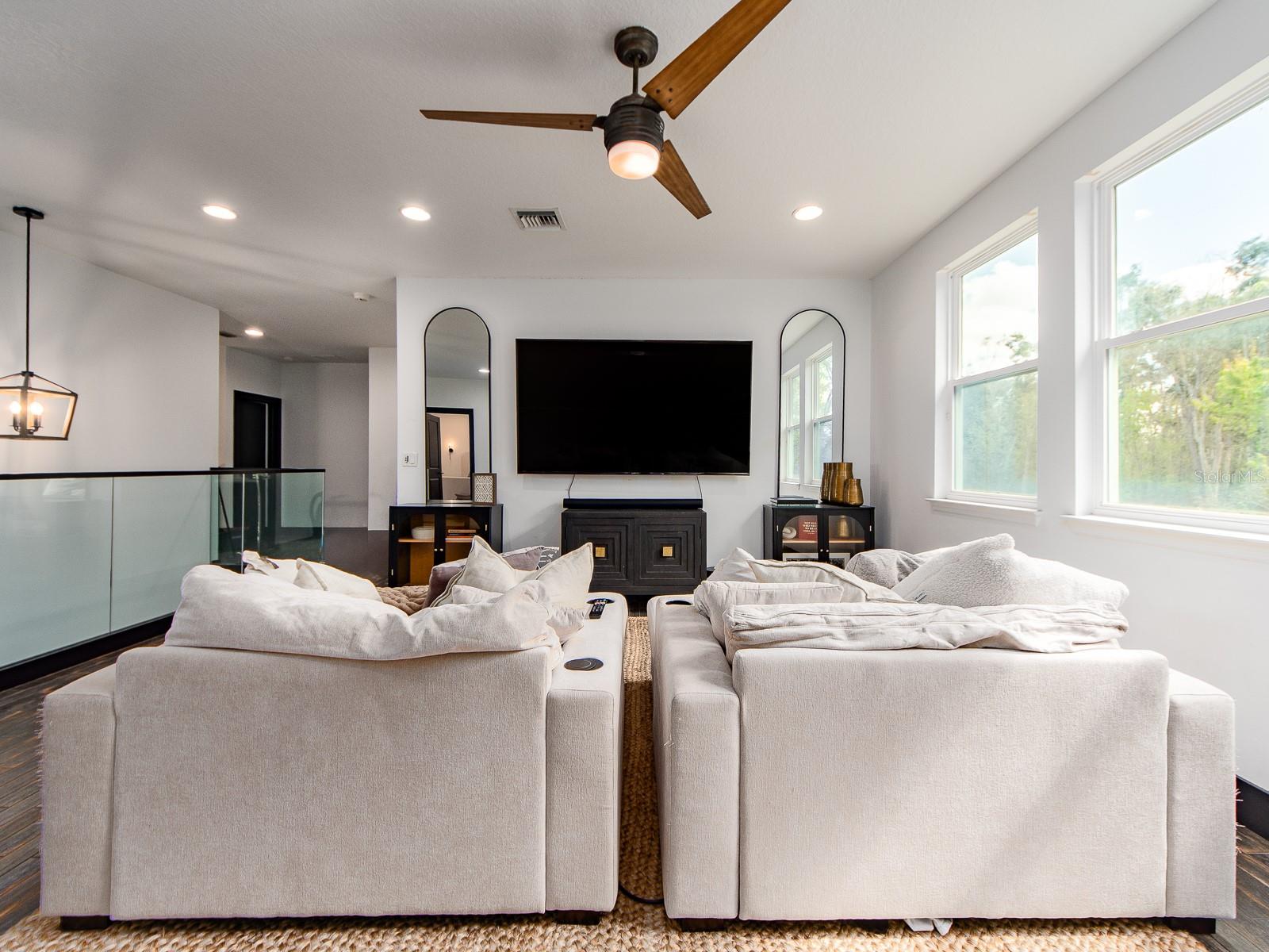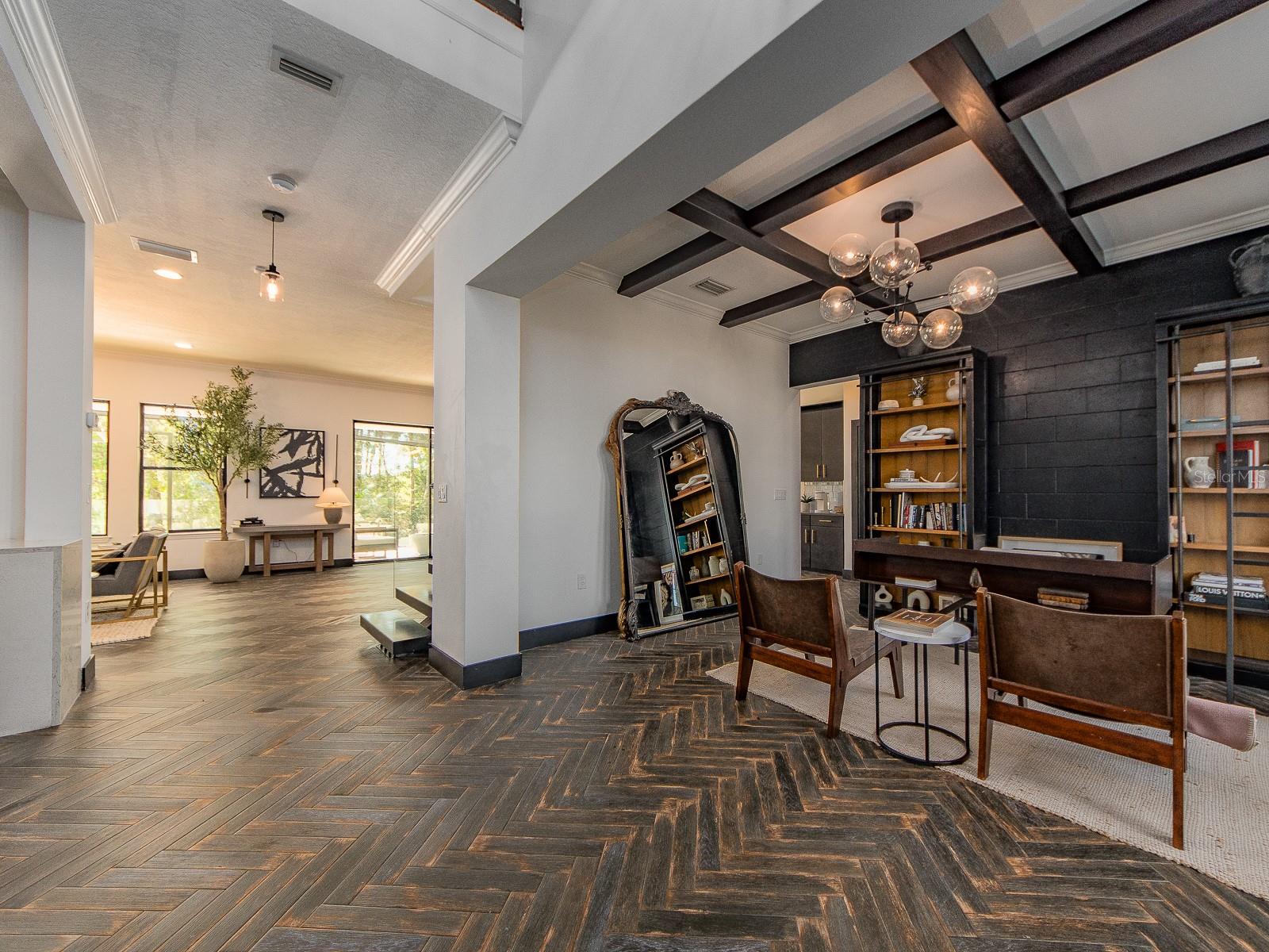 Architectural elegance meets resort-style living in this beautiful home located on a quiet tree-lined street in the highly desirable Lake Magdalene / Carrollwood area of Tampa with no HOA or CDD. From the moment you arrive, the home makes a striking impression with its tile roof, custom wood front door, custom garage door, brick paver driveway, and extended paver front porch sitting area. Step inside to soaring ceilings, architectural lighting, elegant herringbone-pattern tile flooring, custom stone accents, and a dramatic floating staircase with glass railing that creates an unforgettable first impression. The kitchen anchors the main living space and features granite countertops, stainless steel appliances, double wall ovens, a walk-in pantry, and a large shiplap-accented breakfast bar overlooking the open living and dining areas. The spacious primary suite offers a relaxing retreat with a large walk-in closet. The expansive spa-inspired primary bathroom creates a true retreat within the home, featuring floor-to-ceiling tile, dual rainfall showers with glass enclosures, generous vanity space, and a freestanding soaking tub positioned between the showers, creating a dramatic and luxurious spa-like setting. Upstairs, the thoughtfully designed layout includes three additional bedrooms, a spacious loft area ideal for a media room, office, or playroom, and a conveniently located laundry room, keeping all bedrooms and laundry on the same level for everyday ease and functionality. Step outside to your private backyard oasis with a custom pool with water features, expansive stone pool deck, and peaceful conservation views. The screened lanai features tiled flooring, exterior ceiling fans, and an outdoor summer kitchen with sink and refrigerator, perfect for Florida outdoor living and entertaining. Additional features include an in-wall pest control system, ADT security system, hurricane shutters, UV HVAC air sanitizing system, custom garage shelving, and a premium lot setback offering additional privacy. Conveniently located just minutes from downtown Tampa, Tampa International Airport, and an abundance of shopping and dining options, this home offers a rare combination of thoughtful design, extensive upgrades, and an exceptional location.