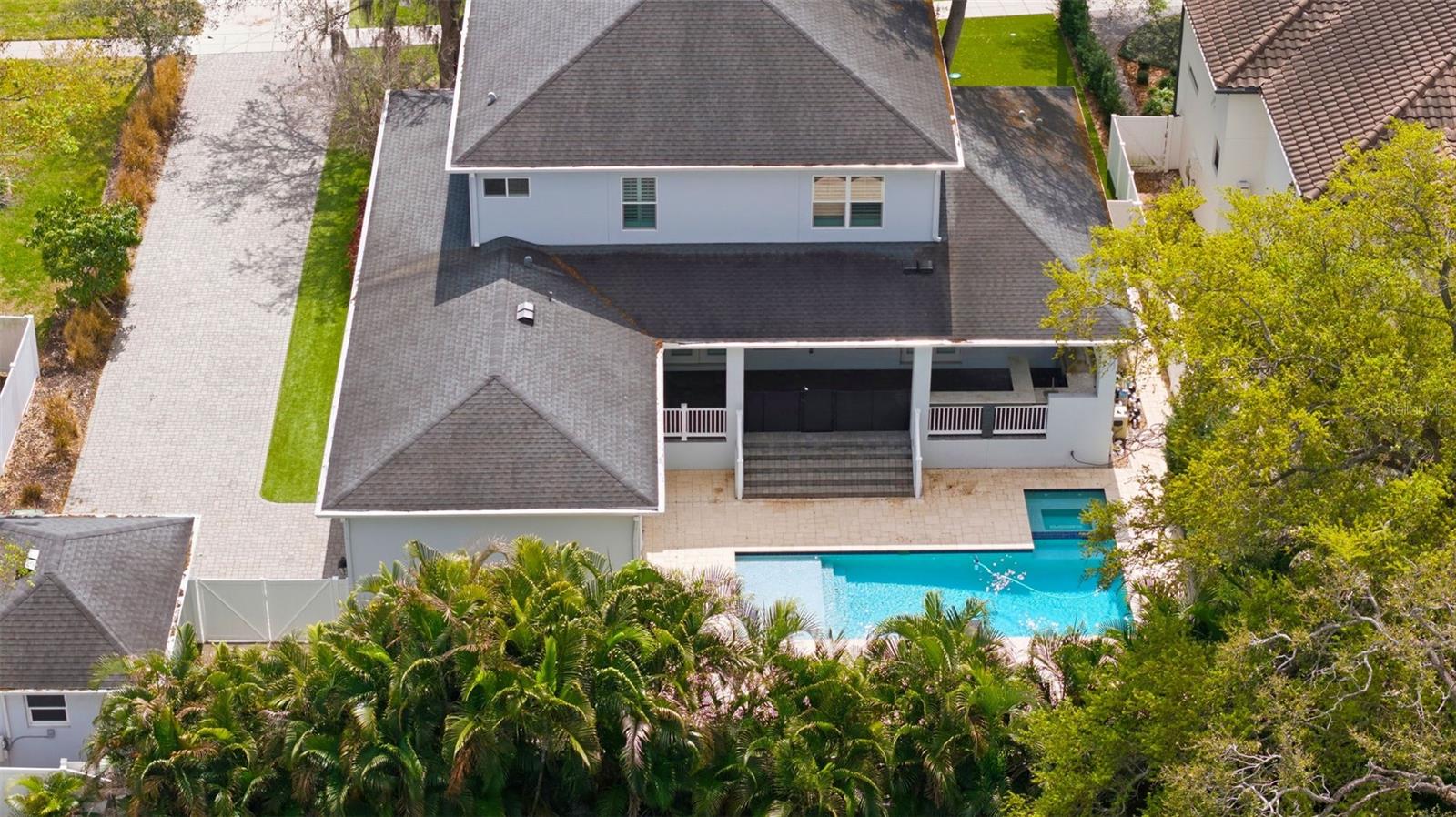 Located in the heart of highly desirable Sunset Park, this beautifully designed home by South Tampa builder Bayshore Custom Homes offers 4,106 square feet of well-appointed living space on an oversized 101 x 130 homesite with an outdoor entertainment space with a pool. This two story residence features 5 bedrooms, 4 bathrooms, a dedicated office/den, formal dining room, bonus/media room, and a spacious great room, along with a three-car garage. The open layout is designed for both everyday living and entertaining, highlighted by a gourmet kitchen with custom cabinetry, granite countertops, and stainless steel appliances, flowing seamlessly into the main living areas. The first-floor primary suite offers tray ceilings, dual walk-in closets, and a spacious bathroom with separate vanities and a soaking tub, while the second level includes additional bedrooms along with a loft/bonus room. Interior finishes include hand-scraped hickory wood flooring throughout the main level, detailed crown molding and baseboards, and hurricane impact-resistant windows. Outdoor living is equally inviting with a covered lanai featuring a built-in outdoor kitchen with grill, refrigerator, and sink. You will see beautiful custom tongue-and-groove wood ceiling outside, along with professionally landscaped grounds, irrigation, and paver driveway and walkways. This home offers quality craftsmanship in a prime South Tampa location close to dining, shopping, and top-rated local schools.