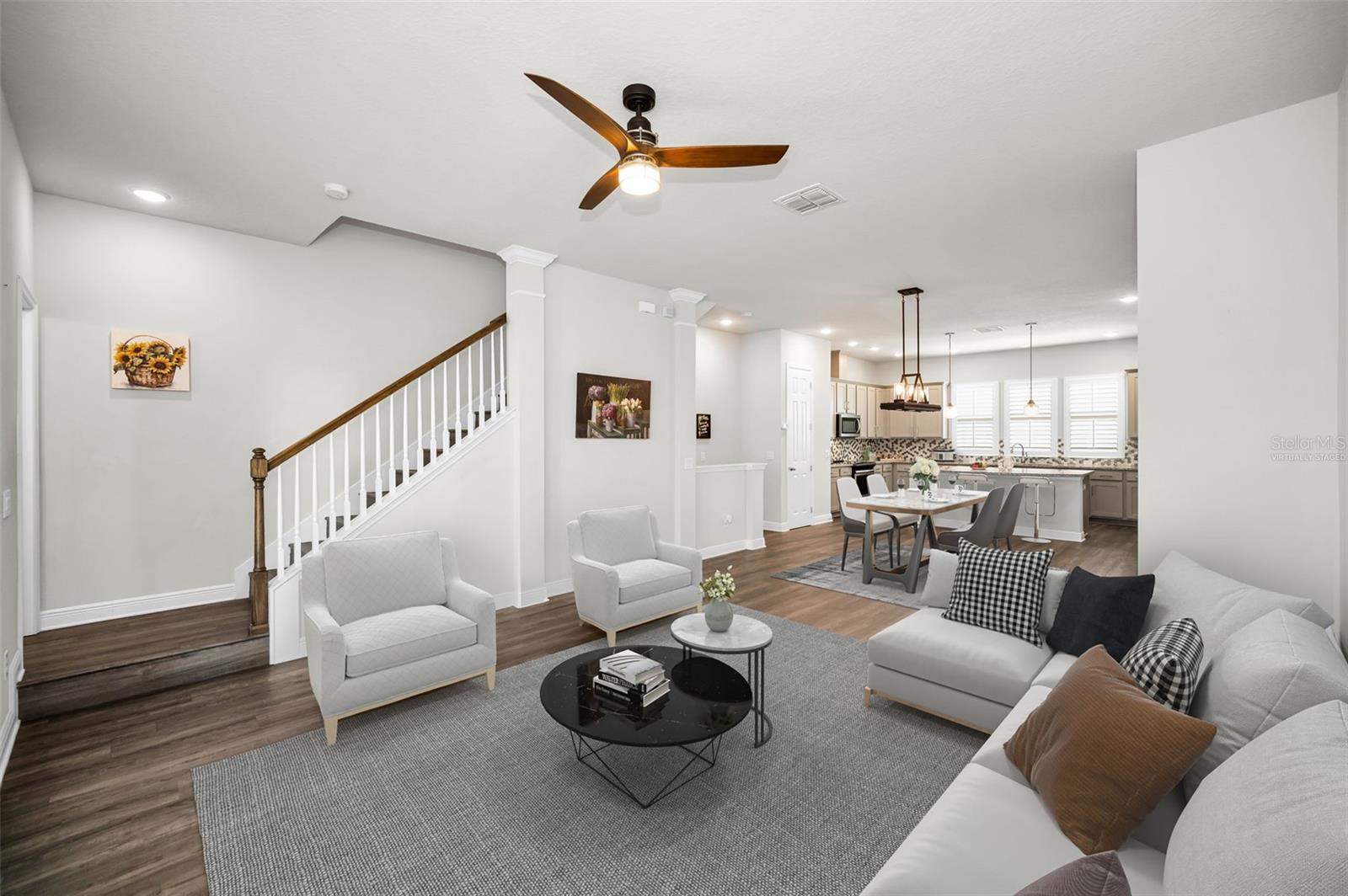 One or more photo(s) has been virtually staged. Beautiful 3 story townhome located in the Heart of Westchase, just a short walk to Westchase Town Center featuring dining, fitness, beauty and entertainment. In the home, the entire second floor is an entertainer's dream! The kitchen is 19-foot-wide with wall-to-wall cabinetry and 42” uppers with crown molding, a full set of stainless steel appliances and an oversized island providing additional storage and plenty of space for casual dining. There is also a convenient powder room and covered balcony, further expanding options for outdoor enjoyment. This newer construction home features 10 foot ceilings, energy efficiency, recessed lighting, beautiful cabinetry and granite in the kitchen and all bathrooms that give a cohesive modern farmhouse look to the home. Durable luxury vinyl plank flooring flows throughout the entire home and stairways, with tile in the 3 full bathrooms and newer carpet in the two upstairs bedrooms. Custom plantation shutters provide privacy and sunlight on every window and balcony door. The first floor features a bonus/flex room that could be used for guests, an office or multigenerational living by utilizing the full bathroom on the first floor, along with the closet. On the third level, you will find an impressive primary suite with tray ceiling and large primary bathroom with walk-in shower, spacious walk-in closet, dual sinks with plenty of counter and cabinet space, along with a private water closet, as well as the second bedroom with en-suite bathroom and walk-in closet. The guest bath offers a tub and shower combination with gleaming subway tile and coordinating granite counters and cabinets. The laundry closet is conveniently located on the 3rd floor. Rear entry access to the attached 2 car garage provides comfort and safety from our Florida rains. An additional guest parking lot is located very near the home and the Town Center is a very short walk across a parking lot. Don’t miss this rare opportunity for Urban living in the Suburbs! This great location offers convenient access to the Veterans Expressway, Suncoast Parkway, and I-275, providing an excellent commute. Westchase Community Association offers resort-style amenities including pools, parks, playgrounds, tennis and more. Room sizes are approximate.