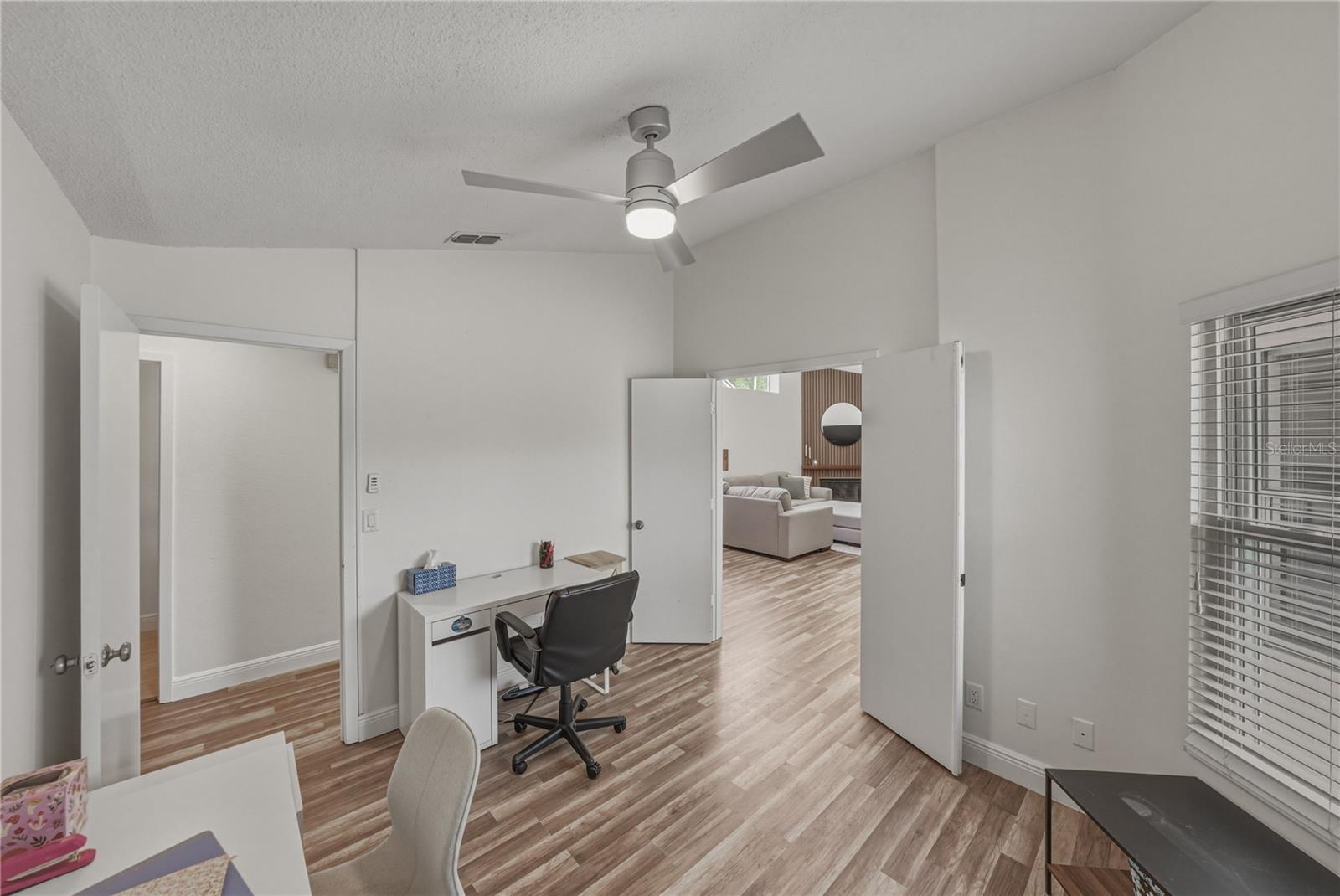 A well-maintained corner lot, a screened side entry surrounded by tropical landscaping, and thoughtful updates throughout highlight this 3 bedroom, 2 bath, 1 car garage home in the established Tampa community of Countryway. The entry offers a warm, private welcome, opening into an expansive living/dining room with vaulted ceilings, transom windows, and a natural flow that feels open without losing a sense of structure. Light moves easily through the main living areas, where luxury vinyl plank flooring carries throughout and a statement fireplace with fluted wall detailing anchors the space with a clean, architectural aesthetic. Sliding glass doors extend the layout into the enclosed sunroom, while a pass-through breakfast bar with upper cabinetry creates a subtle connection to the kitchen, giving you that open feel while still maintaining separation. This well appointed kitchen offers granite countertops, stainless steel appliances, pantry storage, and that functional pass-through makes serving and entertaining into living area a breeze. There is also room to incorporate a dinette, allowing flexibility depending on how the space is used day to day. Positioned separately from the secondary bedrooms, the primary suite offers direct access to the sunroom, a walk-in closet, and an updated ensuite with a modern, cohesive style. Dual sinks with stone countertops, a glass-enclosed walk-in shower, and updated lighting and mirrors give the ensuite a clean, finished feel. On the opposite side of the home, two additional bedrooms provide comfortable accommodations for guests or family, along with a full bathroom that carries through the same updated style. An interior laundry room and attached garage add everyday functionality, while the enclosed sunroom creates an additional area to relax, unwind, or gather. Outside, the fully fenced yard takes full advantage of the corner lot, offering room to spread out, entertain, or simply enjoy the surroundings. Countryway residents have access to a variety of recreational amenities including basketball, tennis, volleyball, soccer, and baseball courts, along with two dog parks and a playground. Optional memberships are also available at the Countryway Golf Club. Do not miss your opportunity to view this home in an excellent location. Call us today for your private tour!