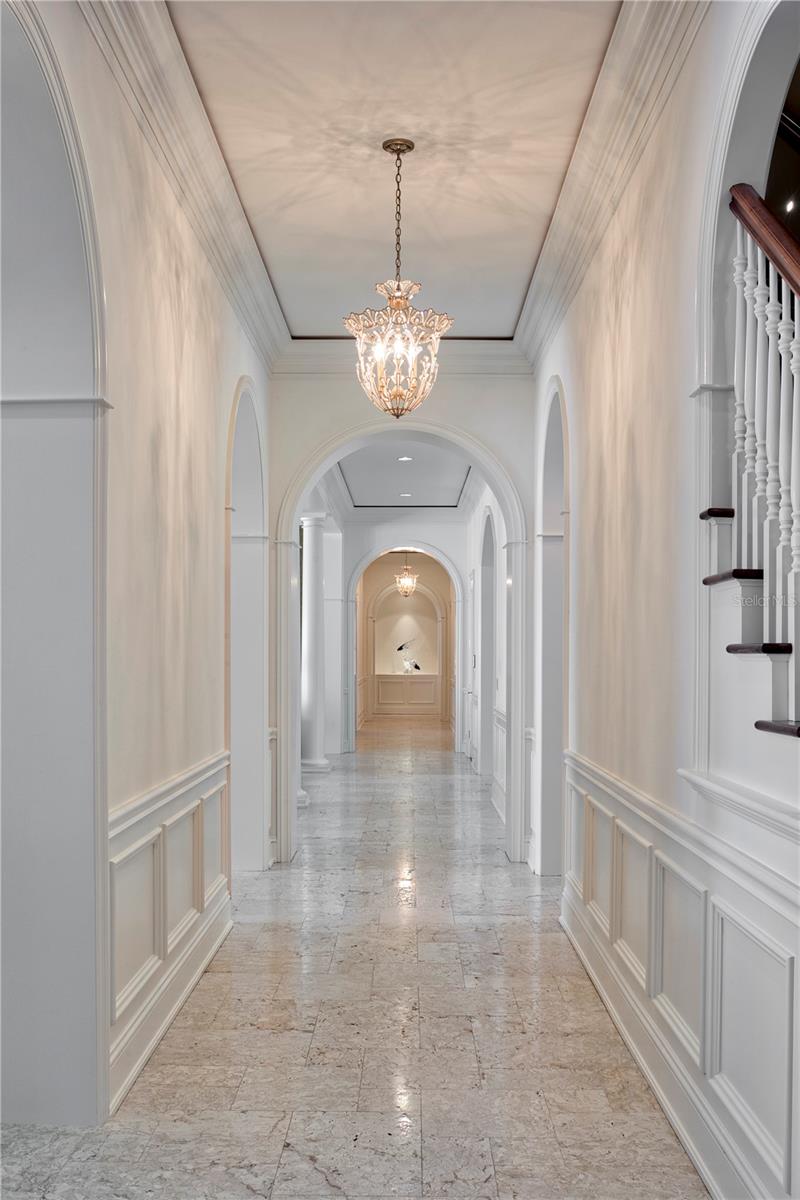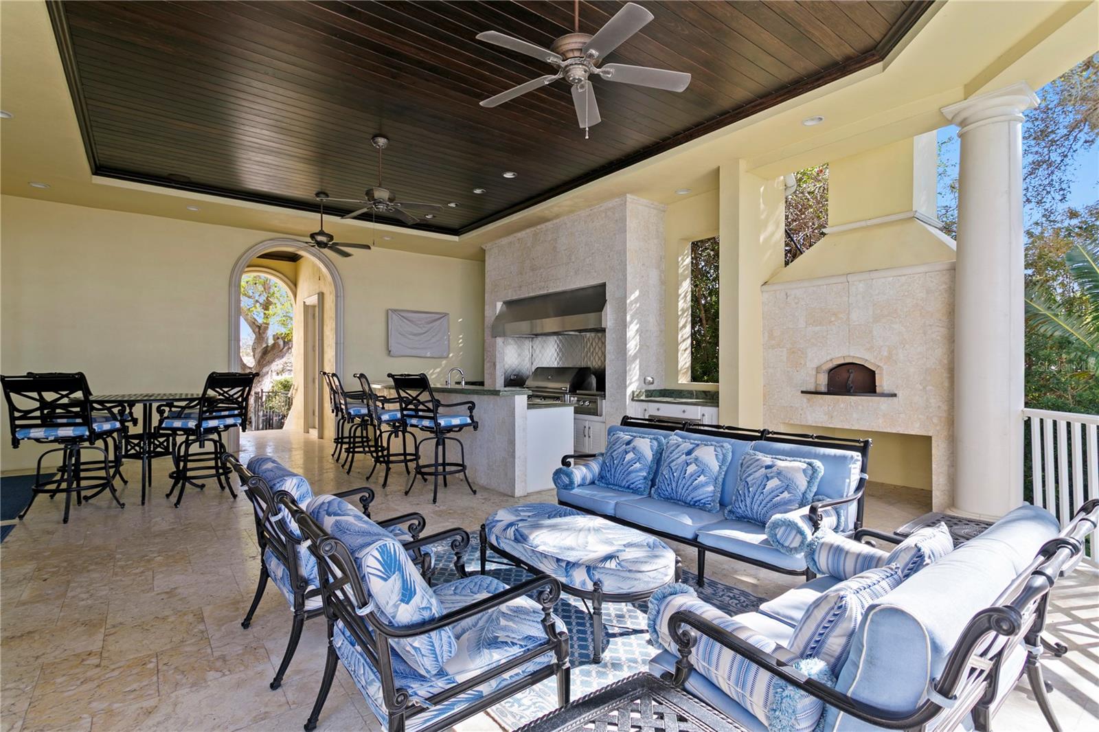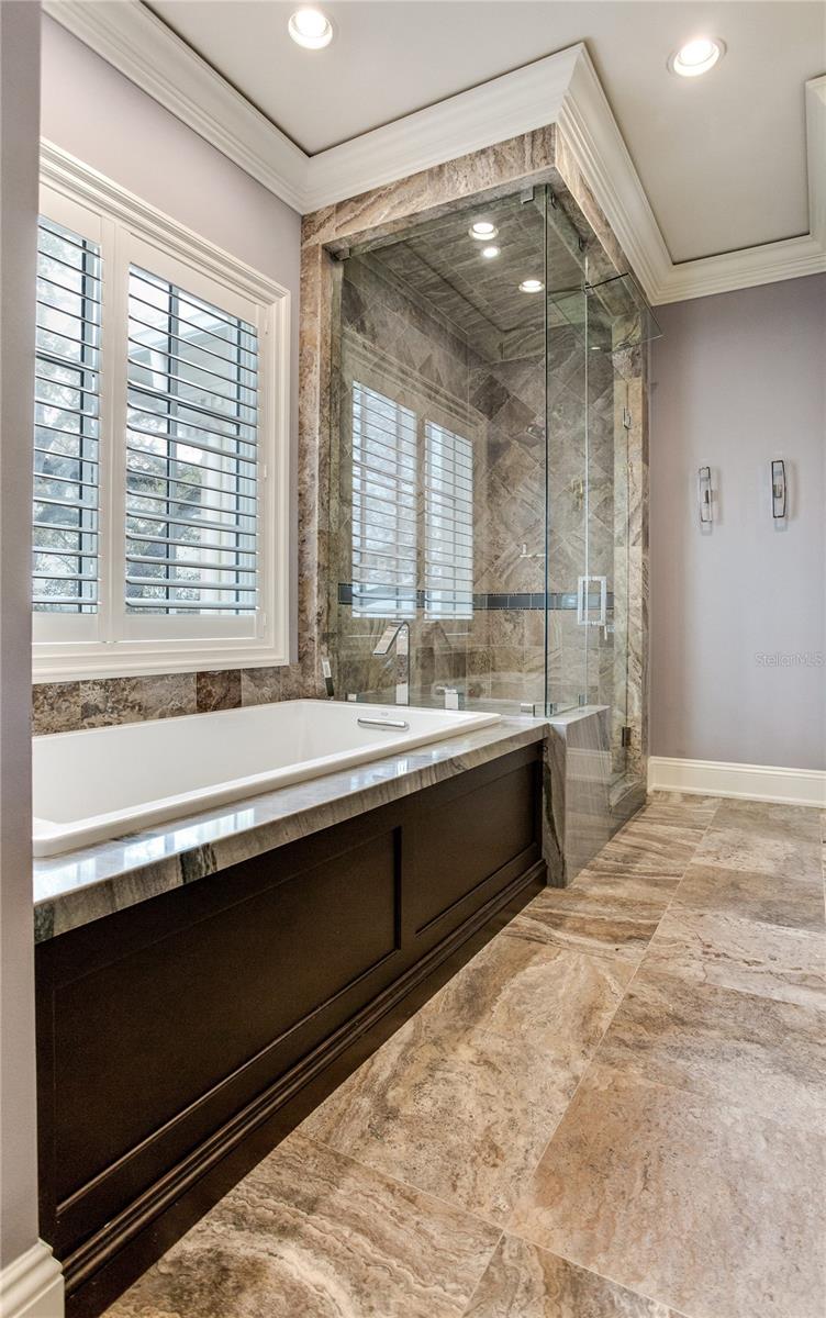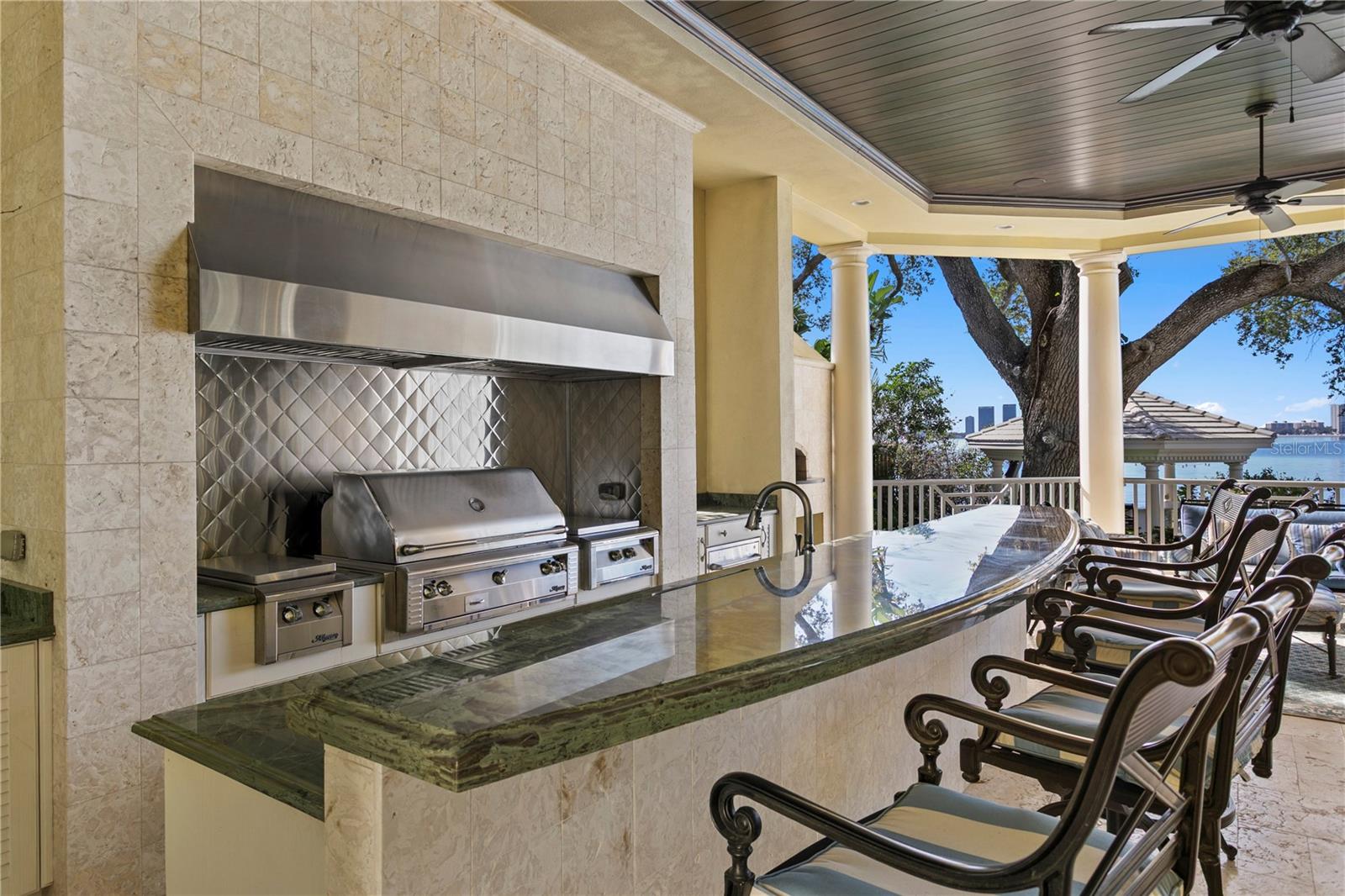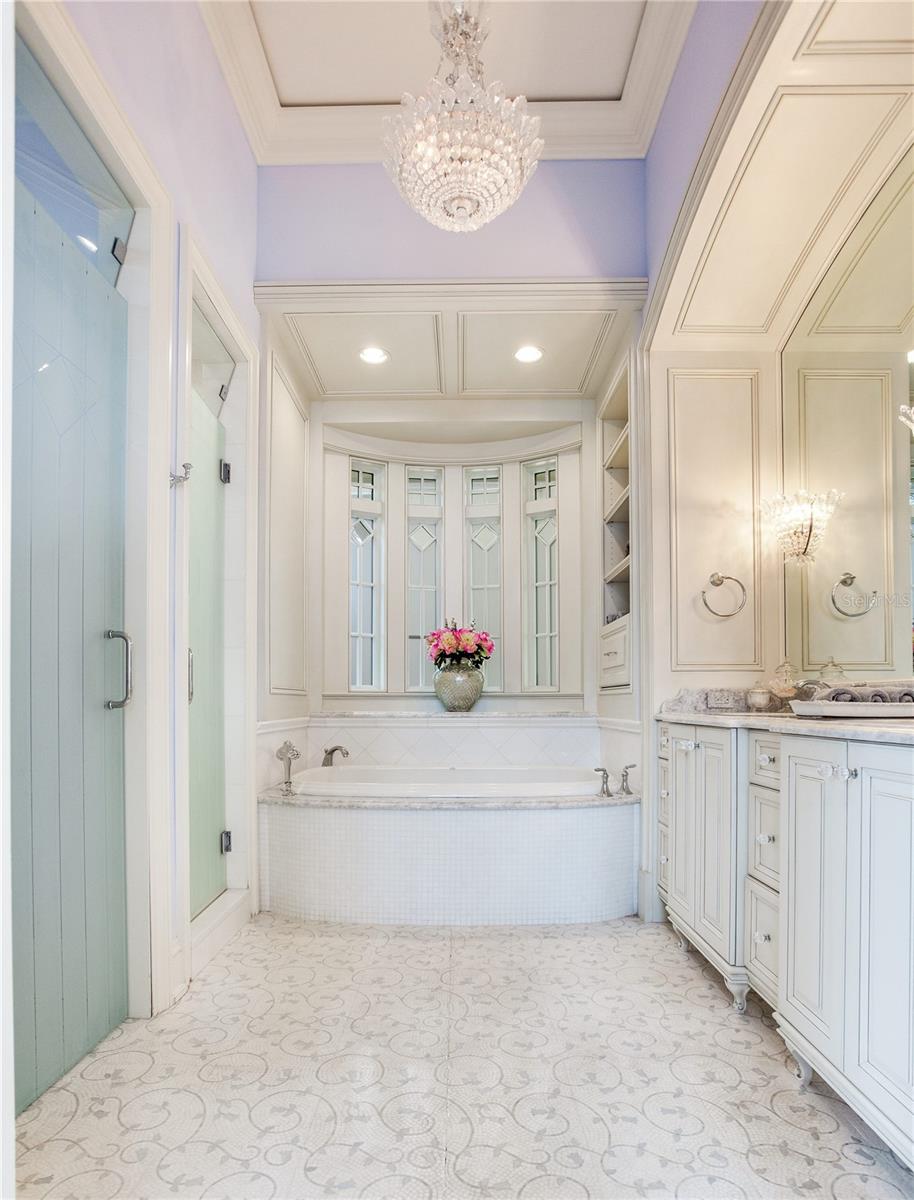 Experience the height of Livable Luxury in this extraordinary estate designed by Thomas Everett Lamb and built by Windstar Homes, an award-winning custom builder with over 100 industry accolades for craftsmanship and architectural excellence. Positioned on the open bay along Davis Islands, this one-of-a-kind residence blends timeless design with resort-style living. Created for grand-scale entertaining and refined everyday living, the home captures sweeping bay views, expansive terraces, and meticulously curated interiors. A stately arrival welcomes with parking for 9 vehicles and a 4-car garage, framed by hand-cast cement trim, shell detailing, and custom copper lanterns. Twin fountains accent the circular glass-paneled French doors, opening to a breathtaking foyer highlighted by a sweeping spiral staircase, intricate filigree ironwork, layered crown and dentil moldings, and a dramatic domed ceiling. The Grand Salon and formal dining spaces, including a dining alcove flanked by dual wine rooms with beveled glass, feature hardwood floors, hand-carved limestone fireplaces, and floor-to-ceiling arched windows. Walls of glass frame the west-facing veranda, gazebo, pool, fire pit, party dock, pickleball court, and unobstructed open bay. Exceptional craftsmanship is evident throughout, with concealed air-conditioning vents seamlessly integrated within the crown molding, deep windowsills, and extensive custom millwork. The chef’s kitchen centers around a massive island with beveled stone countertops and dual crystal chandeliers, complemented by Sub-Zero refrigeration, double dishwashers, and a Wolf range with griddle. A fully equipped scullery kitchen offers commercial refrigeration, double ovens, and additional prep space, ideal for catered events. A butler’s pantry, mudroom, and secondary laundry enhance daily functionality. Seamless indoor-outdoor living unfolds as the kitchen and great room open to a covered terrace featuring a pizza oven, warming drawer, beverage refrigerator, ice maker, sink, gas grill, and generous seating and dining areas overlooking the pool and bay. The first level also includes a bayfront office with custom cabinetry and fireplace, a game room with bar and adjacent theater, as well as a gym, craft, and multipurpose spaces. A private guest suite with rotunda seating, kitchenette, and elaborate bath completes the main floor. Upstairs, the primary suite is a private sanctuary occupying nearly one-third of the level. Entered through a grand vestibule, it features a bayfront sitting room with terrace access, limestone fireplace, dual custom walk-in closets with crystal chandeliers, and a spa-inspired bath with fireplace, steam shower, and marble finishes. Additional bedroom suites offer ensuite baths, custom cabinetry, and tranquil water or garden views, with many opening to private terraces. A separate guest or nanny suite, accessible via stairs and a hidden passage, includes a full kitchen, living area, bedroom, walk-in closet, laundry, and full bath. Outdoor living rivals a private resort, with a gazebo featuring marble bar seating for ten, a resort-style pool, fire pit, multiple terraces, pool baths, and a fully equipped kitchen. A crow’s nest terrace captures west-facing sunsets over the bay. With elevator access, 3 staircases, integrated technology, whole-home audio, and thoughtfully designed flow, this Davis Islands estate delivers architectural grandeur, modern luxury, and an unparalleled waterfront lifestyle.
