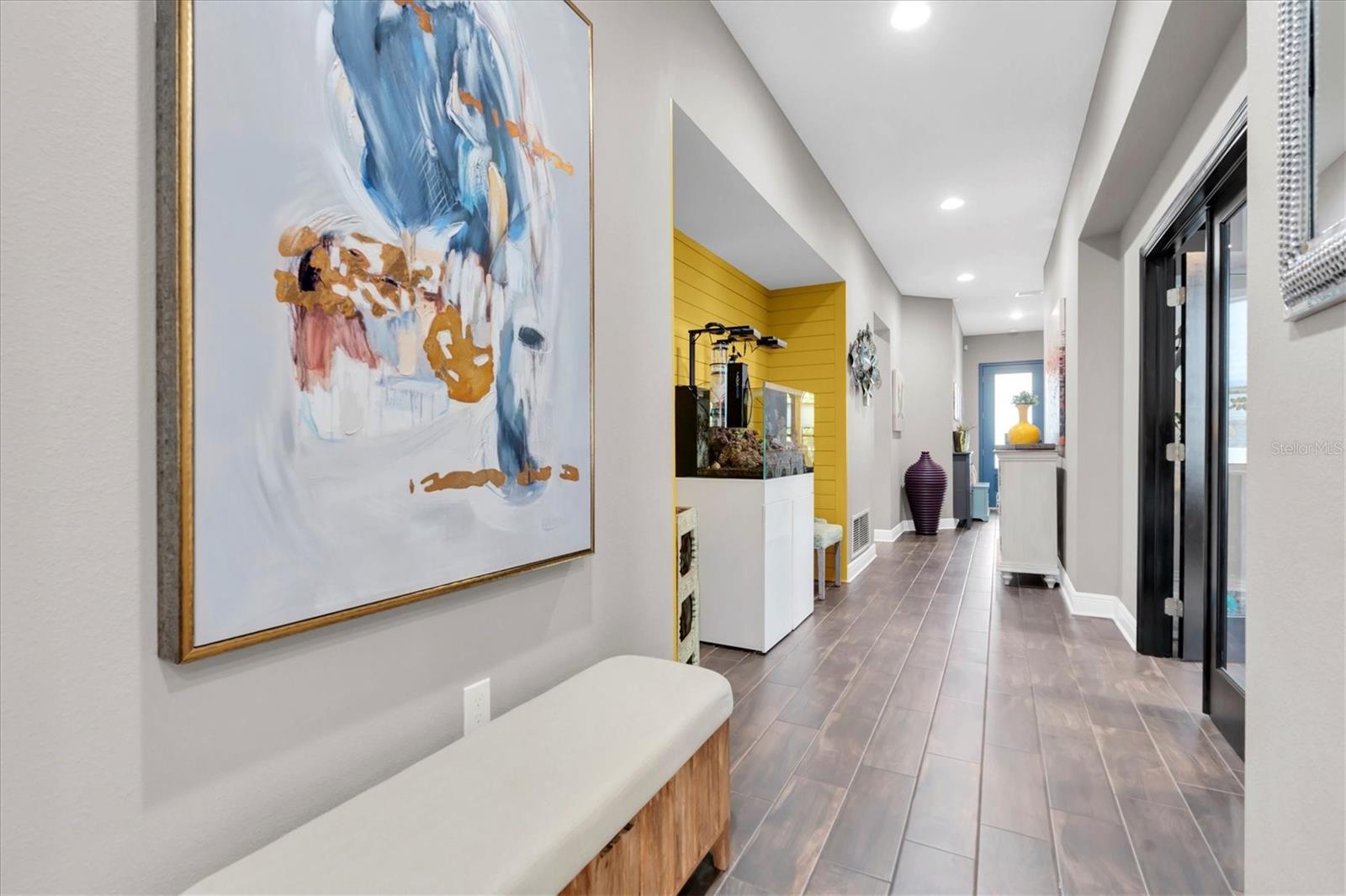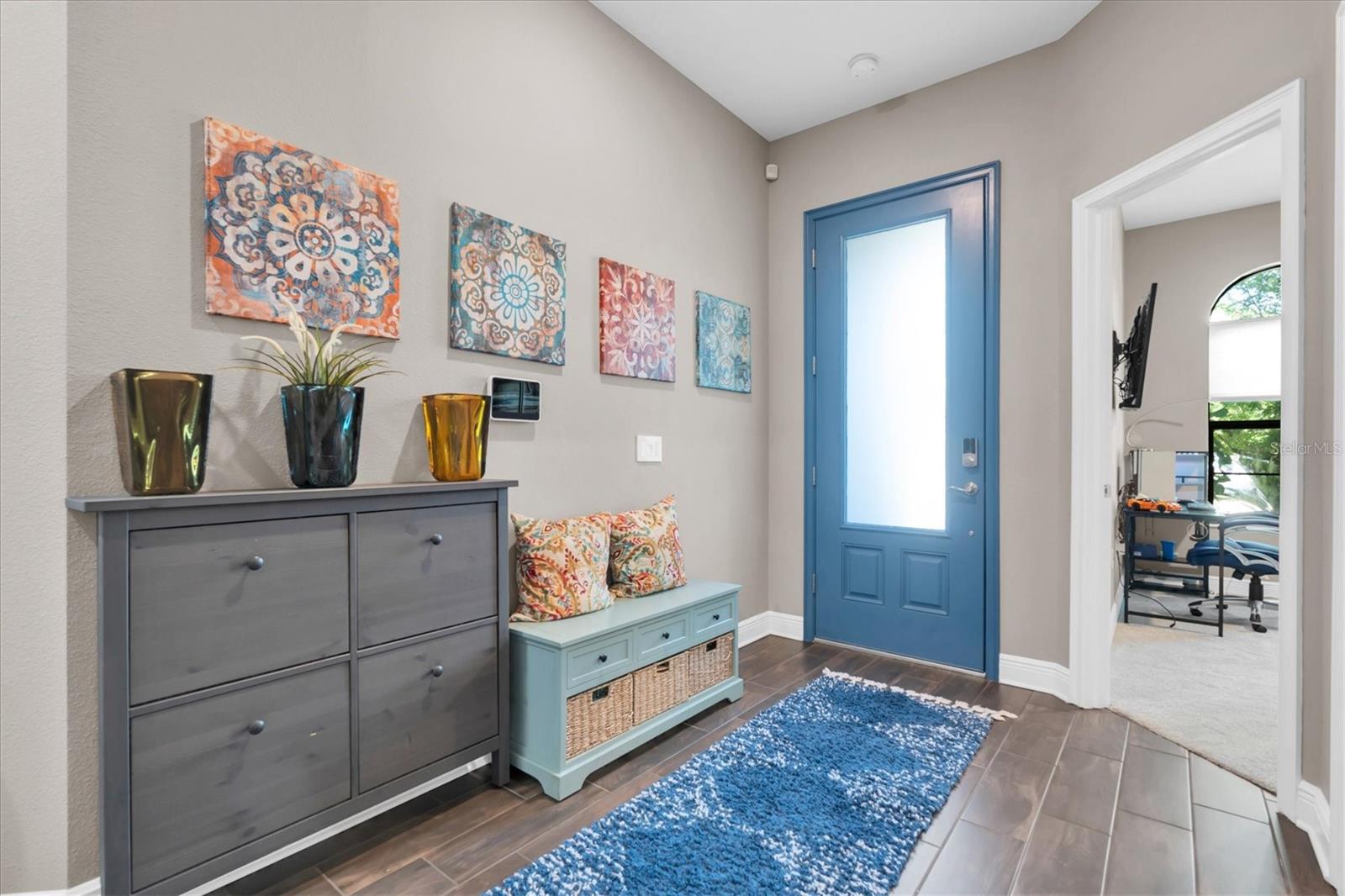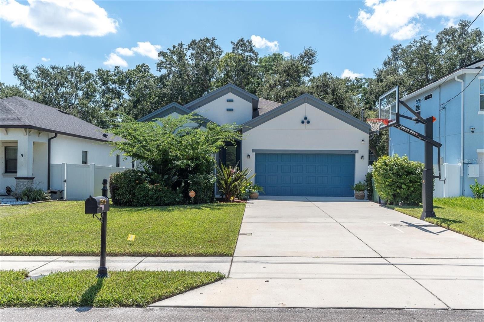Modern comfort and style come together in this 2019-built Tampa home on a spacious quarter-acre lot with no HOA and no CDD. Freshly painted inside and out, it features high ceilings, wood-look tile floors, and custom touches throughout. The flexible front room with French doors is perfect for a home office, playroom, or media space. The kitchen and main living area are the heart of the home, featuring granite countertops, a shiplap island, new backsplash, stainless steel appliances, upgraded cabinets with crown molding, a glass pantry door, and a walk-in pantry. The open layout connects to a dining nook and great room with sliding doors that lead to a covered lanai and fully fenced backyard—perfect for everyday living and entertaining. The owner’s suite includes a tray ceiling, large walk-in closet, and an upgraded bath with dual vanities, a frameless glass shower, and modern finishes. Two additional bedrooms provide space for guests or hobbies. Located in a no flood and no evacuation zone, this move-in ready home offers modern design, low maintenance, and an ideal Tampa location just minutes from shopping, dining, and major highways.