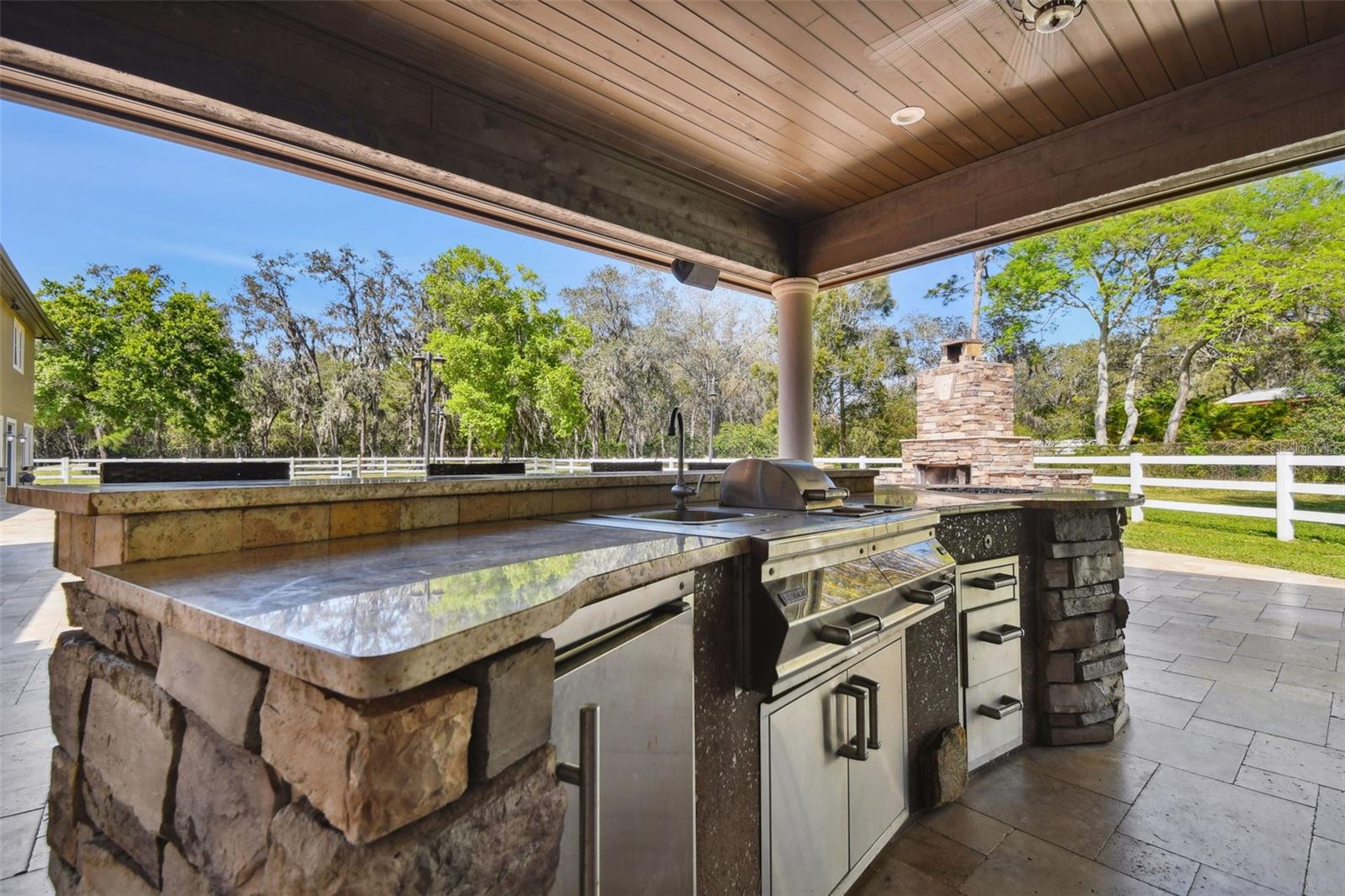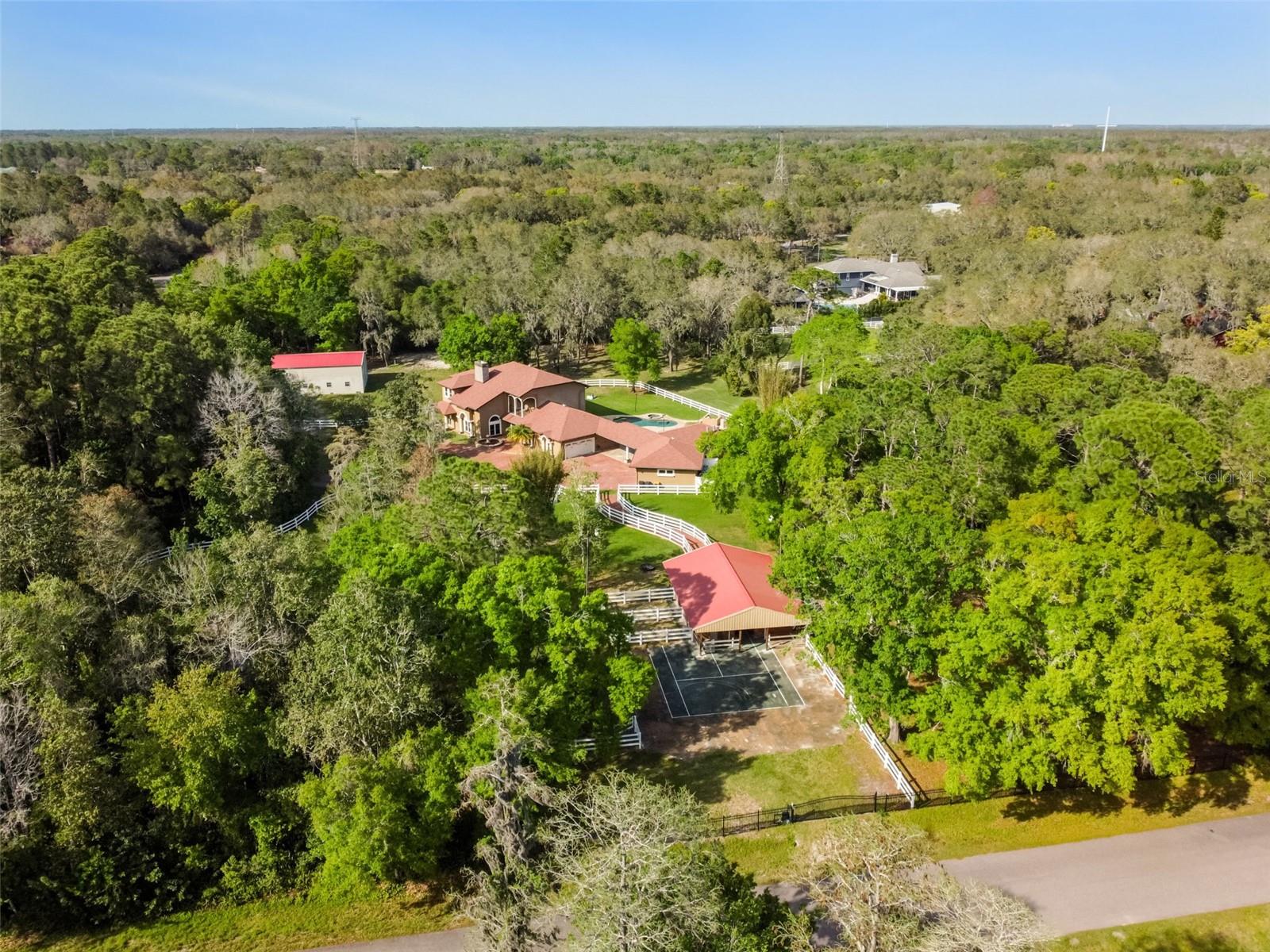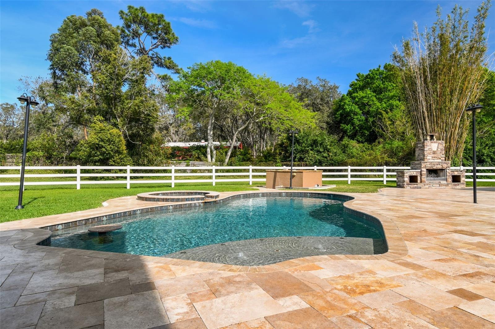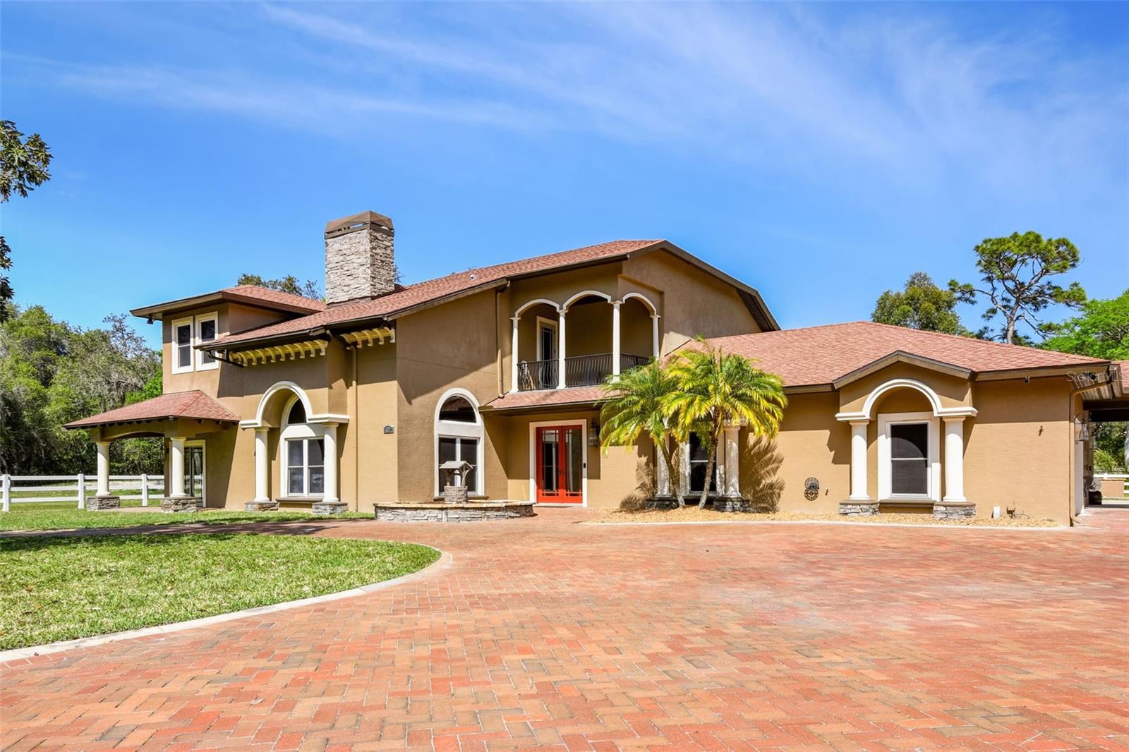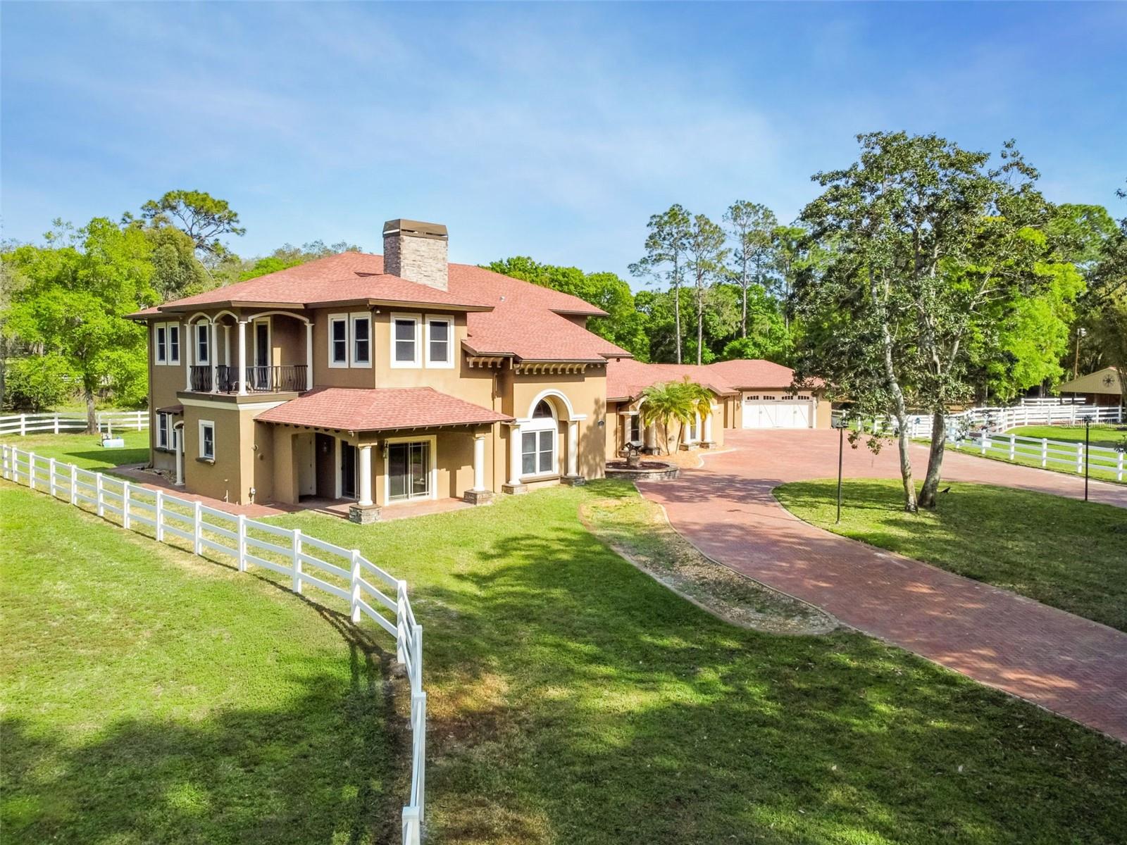 This stunning home has been renovated, reinvigorated, and added on to create an esquite estate. Coming through the private gates, you drive the brick-paved driveway to the beautiful home surrounded by over 4.4 acres of land, all fenced and gated. Included is a private pond with a fountain, a barn with three stables and a tack room, and a newly built 40'x50' workshop with a 6-inch concrete pad that is perfect for the car enthusiast, your boats, and RV storage. The home itself went through an amazing kitchen transformation. The new kitchen was redesigned and reconfigured for a better flow for parties and everyday living. This remodel entailed bringing in new cabinets, hardware, counters, flooring, lighting, ice maker, beverage fridge, and dishwashers. New paint throughout the home brings a cohesiveness from room to room. The living room, with its vaulted ceilings and oversized fireplace, has new flooring in 2024. Down the hall are three bedrooms, two bathrooms, and a large laundry room. One of the guest bedrooms is spacious and has a massive walk-in closet. Upstairs is one of the most thoughtfully designed primary bedrooms. It encompasses new hardwood flooring, a fireplace, a private office, a gym/workout room, a laundry room, walk-in closets, and two private balconies. The office, with its barn doors, has a fridge and sink for your convenience and could be used as a nursery. The closets are oversized with custom cabinetry and one with a gorgeous granite-topped island. The primary bathroom is luxurious, with a jetted tub, a walk-in shower, two separate vanities, one with a makeup area, and a water closet with a bidet. The gym is off the bathroom for a perfect workout. The laundry room is conveniently located by the closets. No details have been left out of the spectacular primary bedroom. Stepping outside by the pool, a covered patio area has been added to shade the outdoor kitchen. The outdoor kitchen houses a BBQ with two gas burners, a Primo Grill, a TV, a refrigerator, an ice maker, a built-in blender, and a fire pit. The saltwater pool was recently redone in 2024 with its spa, sun shelf, table, and a nearby outdoor woodburning fireplace are all surrounded by stunning travertine, recently sealed. The house boasts two sets of 2 car garages; one is attached to the house, and the other garage connects by a breezeway. The breezeway area is the perfect place to add outdoor games. An air-conditioned safe room is nearby. The seller added the 40x50 workshop in 2021 that has 6" concrete floors and four 16x16 roll-up bay doors for your RV, boats, or whatever you need. The barn has three stalls, a tack room, a wash stall, electricity, and water. The estate has a turn-out pasture, and a separate new electric gate is nearby for easy access to the barn. The outside was painted in 2020 and has security, speakers, and water filtration throughout the home. A new roof was installed in 2021, 3 new tankless water heaters in 2020, and 3 AC units in 2018. This picturesque estate encompasses tranquility and serenity but is close to the beaches, Tampa, St. Petersburg, and the airport.