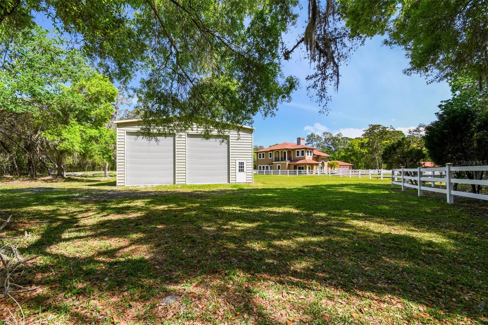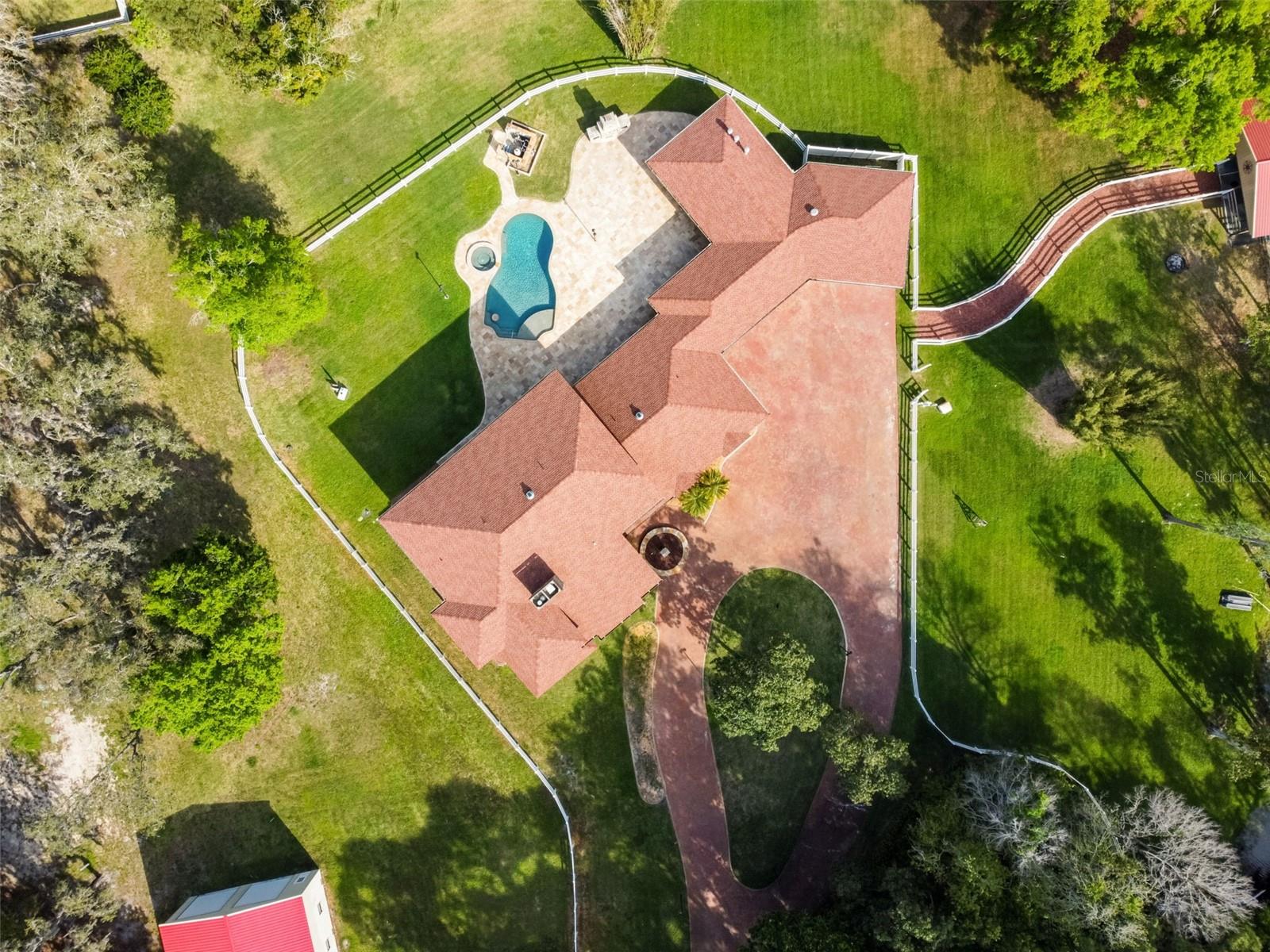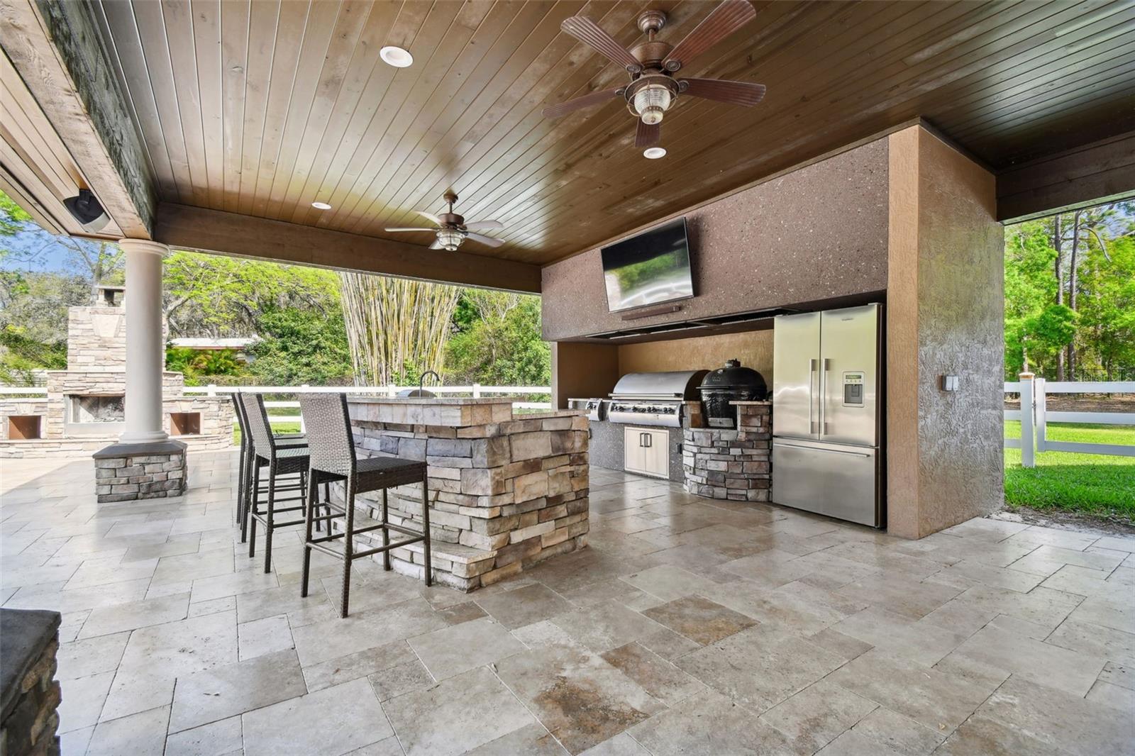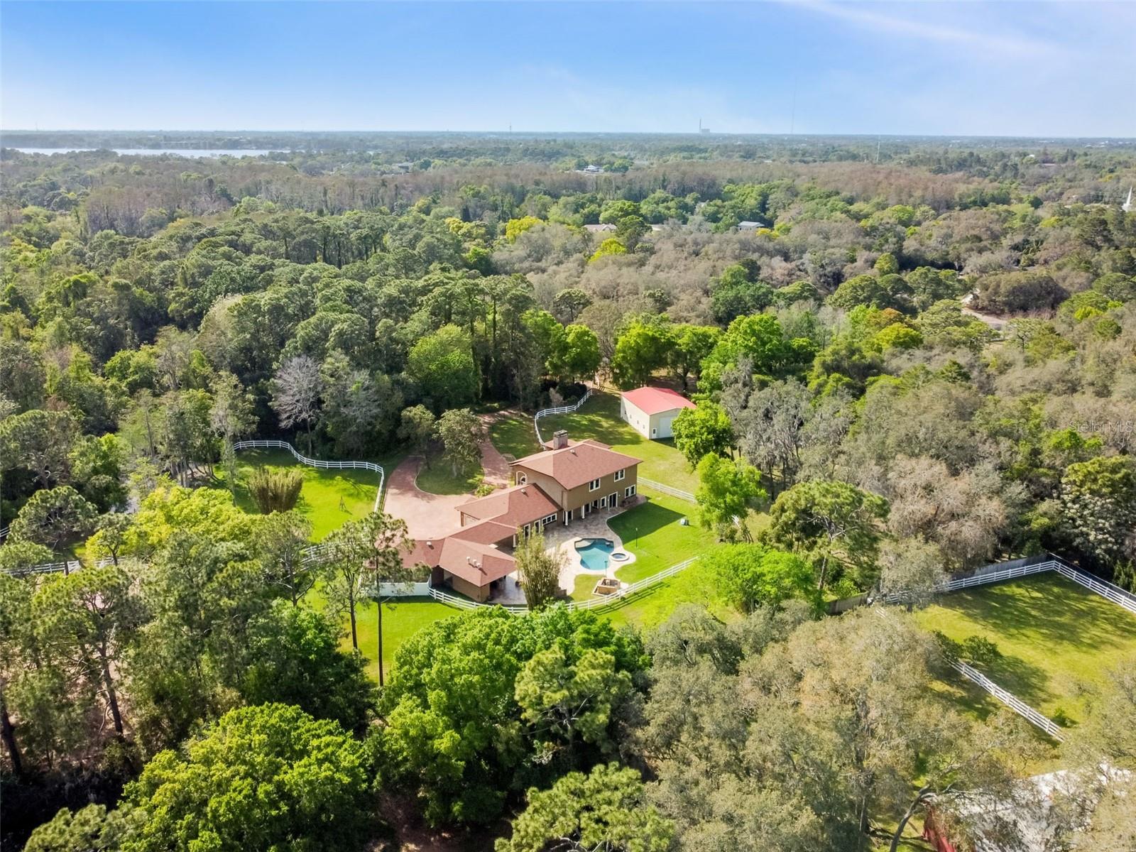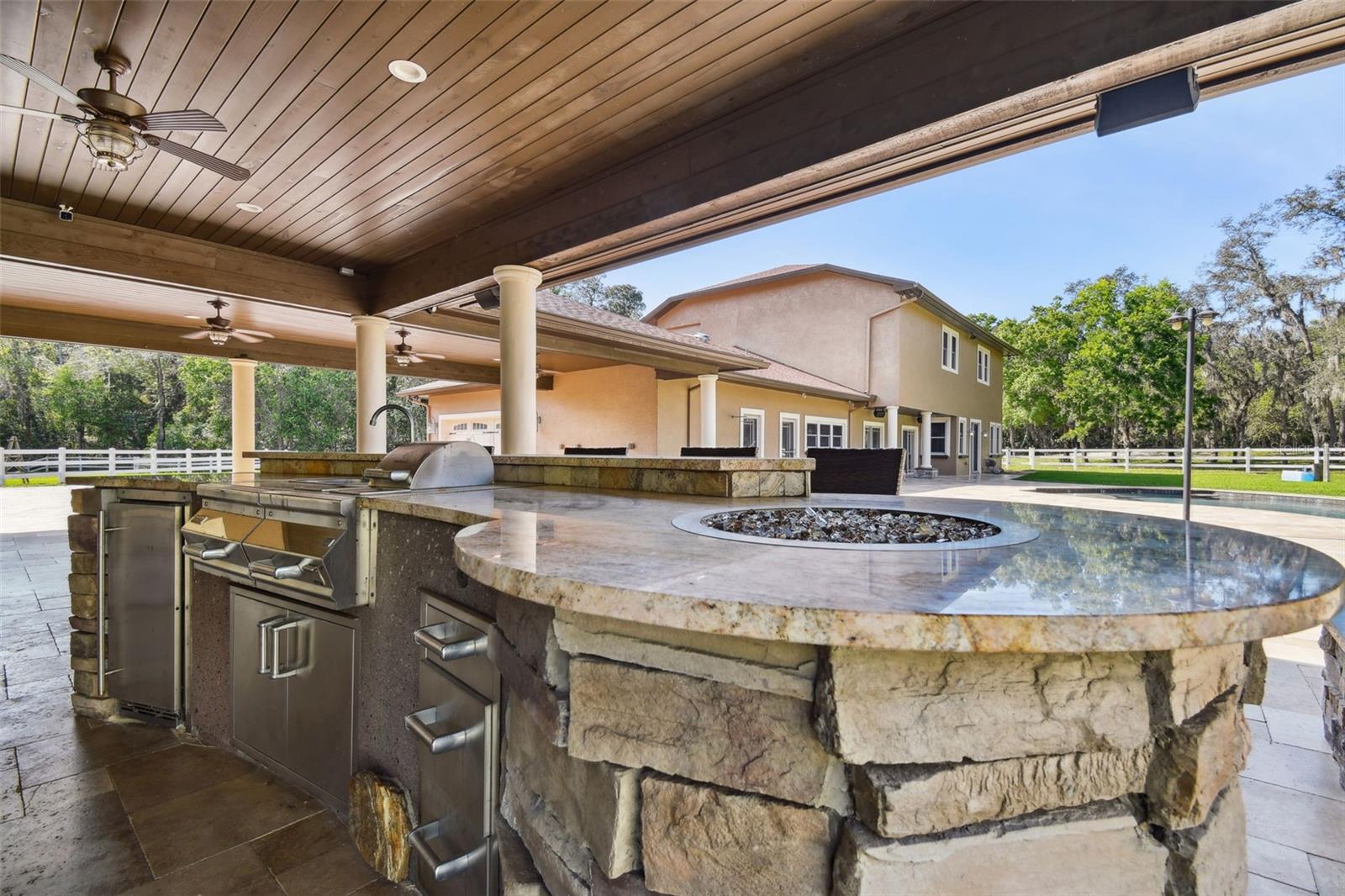 This stunning home has been renovated, reinvigorated, and added on to create an esquite estate. Coming through the private gates, you drive the brick-paved driveway to the beautiful home surrounded by over 4.4 acres of land, all fenced and gated. Included is a private pond with a fountain, a barn with three stables and a tack room, and a newly built 40'x50' workshop with a 6-inch concrete pad that is perfect for the car enthusiast, your boats, and RV storage. The home itself went through an amazing kitchen transformation. The new kitchen was redesigned and reconfigured for a better flow for parties and everyday living. This remodel entailed bringing in new cabinets, hardware, counters, flooring, lighting, ice maker, beverage fridge, and dishwashers. New paint throughout the home brings a cohesiveness from room to room. The living room, with its vaulted ceilings and oversized fireplace, has new flooring in 2024. Down the hall are three bedrooms, two bathrooms, and a large laundry room. One of the guest bedrooms is spacious and has a massive walk-in closet. Upstairs is one of the most thoughtfully designed primary bedrooms. It encompasses new hardwood flooring, a fireplace, a private office, a gym/workout room, a laundry room, walk-in closets, and two private balconies. The office, with its barn doors, has a fridge and sink for your convenience and could be used as a nursery. The closets are oversized with custom cabinetry and one with a gorgeous granite-topped island. The primary bathroom is luxurious, with a jetted tub, a walk-in shower, two separate vanities, one with a makeup area, and a water closet with a bidet. The gym is off the bathroom for a perfect workout. The laundry room is conveniently located by the closets. No details have been left out of the spectacular primary bedroom. Stepping outside by the pool, a covered patio area has been added to shade the outdoor kitchen. The outdoor kitchen houses a BBQ with two gas burners, a Primo Grill, a TV, a refrigerator, an ice maker, a built-in blender, and a fire pit. The saltwater pool was recently redone in 2024 with its spa, sun shelf, table, and a nearby outdoor woodburning fireplace are all surrounded by stunning travertine, recently sealed. The house boasts two sets of 2 car garages; one is attached to the house, and the other garage connects by a breezeway. The breezeway area is the perfect place to add outdoor games. An air-conditioned safe room is nearby. The seller added the 40x50 workshop in 2021 that has 6" concrete floors and four 16x16 roll-up bay doors for your RV, boats, or whatever you need. The barn has three stalls, a tack room, a wash stall, electricity, and water. The estate has a turn-out pasture, and a separate new electric gate is nearby for easy access to the barn. The outside was painted in 2020 and has security, speakers, and water filtration throughout the home. A new roof was installed in 2021, 3 new tankless water heaters in 2020, and 3 AC units in 2018. This picturesque estate encompasses tranquility and serenity but is close to the beaches, Tampa, St. Petersburg, and the airport.
