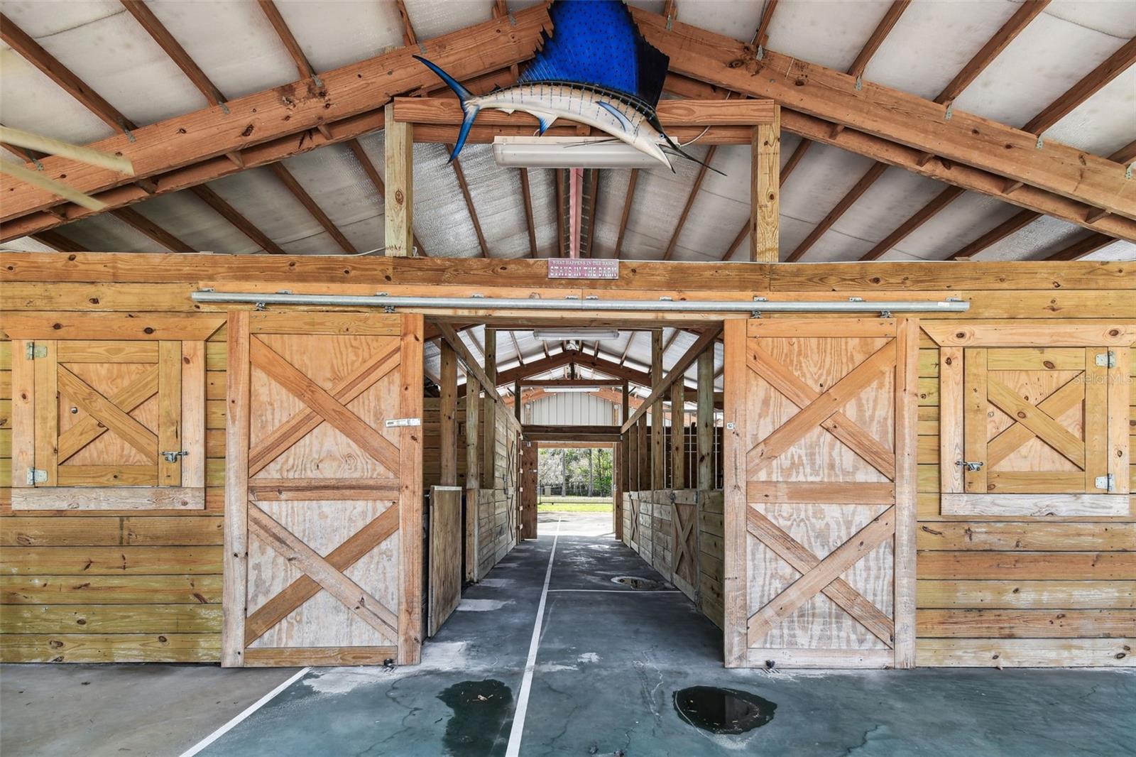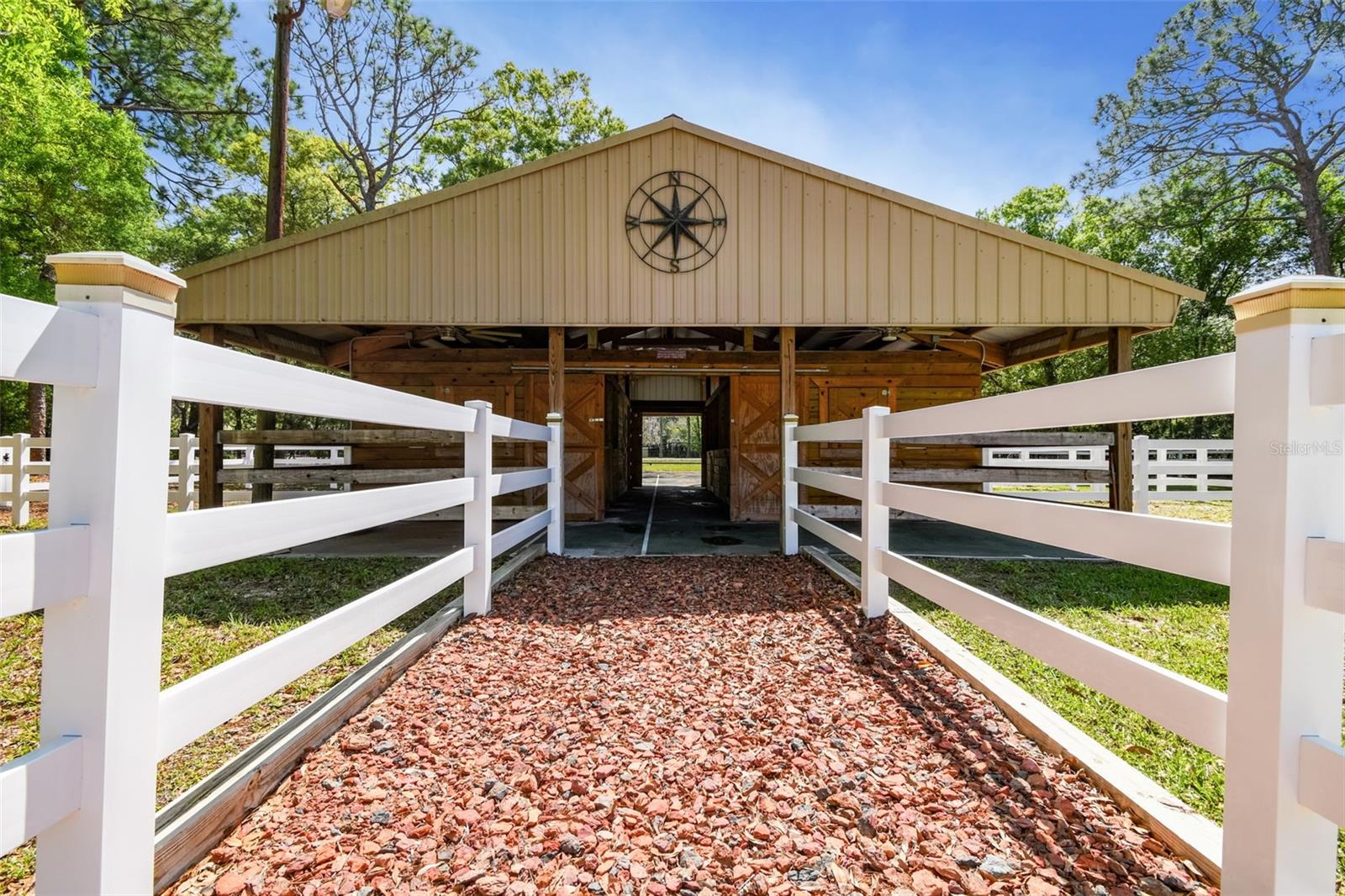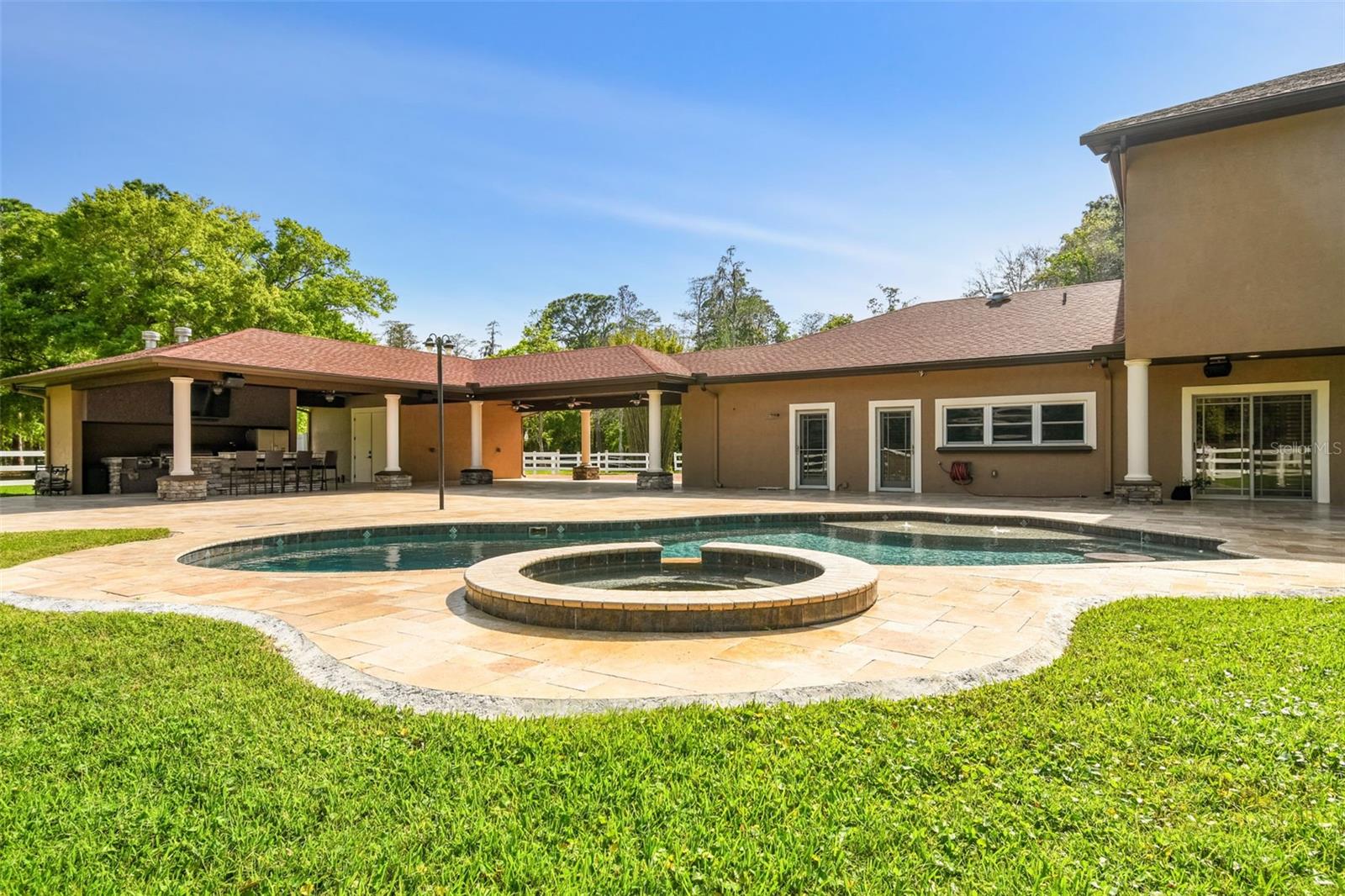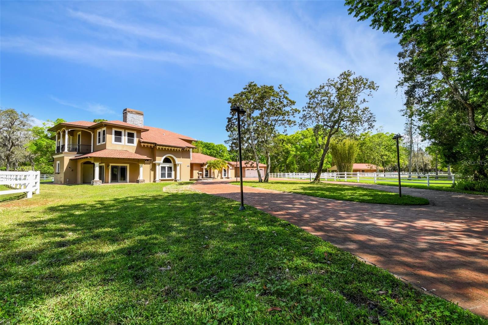 This stunning home has been renovated, reinvigorated, and added on to create an esquite estate. Coming through the private gates, you drive the brick-paved driveway to the beautiful home surrounded by over 4.4 acres of land, all fenced and gated. Included is a private pond with a fountain, a barn with three stables and a tack room, and a newly built 40'x50' workshop with a 6-inch concrete pad that is perfect for the car enthusiast, your boats, and RV storage. The home itself went through an amazing kitchen transformation. The new kitchen was redesigned and reconfigured for a better flow for parties and everyday living. This remodel entailed bringing in new cabinets, hardware, counters, flooring, lighting, ice maker, beverage fridge, and dishwashers. New paint throughout the home brings a cohesiveness from room to room. The living room, with its vaulted ceilings and oversized fireplace, has new flooring in 2024. Down the hall are three bedrooms, two bathrooms, and a large laundry room. One of the guest bedrooms is spacious and has a massive walk-in closet. Upstairs is one of the most thoughtfully designed primary bedrooms. It encompasses new hardwood flooring, a fireplace, a private office, a gym/workout room, a laundry room, walk-in closets, and two private balconies. The office, with its barn doors, has a fridge and sink for your convenience and could be used as a nursery. The closets are oversized with custom cabinetry and one with a gorgeous granite-topped island. The primary bathroom is luxurious, with a jetted tub, a walk-in shower, two separate vanities, one with a makeup area, and a water closet with a bidet. The gym is off the bathroom for a perfect workout. The laundry room is conveniently located by the closets. No details have been left out of the spectacular primary bedroom. Stepping outside by the pool, a covered patio area has been added to shade the outdoor kitchen. The outdoor kitchen houses a BBQ with two gas burners, a Primo Grill, a TV, a refrigerator, an ice maker, a built-in blender, and a fire pit. The saltwater pool was recently redone in 2024 with its spa, sun shelf, table, and a nearby outdoor woodburning fireplace are all surrounded by stunning travertine, recently sealed. The house boasts two sets of 2 car garages; one is attached to the house, and the other garage connects by a breezeway. The breezeway area is the perfect place to add outdoor games. An air-conditioned safe room is nearby. The seller added the 40x50 workshop in 2021 that has 6" concrete floors and four 16x16 roll-up bay doors for your RV, boats, or whatever you need. The barn has three stalls, a tack room, a wash stall, electricity, and water. The estate has a turn-out pasture, and a separate new electric gate is nearby for easy access to the barn. The outside was painted in 2020 and has security, speakers, and water filtration throughout the home. A new roof was installed in 2021, 3 new tankless water heaters in 2020, and 3 AC units in 2018. This picturesque estate encompasses tranquility and serenity but is close to the beaches, Tampa, St. Petersburg, and the airport.
