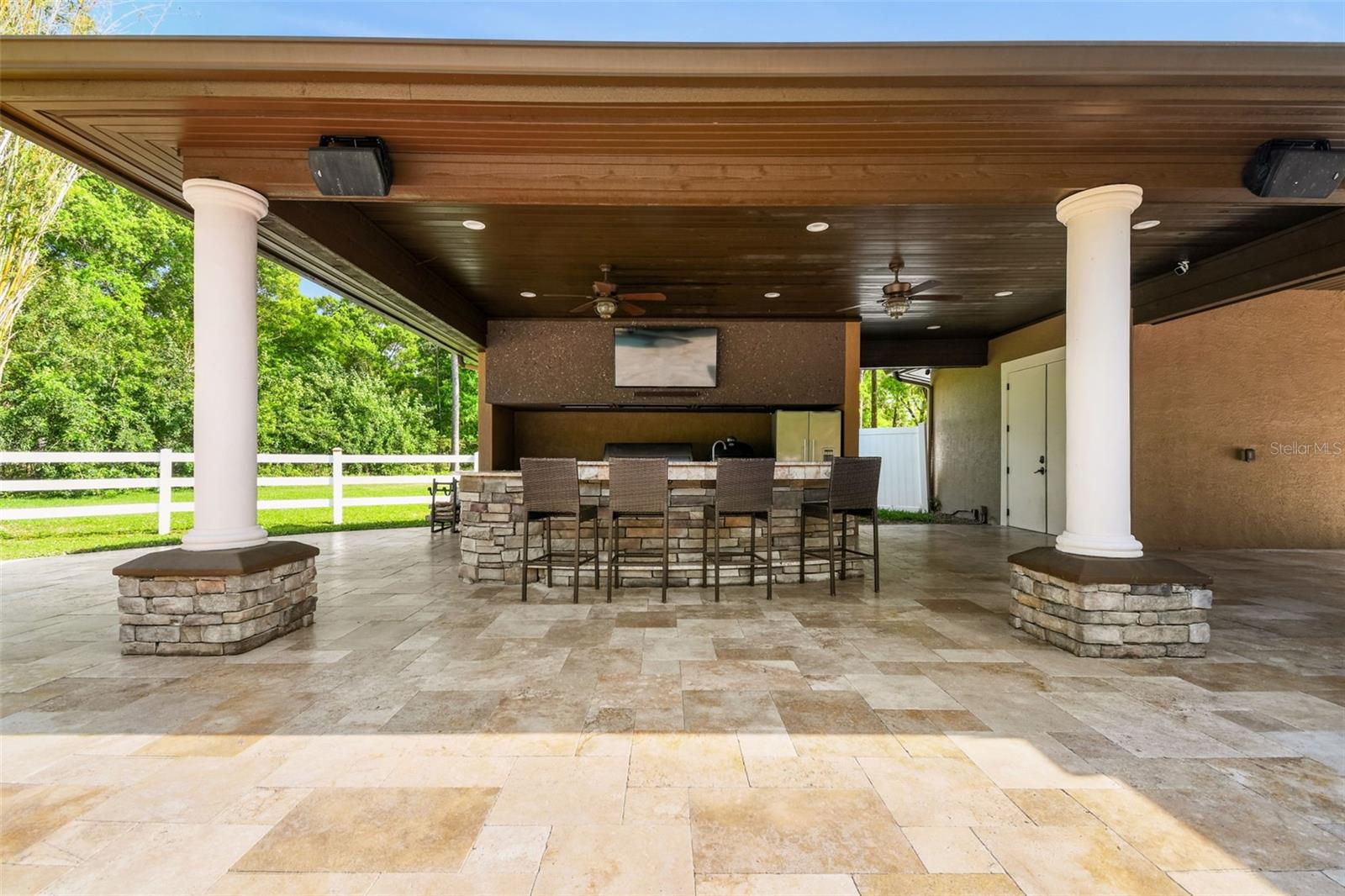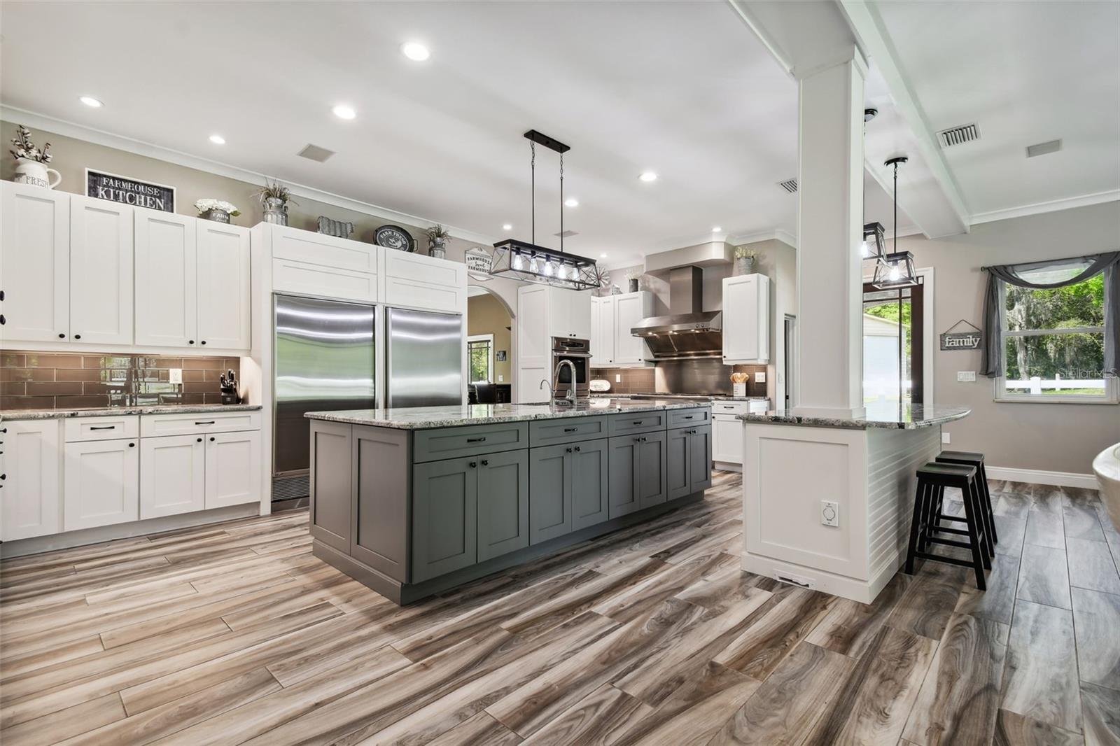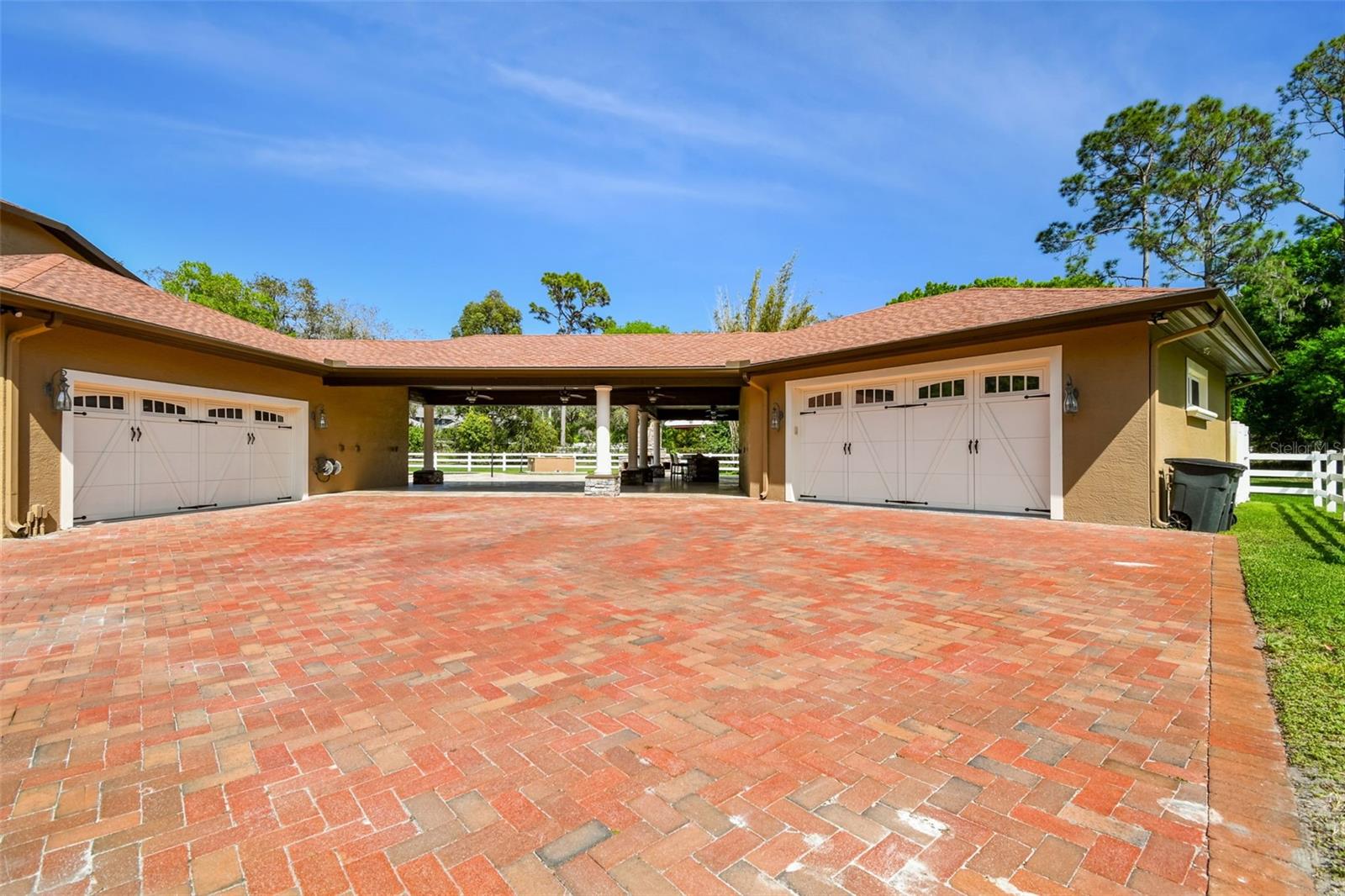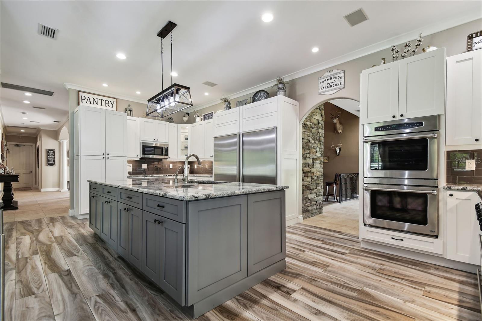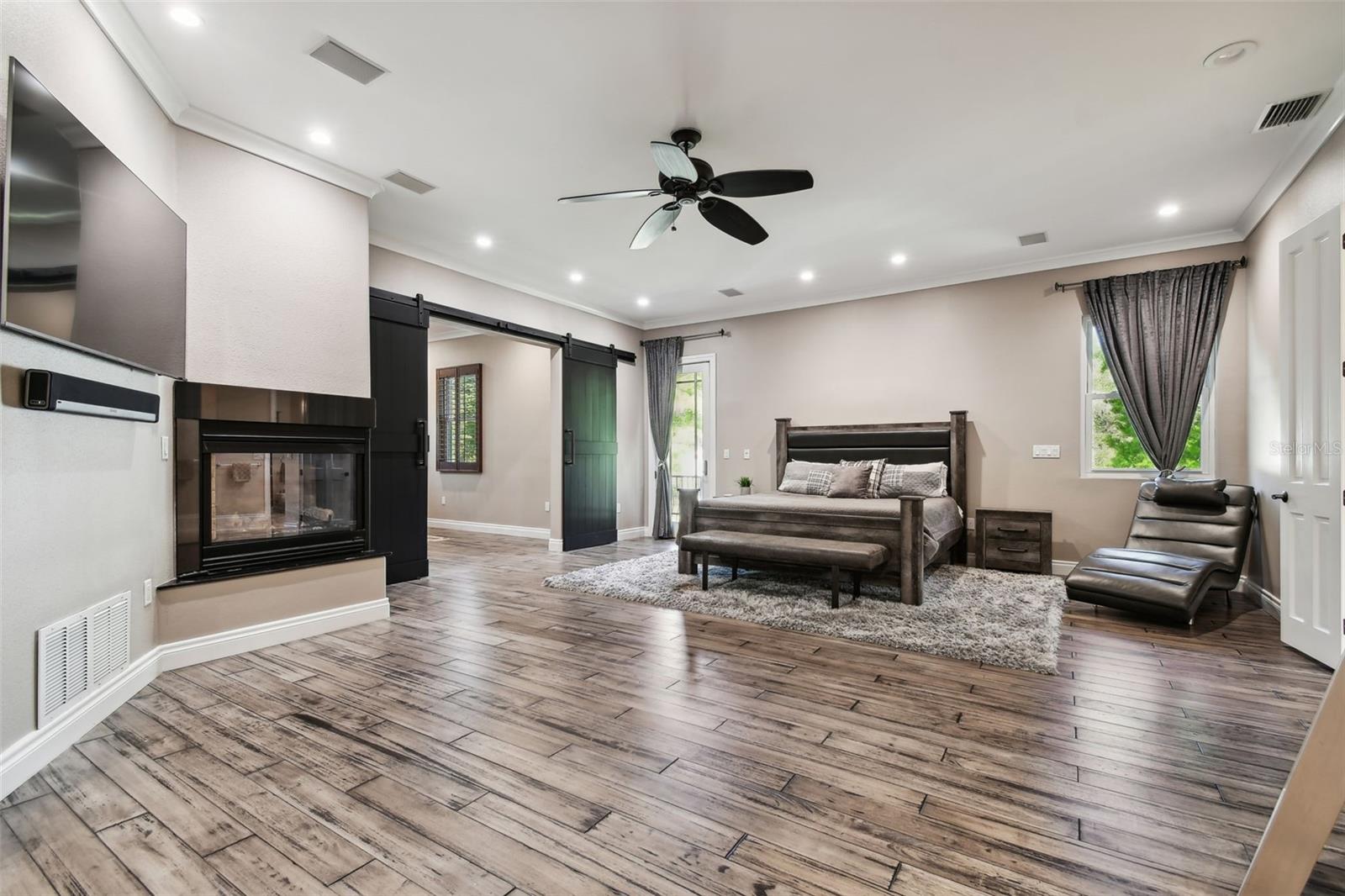 This stunning home has been renovated, reinvigorated, and added on to create an esquite estate. Coming through the private gates, you drive the brick-paved driveway to the beautiful home surrounded by over 4.4 acres of land, all fenced and gated. Included is a private pond with a fountain, a barn with three stables and a tack room, and a newly built 40'x50' workshop with a 6-inch concrete pad that is perfect for the car enthusiast, your boats, and RV storage. The home itself went through an amazing kitchen transformation. The new kitchen was redesigned and reconfigured for a better flow for parties and everyday living. This remodel entailed bringing in new cabinets, hardware, counters, flooring, lighting, ice maker, beverage fridge, and dishwashers. New paint throughout the home brings a cohesiveness from room to room. The living room, with its vaulted ceilings and oversized fireplace, has new flooring in 2024. Down the hall are three bedrooms, two bathrooms, and a large laundry room. One of the guest bedrooms is spacious and has a massive walk-in closet. Upstairs is one of the most thoughtfully designed primary bedrooms. It encompasses new hardwood flooring, a fireplace, a private office, a gym/workout room, a laundry room, walk-in closets, and two private balconies. The office, with its barn doors, has a fridge and sink for your convenience and could be used as a nursery. The closets are oversized with custom cabinetry and one with a gorgeous granite-topped island. The primary bathroom is luxurious, with a jetted tub, a walk-in shower, two separate vanities, one with a makeup area, and a water closet with a bidet. The gym is off the bathroom for a perfect workout. The laundry room is conveniently located by the closets. No details have been left out of the spectacular primary bedroom. Stepping outside by the pool, a covered patio area has been added to shade the outdoor kitchen. The outdoor kitchen houses a BBQ with two gas burners, a Primo Grill, a TV, a refrigerator, an ice maker, a built-in blender, and a fire pit. The saltwater pool was recently redone in 2024 with its spa, sun shelf, table, and a nearby outdoor woodburning fireplace are all surrounded by stunning travertine, recently sealed. The house boasts two sets of 2 car garages; one is attached to the house, and the other garage connects by a breezeway. The breezeway area is the perfect place to add outdoor games. An air-conditioned safe room is nearby. The seller added the 40x50 workshop in 2021 that has 6" concrete floors and four 16x16 roll-up bay doors for your RV, boats, or whatever you need. The barn has three stalls, a tack room, a wash stall, electricity, and water. The estate has a turn-out pasture, and a separate new electric gate is nearby for easy access to the barn. The outside was painted in 2020 and has security, speakers, and water filtration throughout the home. A new roof was installed in 2021, 3 new tankless water heaters in 2020, and 3 AC units in 2018. This picturesque estate encompasses tranquility and serenity but is close to the beaches, Tampa, St. Petersburg, and the airport.