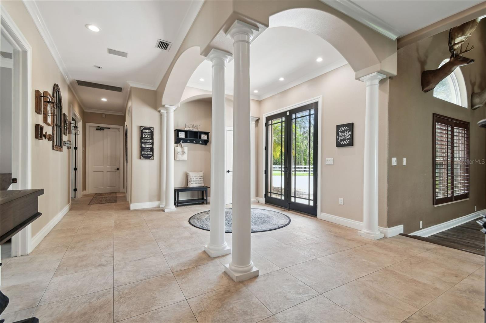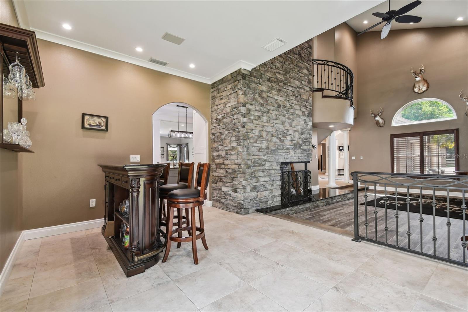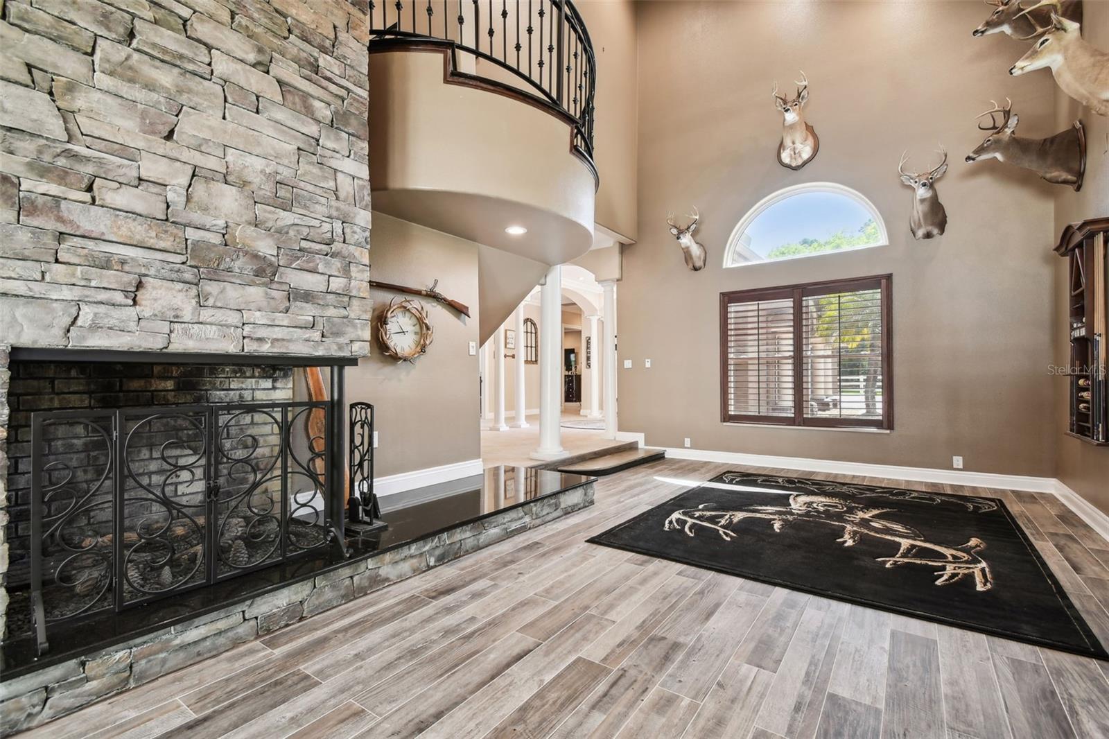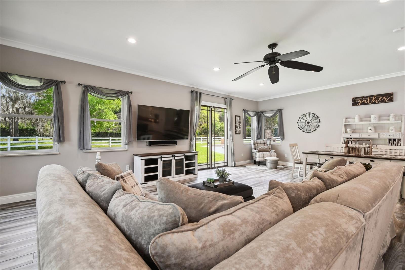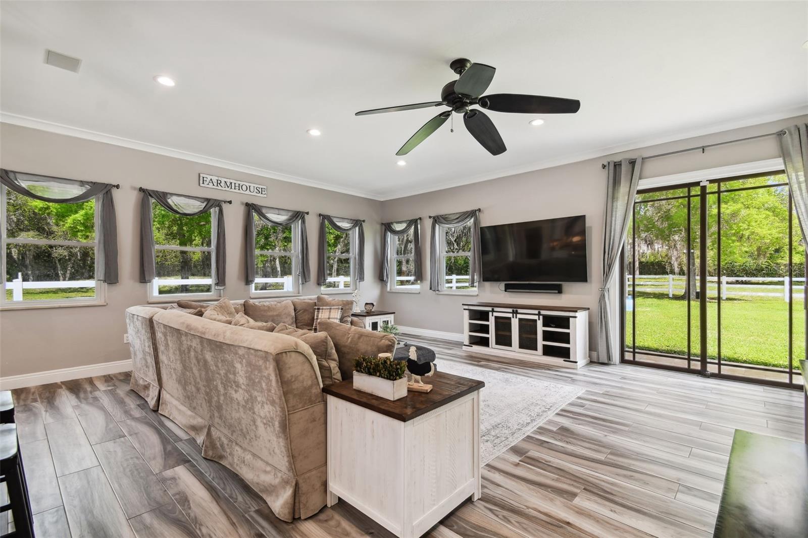 This stunning home has been renovated, reinvigorated, and added on to create an esquite estate. Coming through the private gates, you drive the brick-paved driveway to the beautiful home surrounded by over 4.4 acres of land, all fenced and gated. Included is a private pond with a fountain, a barn with three stables and a tack room, and a newly built 40'x50' workshop with a 6-inch concrete pad that is perfect for the car enthusiast, your boats, and RV storage. The home itself went through an amazing kitchen transformation. The new kitchen was redesigned and reconfigured for a better flow for parties and everyday living. This remodel entailed bringing in new cabinets, hardware, counters, flooring, lighting, ice maker, beverage fridge, and dishwashers. New paint throughout the home brings a cohesiveness from room to room. The living room, with its vaulted ceilings and oversized fireplace, has new flooring in 2024. Down the hall are three bedrooms, two bathrooms, and a large laundry room. One of the guest bedrooms is spacious and has a massive walk-in closet. Upstairs is one of the most thoughtfully designed primary bedrooms. It encompasses new hardwood flooring, a fireplace, a private office, a gym/workout room, a laundry room, walk-in closets, and two private balconies. The office, with its barn doors, has a fridge and sink for your convenience and could be used as a nursery. The closets are oversized with custom cabinetry and one with a gorgeous granite-topped island. The primary bathroom is luxurious, with a jetted tub, a walk-in shower, two separate vanities, one with a makeup area, and a water closet with a bidet. The gym is off the bathroom for a perfect workout. The laundry room is conveniently located by the closets. No details have been left out of the spectacular primary bedroom. Stepping outside by the pool, a covered patio area has been added to shade the outdoor kitchen. The outdoor kitchen houses a BBQ with two gas burners, a Primo Grill, a TV, a refrigerator, an ice maker, a built-in blender, and a fire pit. The saltwater pool was recently redone in 2024 with its spa, sun shelf, table, and a nearby outdoor woodburning fireplace are all surrounded by stunning travertine, recently sealed. The house boasts two sets of 2 car garages; one is attached to the house, and the other garage connects by a breezeway. The breezeway area is the perfect place to add outdoor games. An air-conditioned safe room is nearby. The seller added the 40x50 workshop in 2021 that has 6" concrete floors and four 16x16 roll-up bay doors for your RV, boats, or whatever you need. The barn has three stalls, a tack room, a wash stall, electricity, and water. The estate has a turn-out pasture, and a separate new electric gate is nearby for easy access to the barn. The outside was painted in 2020 and has security, speakers, and water filtration throughout the home. A new roof was installed in 2021, 3 new tankless water heaters in 2020, and 3 AC units in 2018. This picturesque estate encompasses tranquility and serenity but is close to the beaches, Tampa, St. Petersburg, and the airport.
