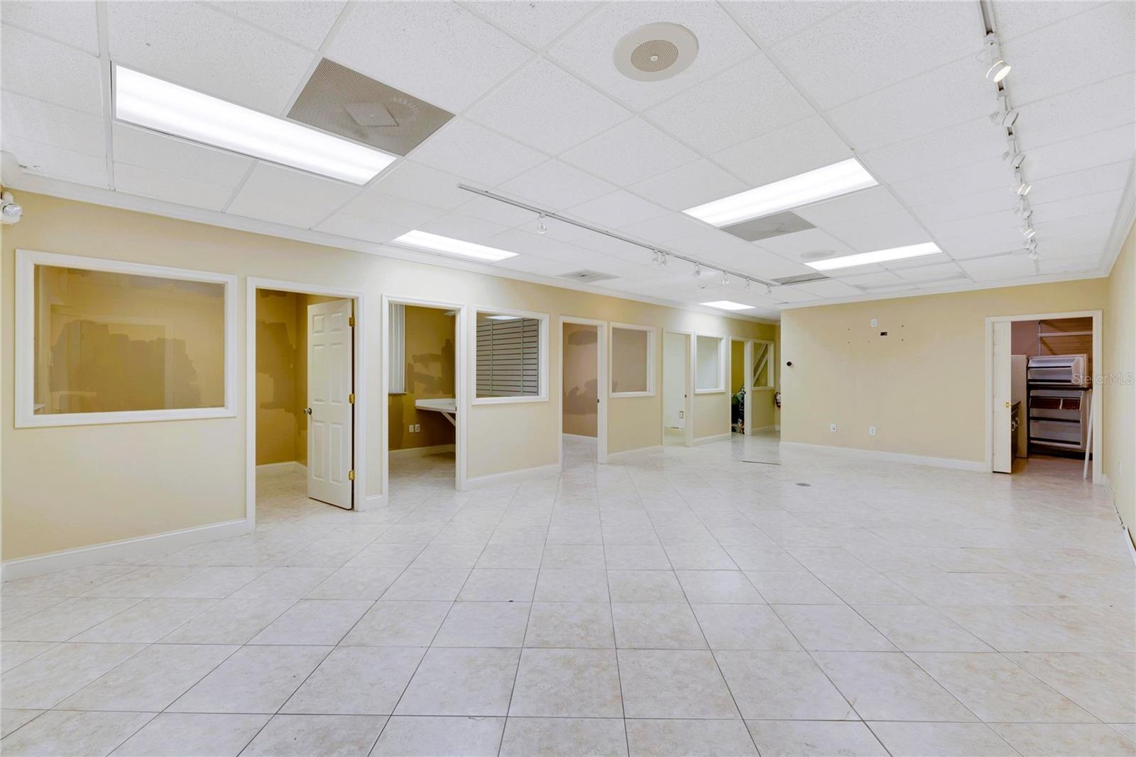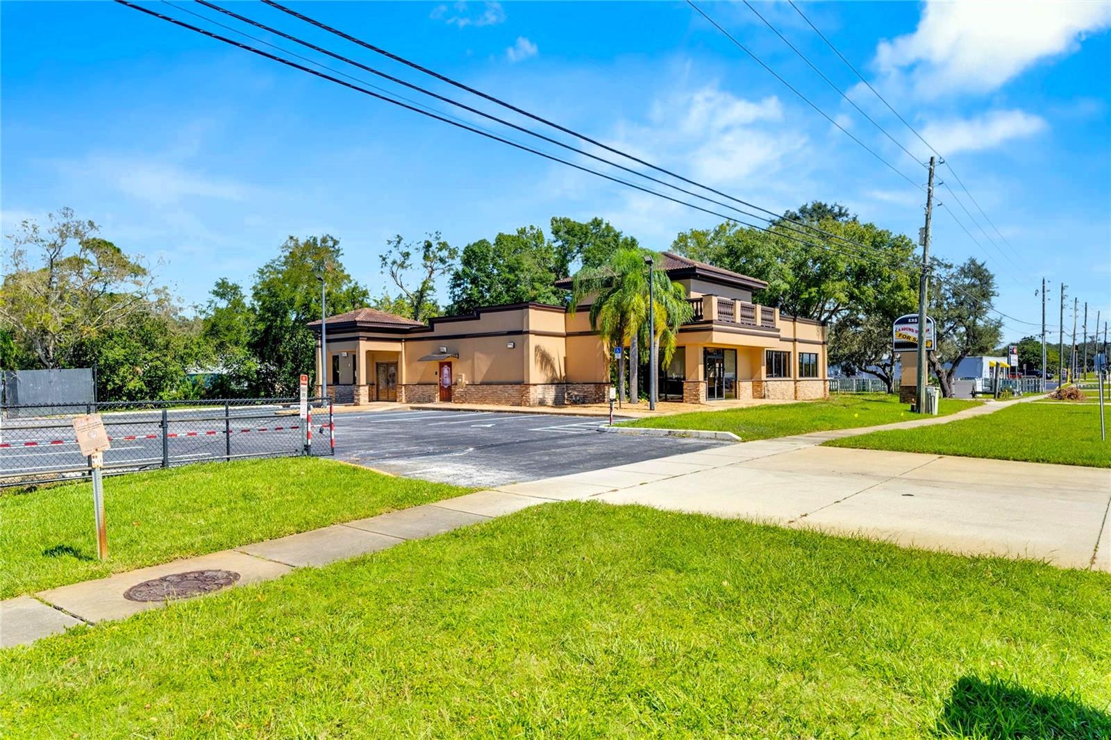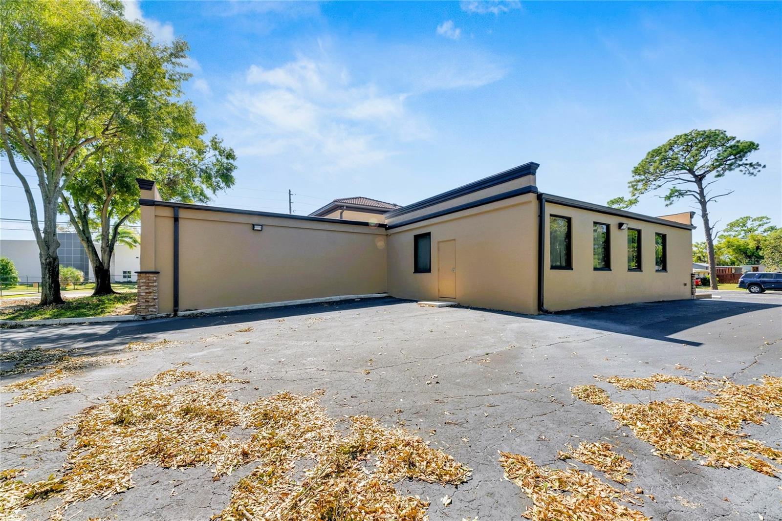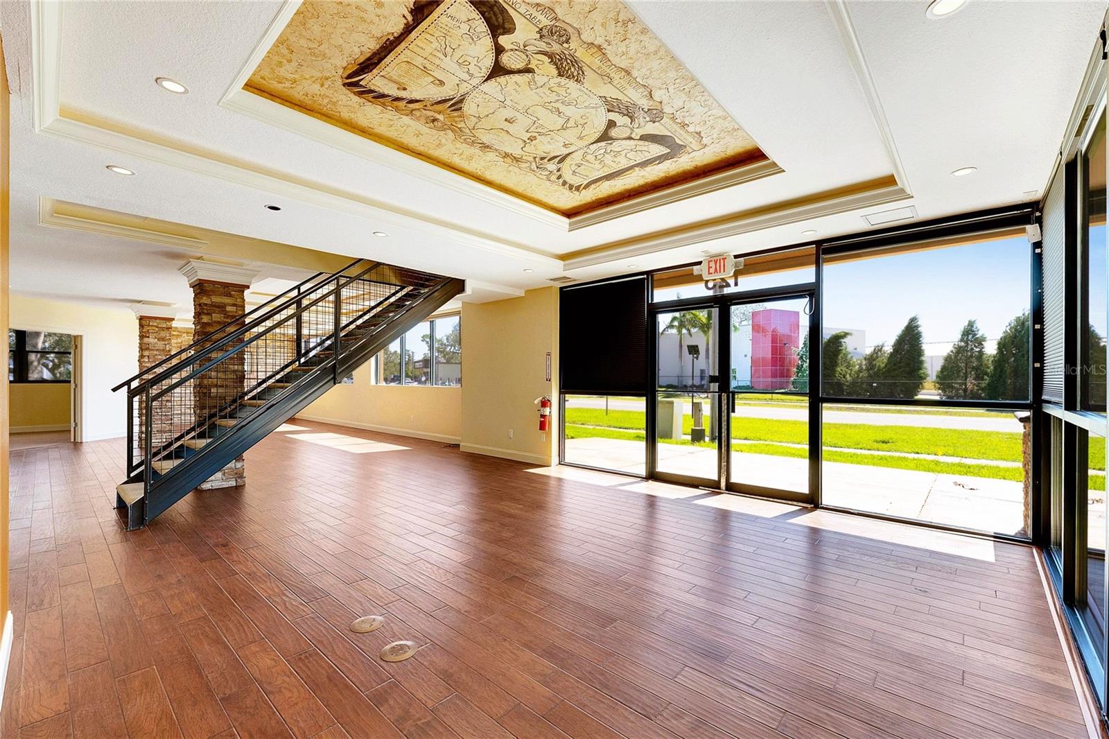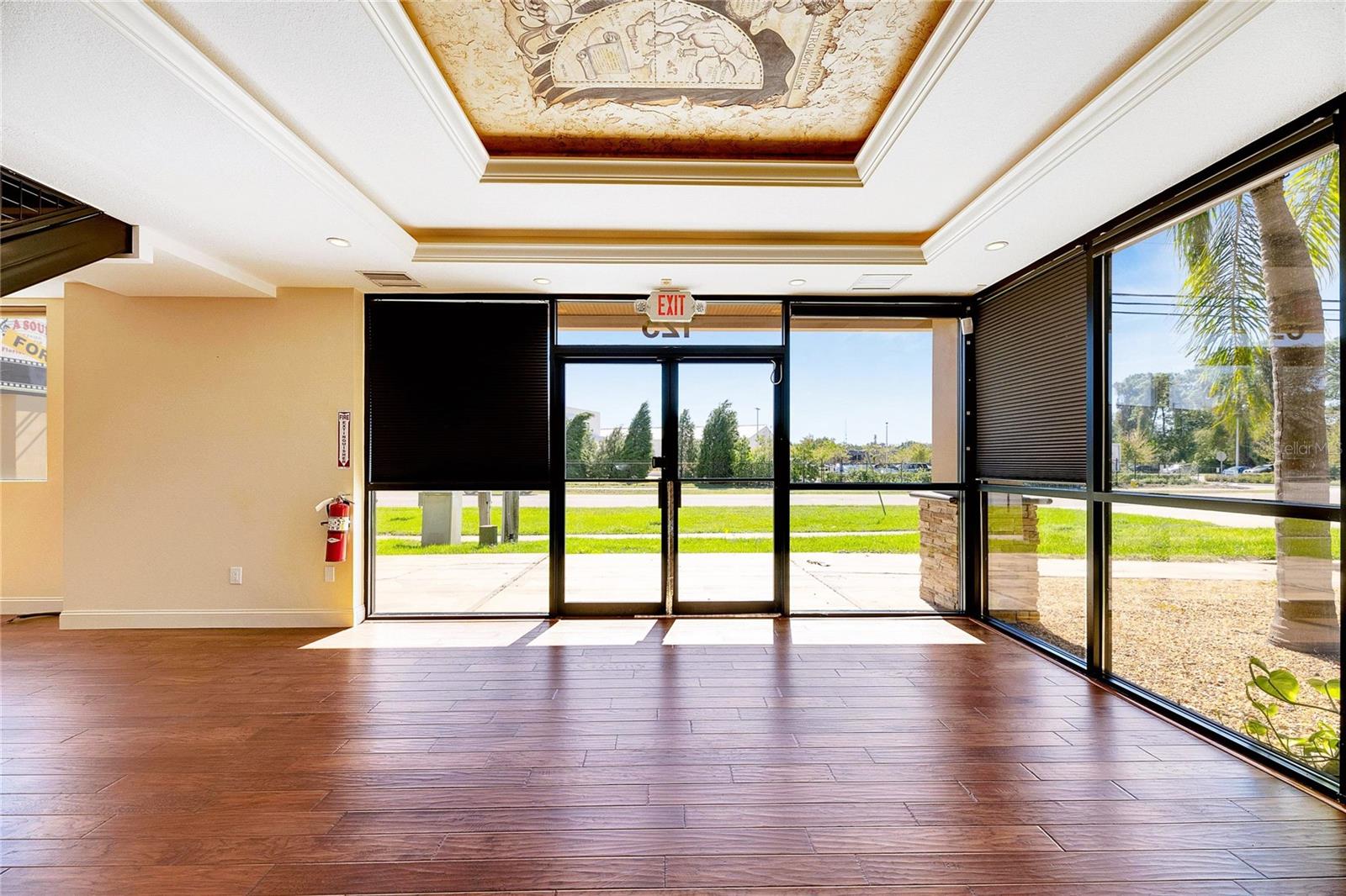 This prime commercial/mixed-use property, located in a high-traffic area with excellent exposure, offers endless business opportunities and retail activities. Built in 1984 as a bank on four small lots (42-45), creating a large 0.83-acre space (200' x 182'), the building has been fully renovated. The asphalt parking lot provides over 25 parking spaces. The building's exterior was recently painted, and the windows were serviced or replaced. Features include a waterfall at the front entrance and a west-side patio for employee breaks. The property is connected to public sewer, water, and electricity, with well water used for irrigation. The building is divided into two separate workspaces. Ground Level Front Showroom Space: A kitchen/breakroom/dining area with ceramic tile floors, granite countertops, custom cabinets, a raised granite island, chandelier, and coffered ceilings with crown molding and ambient lighting. A reception area/entry features coffered ceilings, crown molding, ambient lighting, and a custom mural. The showroom and display area have an open floor plan, coffered ceilings, crown molding, wood flooring, and ambient lighting. The main/executive office offers space for multiple workstations, automated blinds/shades, and pre-wired connections for TVs and sound. A large walk-in vault provides space for additional workstations or secure storage. The extra-large presentation/training room features a 3-tiered layout, coffered ceilings, pre-wiring for a projector, seating for 25+, a 156" Cinecurve projection screen, and wood flooring. This room can be modified into an open floor plan by removing the tiered stage and adjoining wall. Another presentation/conference room, originally the bank's safety deposit box area, seats 12+. The 3-tiered stage can be removed to create a single-level floor, making it ideal for an executive office or secure storage area. Back Space: Separate entry/exit and alarm partition make this area perfect for rental income or secondary offices. Features include six separate offices with doors and windows, pre-wiring for internet/data, a large common area, a kitchenette, and a patio. Second Level: Accessed via an interior stairwell, the second level includes a large executive office or bedroom, a full bathroom, and a walk-in closet/laundry area. Storage/Service Shed: Contains irrigation control, ample storage cabinets, and well/pump controls for the irrigation system.