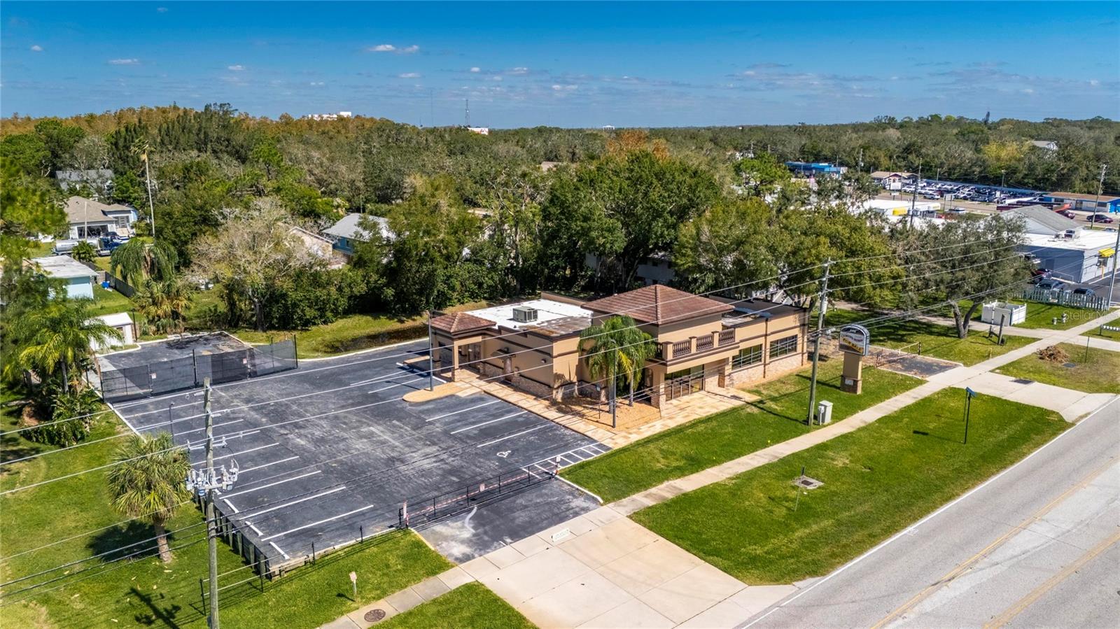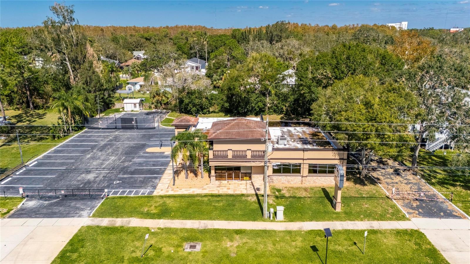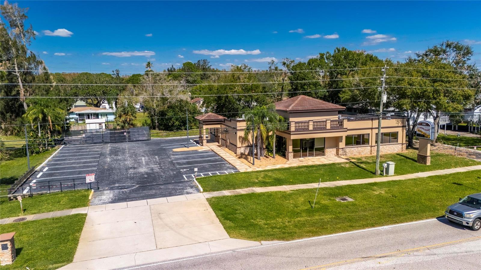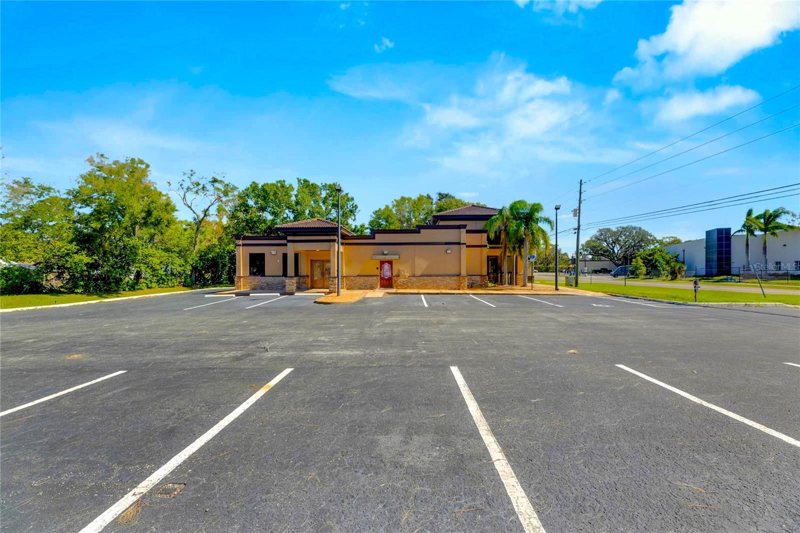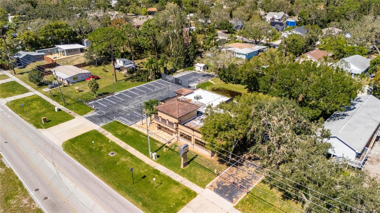 This prime commercial/mixed-use property, located in a high-traffic area with excellent exposure, offers endless business opportunities and retail activities. Built in 1984 as a bank on four small lots (42-45), creating a large 0.83-acre space (200' x 182'), the building has been fully renovated. The asphalt parking lot provides over 25 parking spaces. The building's exterior was recently painted, and the windows were serviced or replaced. Features include a waterfall at the front entrance and a west-side patio for employee breaks. The property is connected to public sewer, water, and electricity, with well water used for irrigation. The building is divided into two separate workspaces. Ground Level Front Showroom Space: A kitchen/breakroom/dining area with ceramic tile floors, granite countertops, custom cabinets, a raised granite island, chandelier, and coffered ceilings with crown molding and ambient lighting. A reception area/entry features coffered ceilings, crown molding, ambient lighting, and a custom mural. The showroom and display area have an open floor plan, coffered ceilings, crown molding, wood flooring, and ambient lighting. The main/executive office offers space for multiple workstations, automated blinds/shades, and pre-wired connections for TVs and sound. A large walk-in vault provides space for additional workstations or secure storage. The extra-large presentation/training room features a 3-tiered layout, coffered ceilings, pre-wiring for a projector, seating for 25+, a 156" Cinecurve projection screen, and wood flooring. This room can be modified into an open floor plan by removing the tiered stage and adjoining wall. Another presentation/conference room, originally the bank's safety deposit box area, seats 12+. The 3-tiered stage can be removed to create a single-level floor, making it ideal for an executive office or secure storage area. Back Space: Separate entry/exit and alarm partition make this area perfect for rental income or secondary offices. Features include six separate offices with doors and windows, pre-wiring for internet/data, a large common area, a kitchenette, and a patio. Second Level: Accessed via an interior stairwell, the second level includes a large executive office or bedroom, a full bathroom, and a walk-in closet/laundry area. Storage/Service Shed: Contains irrigation control, ample storage cabinets, and well/pump controls for the irrigation system.
