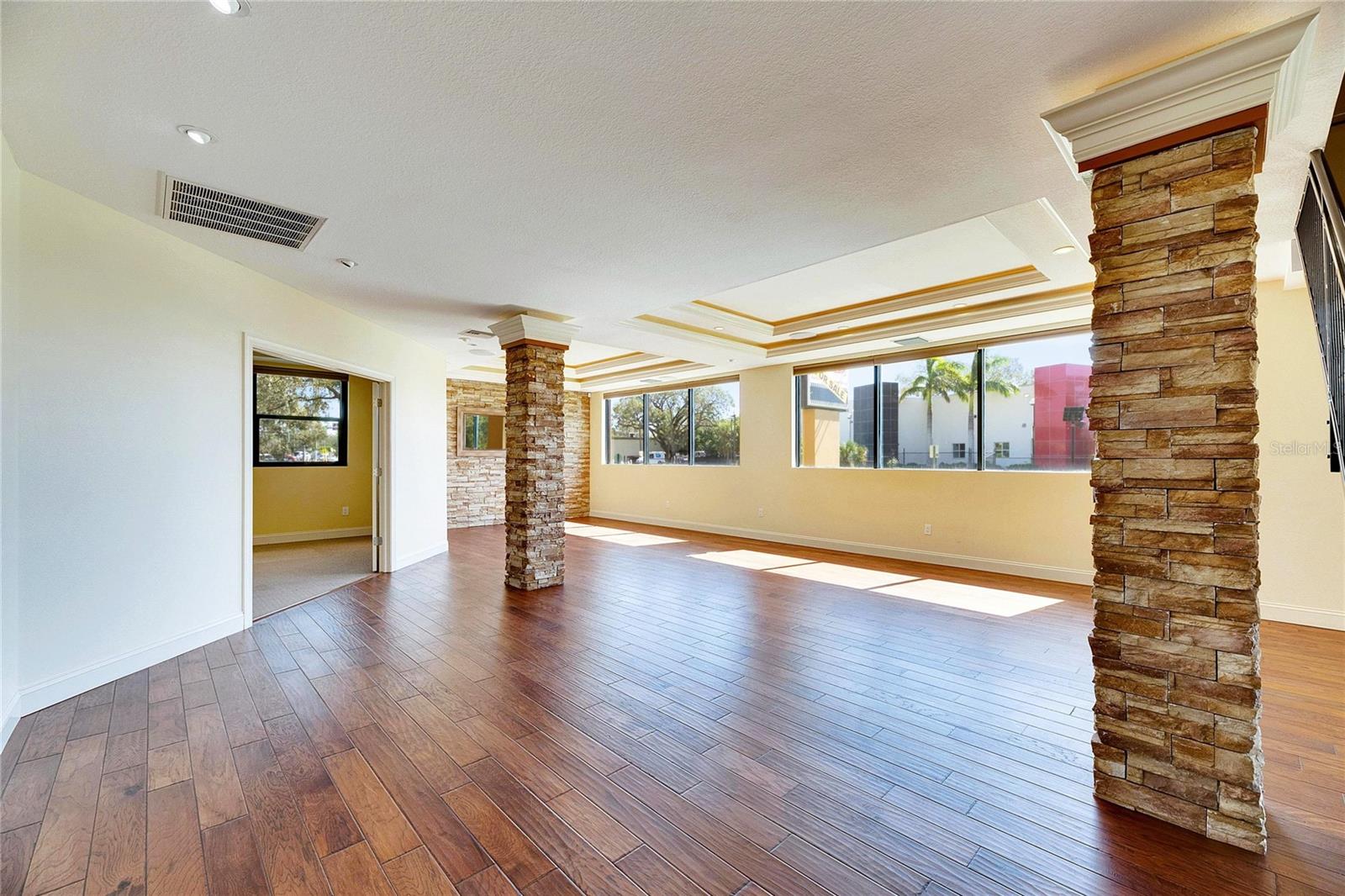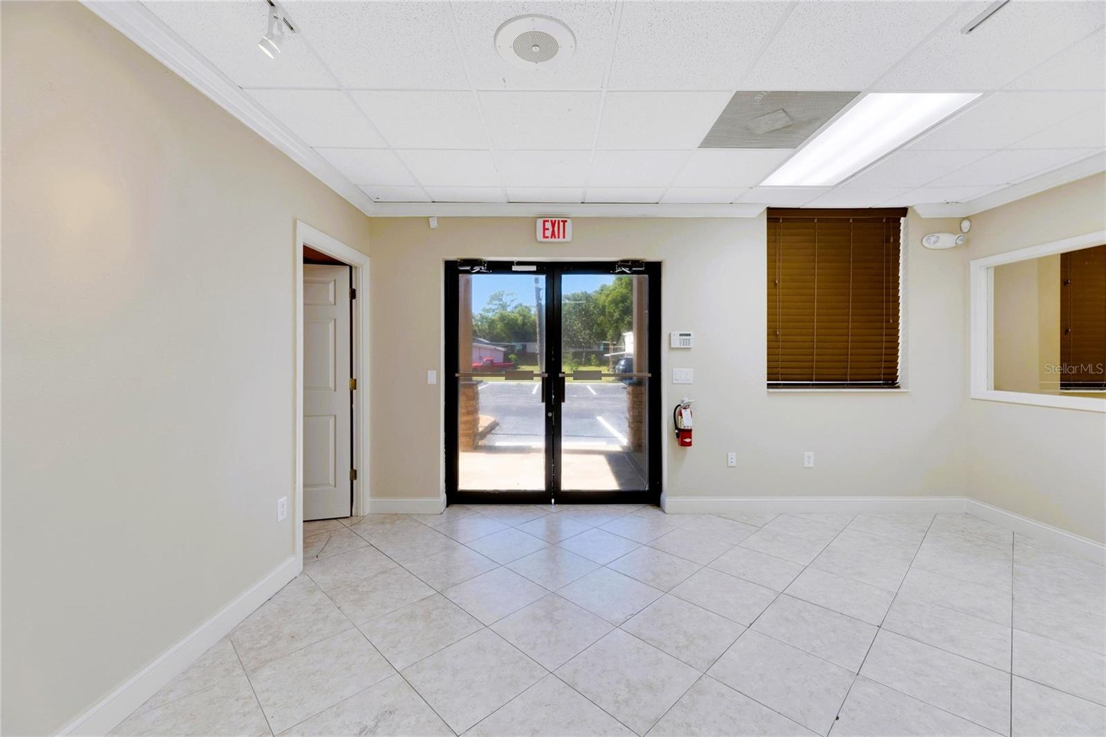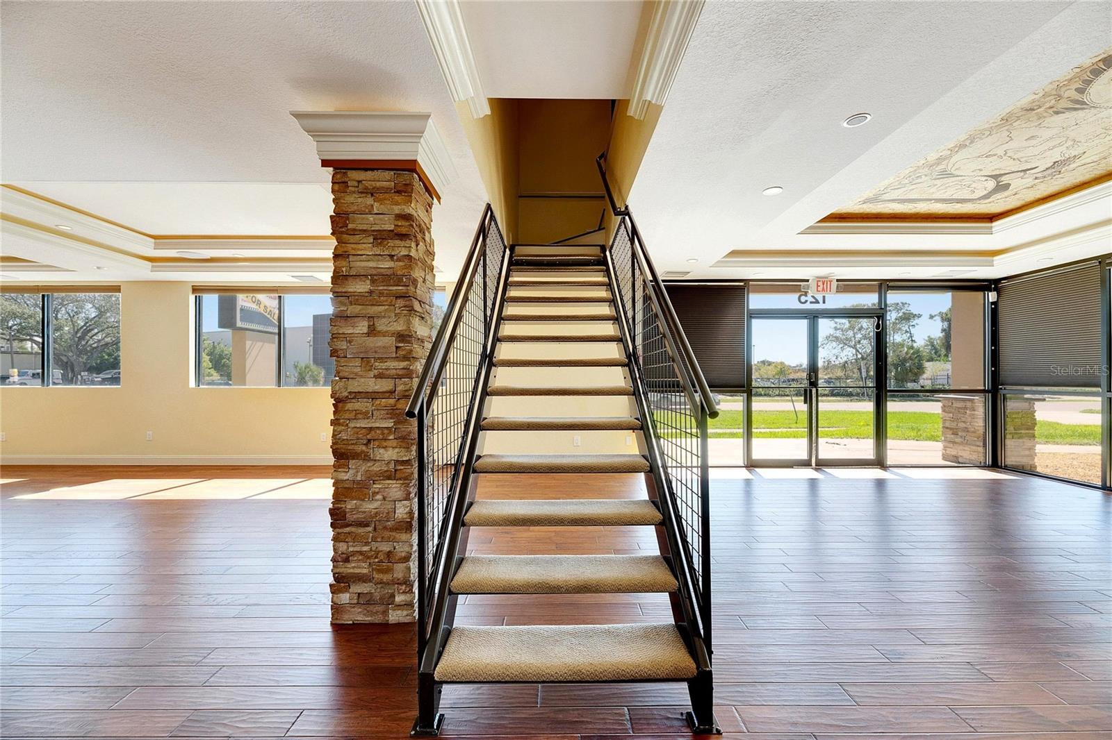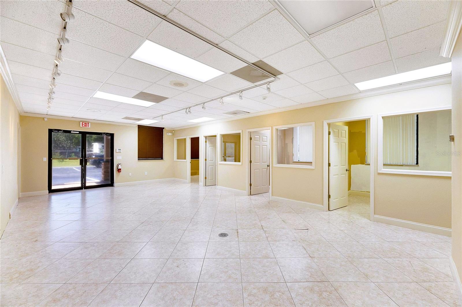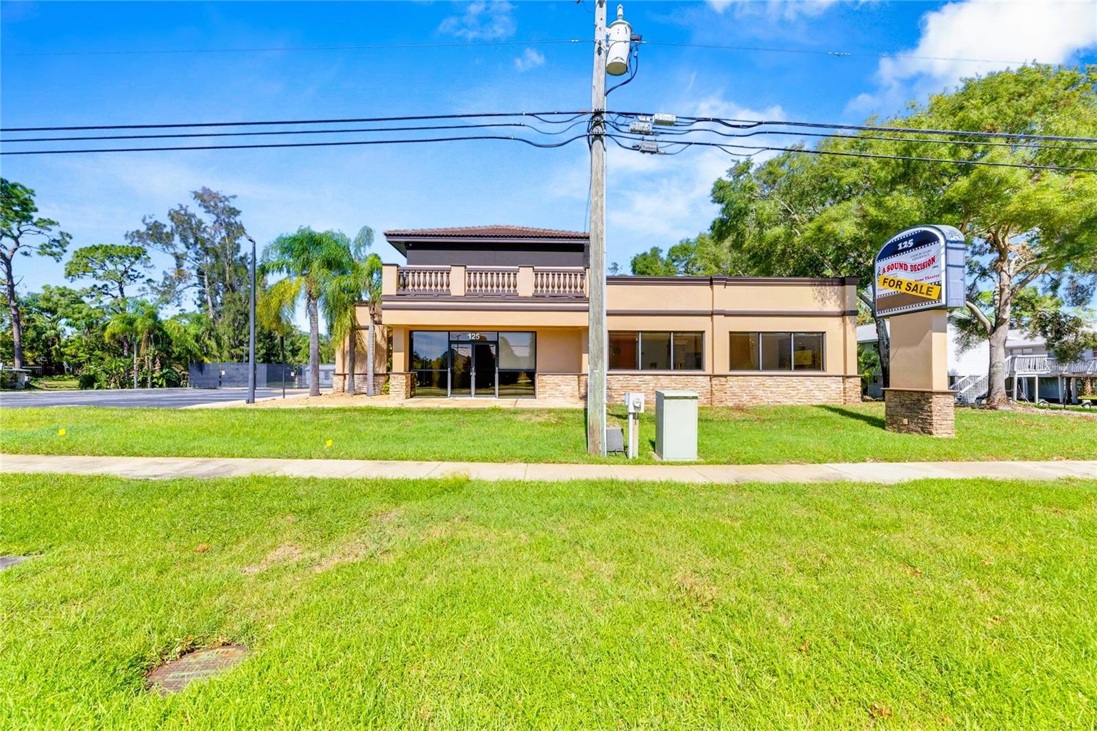 This prime commercial/mixed-use property, located in a high-traffic area with excellent exposure, offers endless business opportunities and retail activities. Built in 1984 as a bank on four small lots (42-45), creating a large 0.83-acre space (200' x 182'), the building has been fully renovated. The asphalt parking lot provides over 25 parking spaces. The building's exterior was recently painted, and the windows were serviced or replaced. Features include a waterfall at the front entrance and a west-side patio for employee breaks. The property is connected to public sewer, water, and electricity, with well water used for irrigation. The building is divided into two separate workspaces. Ground Level Front Showroom Space: A kitchen/breakroom/dining area with ceramic tile floors, granite countertops, custom cabinets, a raised granite island, chandelier, and coffered ceilings with crown molding and ambient lighting. A reception area/entry features coffered ceilings, crown molding, ambient lighting, and a custom mural. The showroom and display area have an open floor plan, coffered ceilings, crown molding, wood flooring, and ambient lighting. The main/executive office offers space for multiple workstations, automated blinds/shades, and pre-wired connections for TVs and sound. A large walk-in vault provides space for additional workstations or secure storage. The extra-large presentation/training room features a 3-tiered layout, coffered ceilings, pre-wiring for a projector, seating for 25+, a 156" Cinecurve projection screen, and wood flooring. This room can be modified into an open floor plan by removing the tiered stage and adjoining wall. Another presentation/conference room, originally the bank's safety deposit box area, seats 12+. The 3-tiered stage can be removed to create a single-level floor, making it ideal for an executive office or secure storage area. Back Space: Separate entry/exit and alarm partition make this area perfect for rental income or secondary offices. Features include six separate offices with doors and windows, pre-wiring for internet/data, a large common area, a kitchenette, and a patio. Second Level: Accessed via an interior stairwell, the second level includes a large executive office or bedroom, a full bathroom, and a walk-in closet/laundry area. Storage/Service Shed: Contains irrigation control, ample storage cabinets, and well/pump controls for the irrigation system.