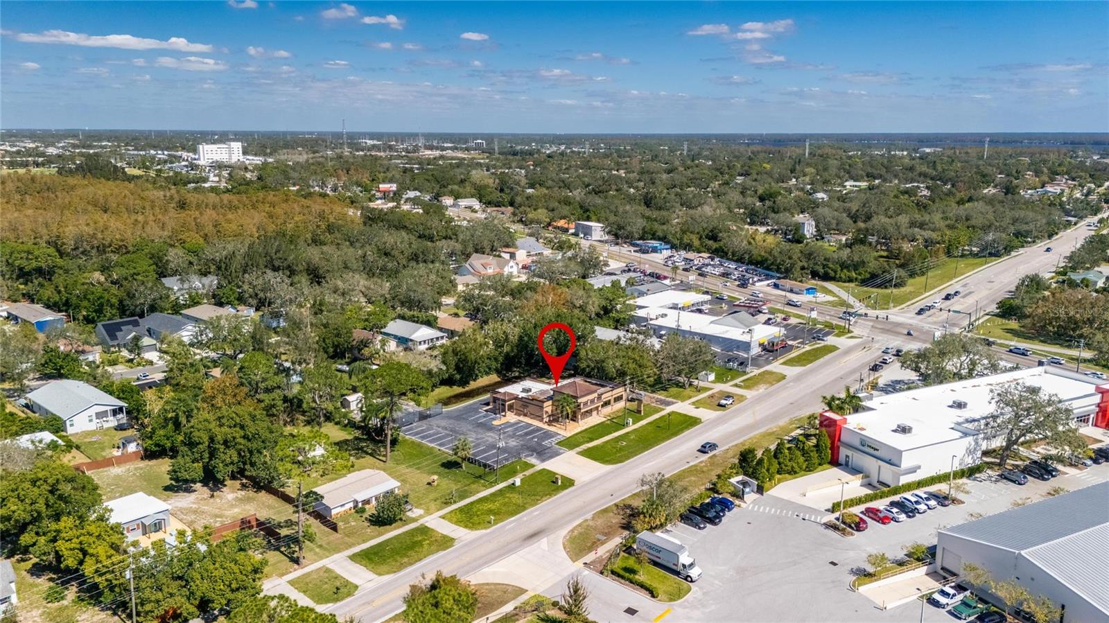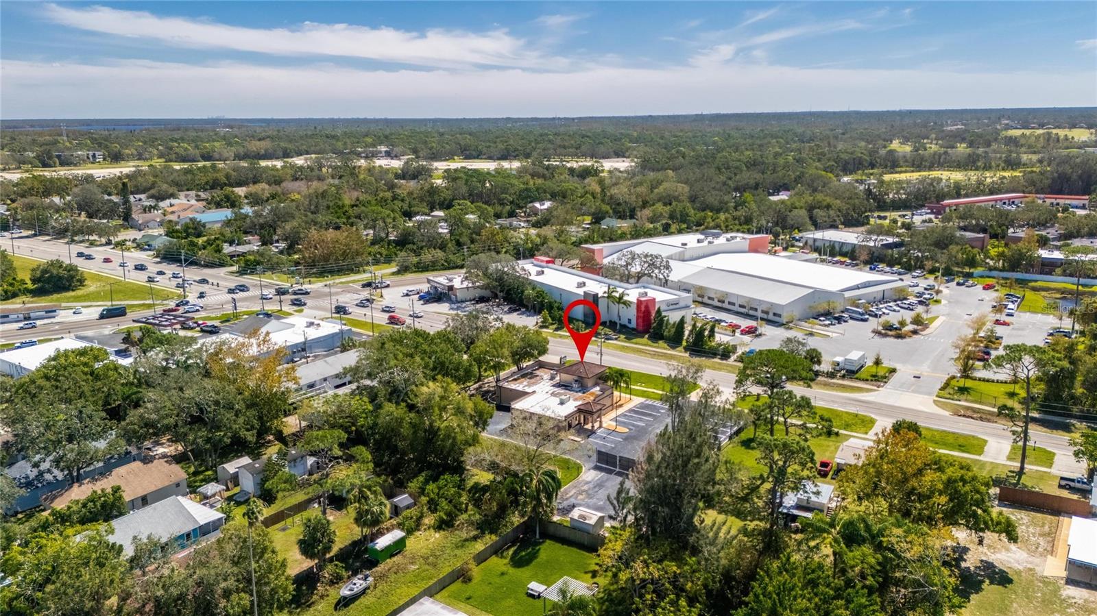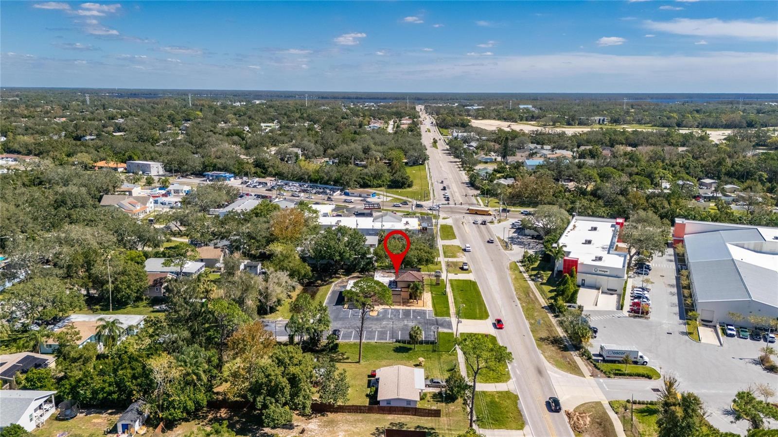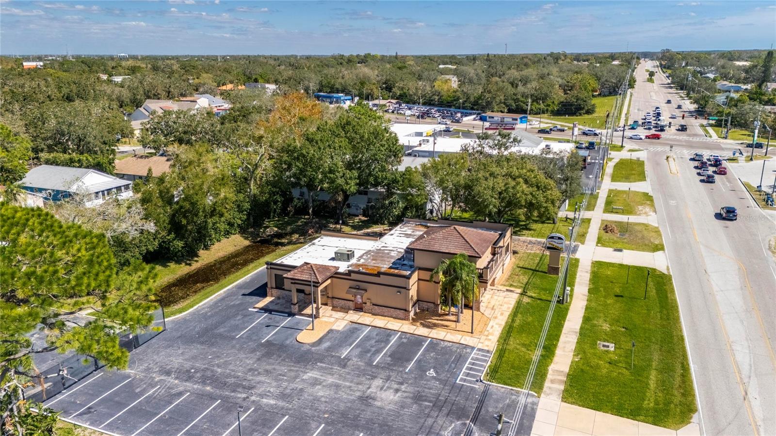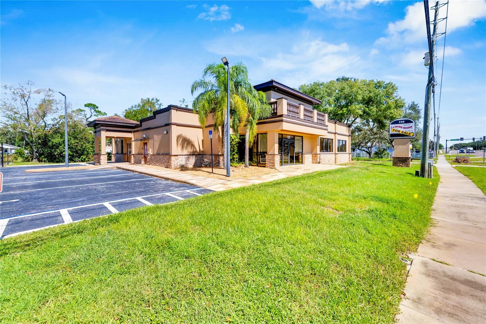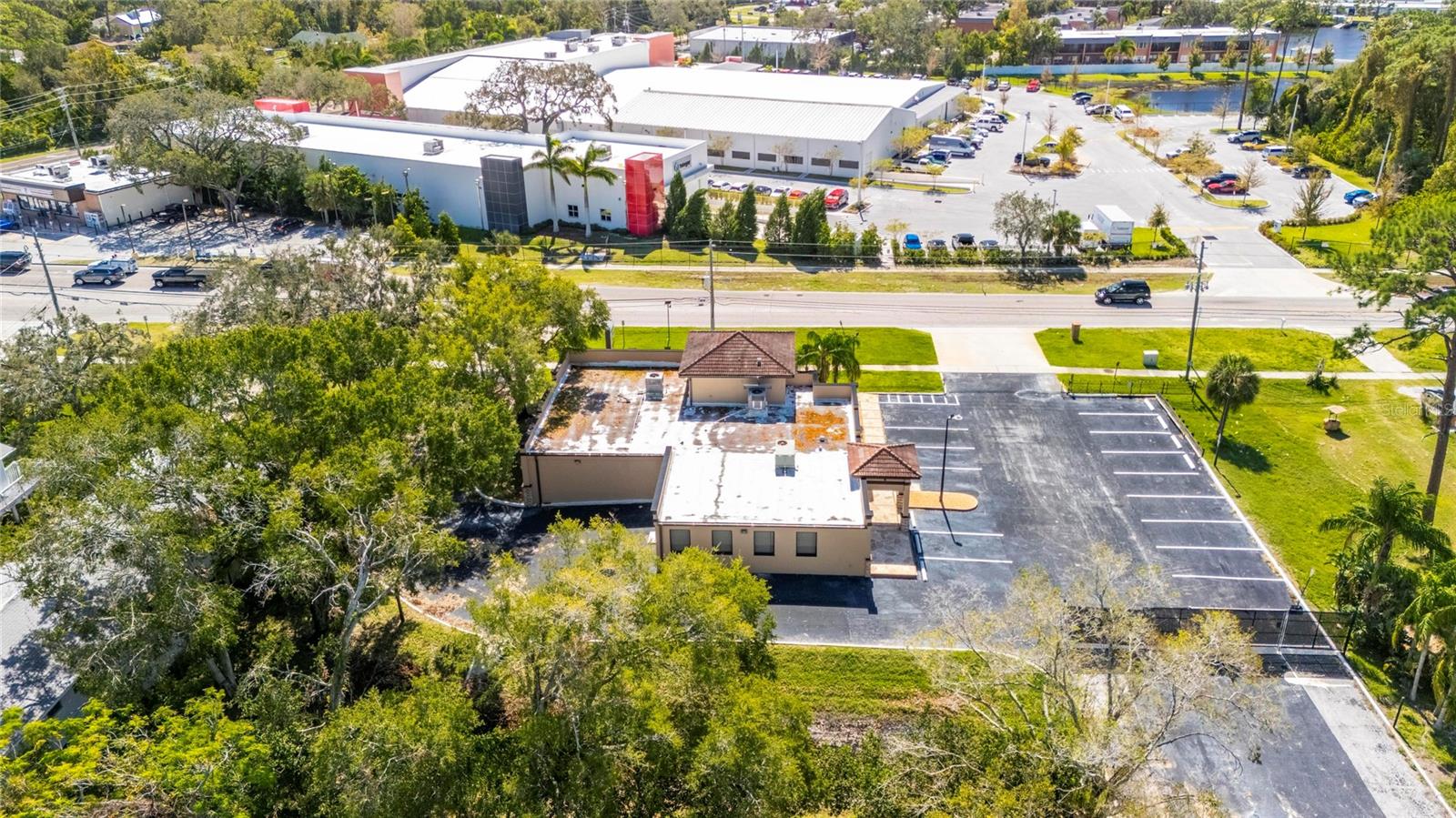 This prime commercial/mixed-use property, located in a high-traffic area with excellent exposure, offers endless business opportunities and retail activities. Built in 1984 as a bank on four small lots (42-45), creating a large 0.83-acre space (200' x 182'), the building has been fully renovated. The asphalt parking lot provides over 25 parking spaces. The building's exterior was recently painted, and the windows were serviced or replaced. Features include a waterfall at the front entrance and a west-side patio for employee breaks. The property is connected to public sewer, water, and electricity, with well water used for irrigation. The building is divided into two separate workspaces. Ground Level Front Showroom Space: A kitchen/breakroom/dining area with ceramic tile floors, granite countertops, custom cabinets, a raised granite island, chandelier, and coffered ceilings with crown molding and ambient lighting. A reception area/entry features coffered ceilings, crown molding, ambient lighting, and a custom mural. The showroom and display area have an open floor plan, coffered ceilings, crown molding, wood flooring, and ambient lighting. The main/executive office offers space for multiple workstations, automated blinds/shades, and pre-wired connections for TVs and sound. A large walk-in vault provides space for additional workstations or secure storage. The extra-large presentation/training room features a 3-tiered layout, coffered ceilings, pre-wiring for a projector, seating for 25+, a 156" Cinecurve projection screen, and wood flooring. This room can be modified into an open floor plan by removing the tiered stage and adjoining wall. Another presentation/conference room, originally the bank's safety deposit box area, seats 12+. The 3-tiered stage can be removed to create a single-level floor, making it ideal for an executive office or secure storage area. Back Space: Separate entry/exit and alarm partition make this area perfect for rental income or secondary offices. Features include six separate offices with doors and windows, pre-wiring for internet/data, a large common area, a kitchenette, and a patio. Second Level: Accessed via an interior stairwell, the second level includes a large executive office or bedroom, a full bathroom, and a walk-in closet/laundry area. Storage/Service Shed: Contains irrigation control, ample storage cabinets, and well/pump controls for the irrigation system.